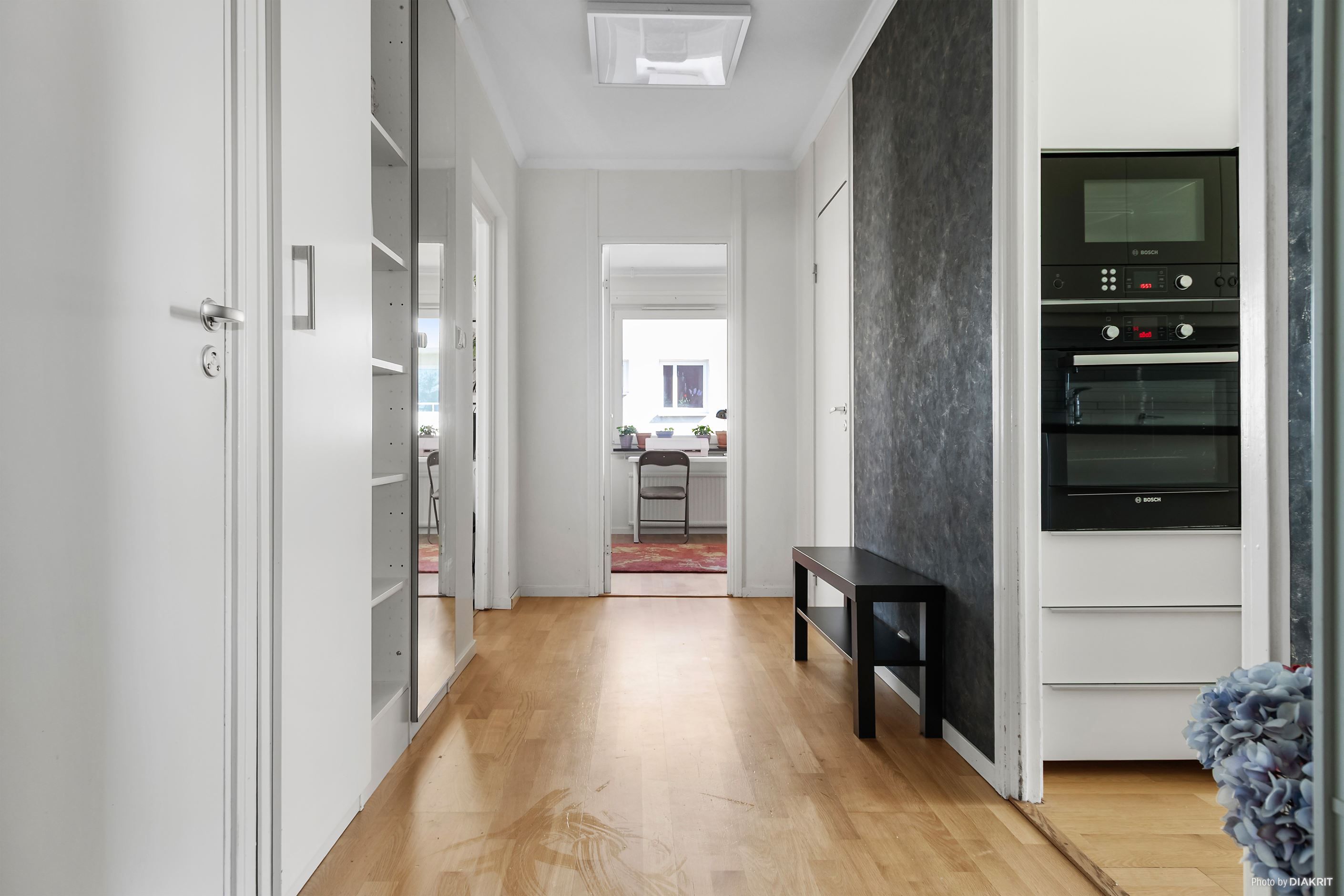 Praktisk hall med plats för avhängning vid entrén, och gott om förvaringsutrymme i garderober samt klädkammare.