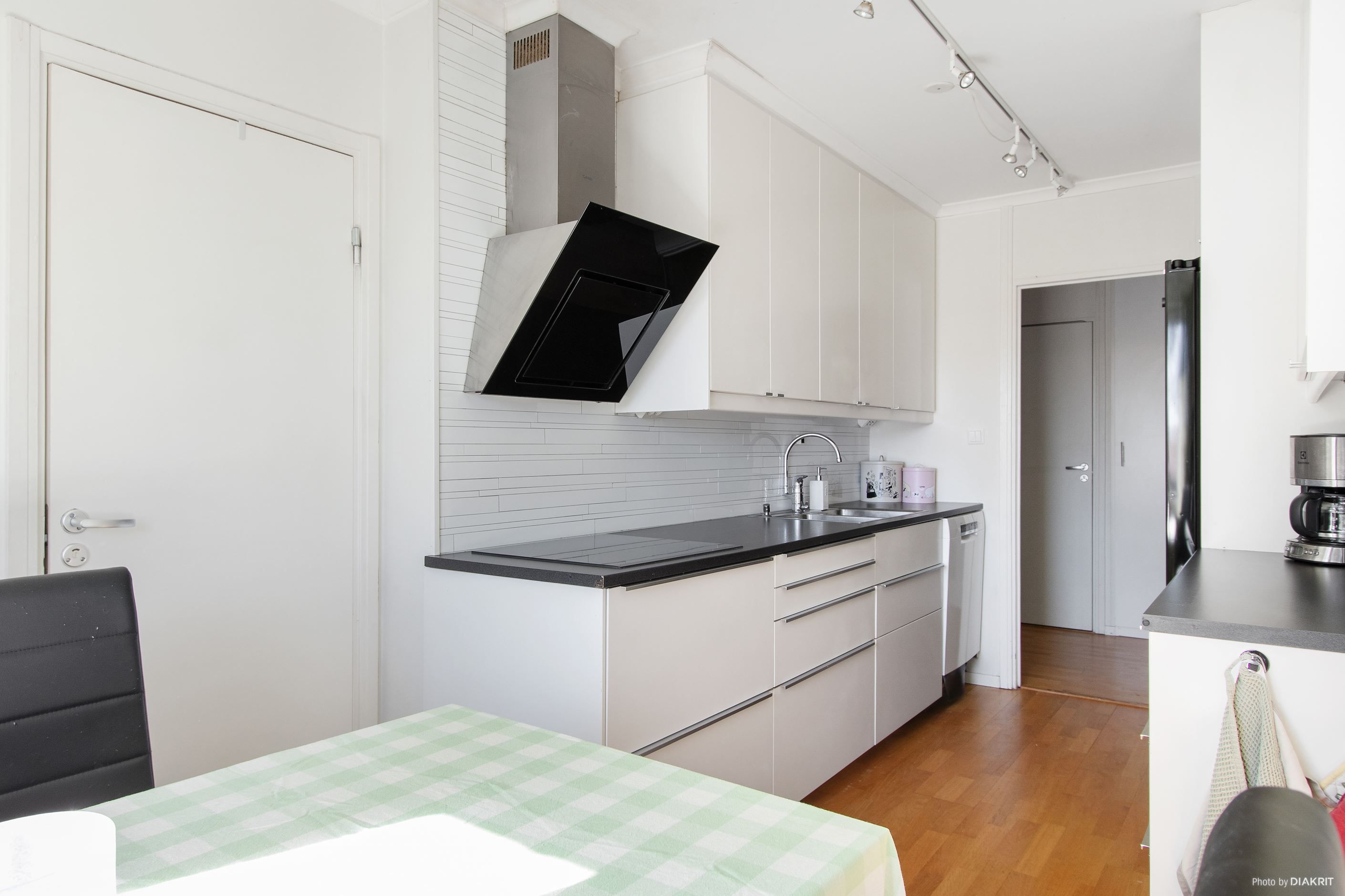 Modernt kök med gott om arbetsyta och förvaring. Köket har matplats vid fönster med plats för 4-6 personer. Moderna vitvaror med häll, inbyggd ugn, inbyggd mikrovågsugn, kolfilterfläkt, diskmaskin, samt kyl och frys.