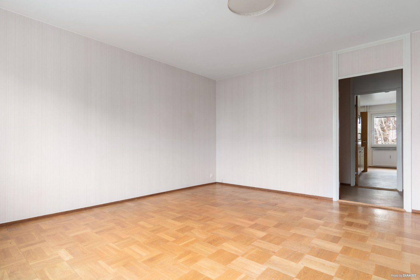 Stort vardagsrum med parkettgolv och gott om plats för soffgrupp och tv-möblemang.