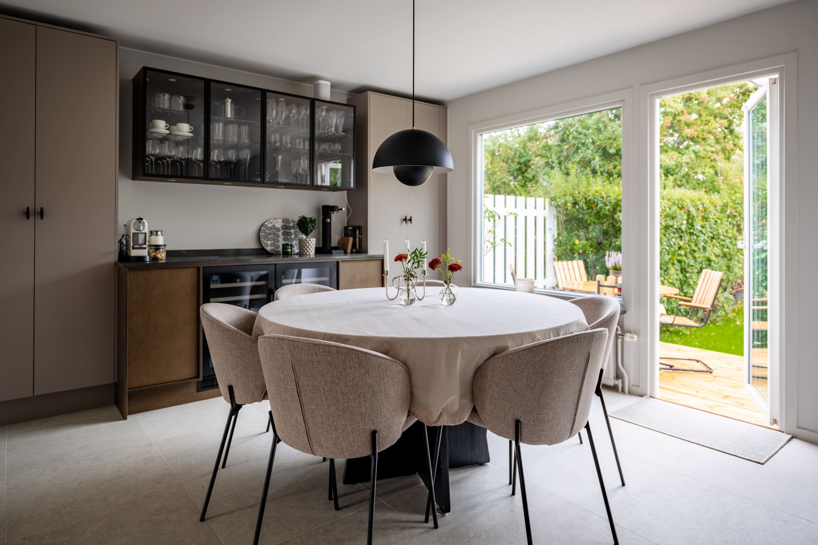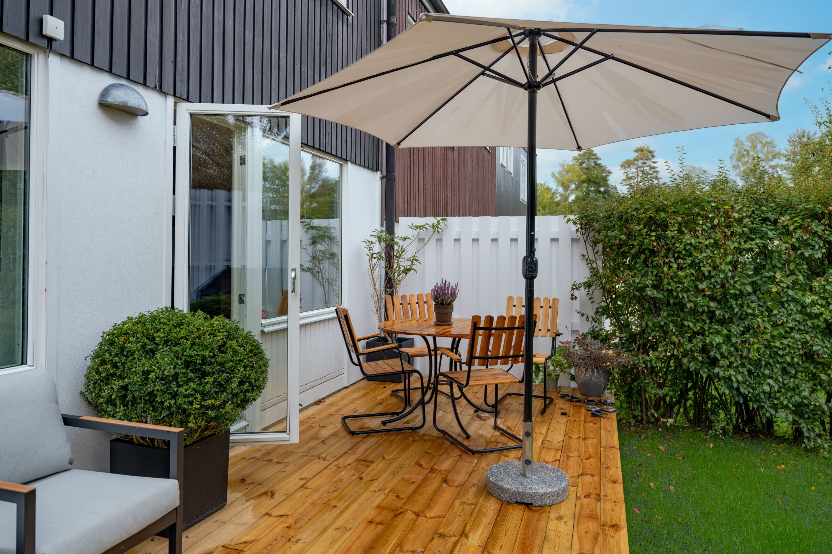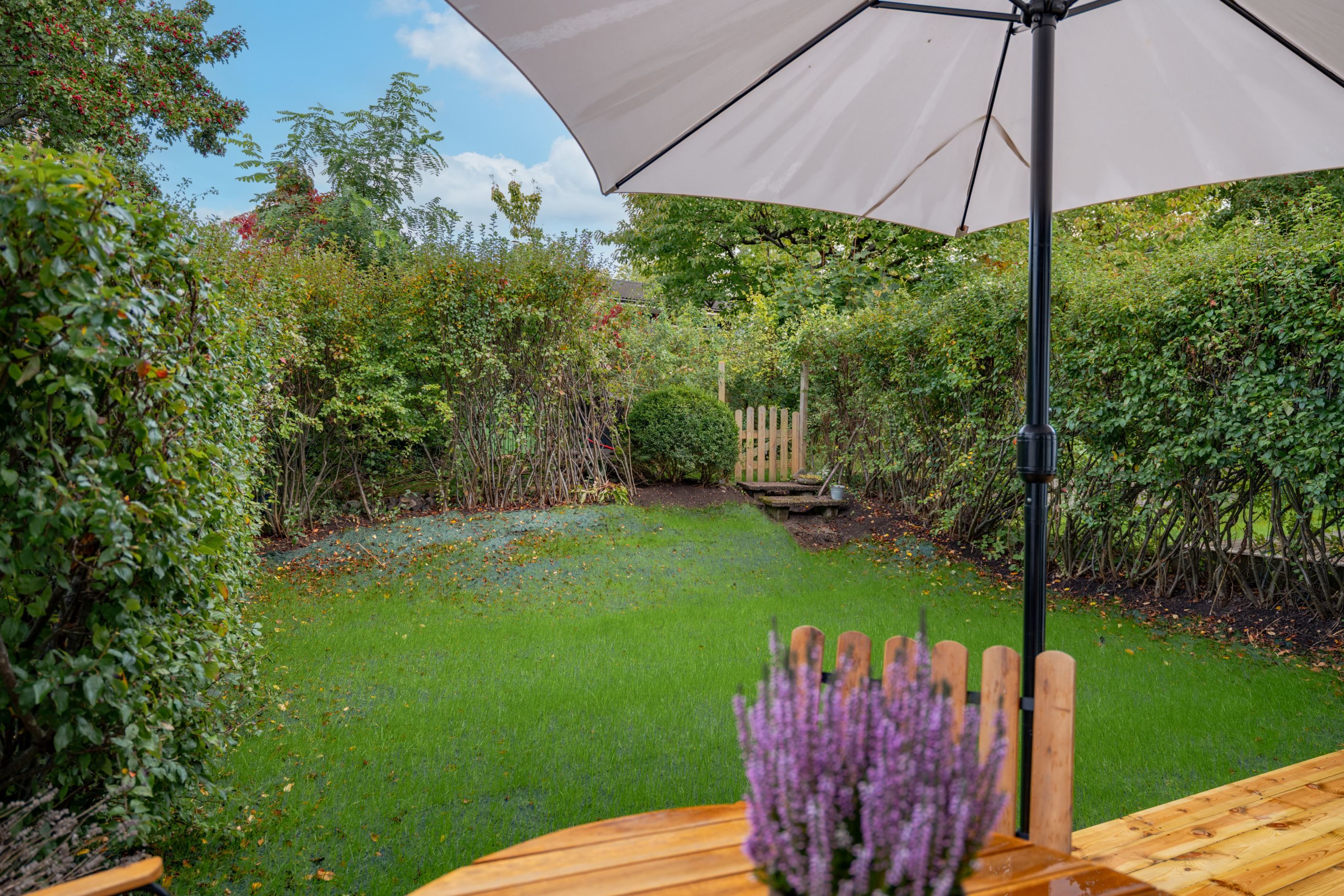 Härifrån når du direkt ut till en uteplats samt den fina lilla trädgården – en grön oas med plats för lek, odling eller avkoppling.