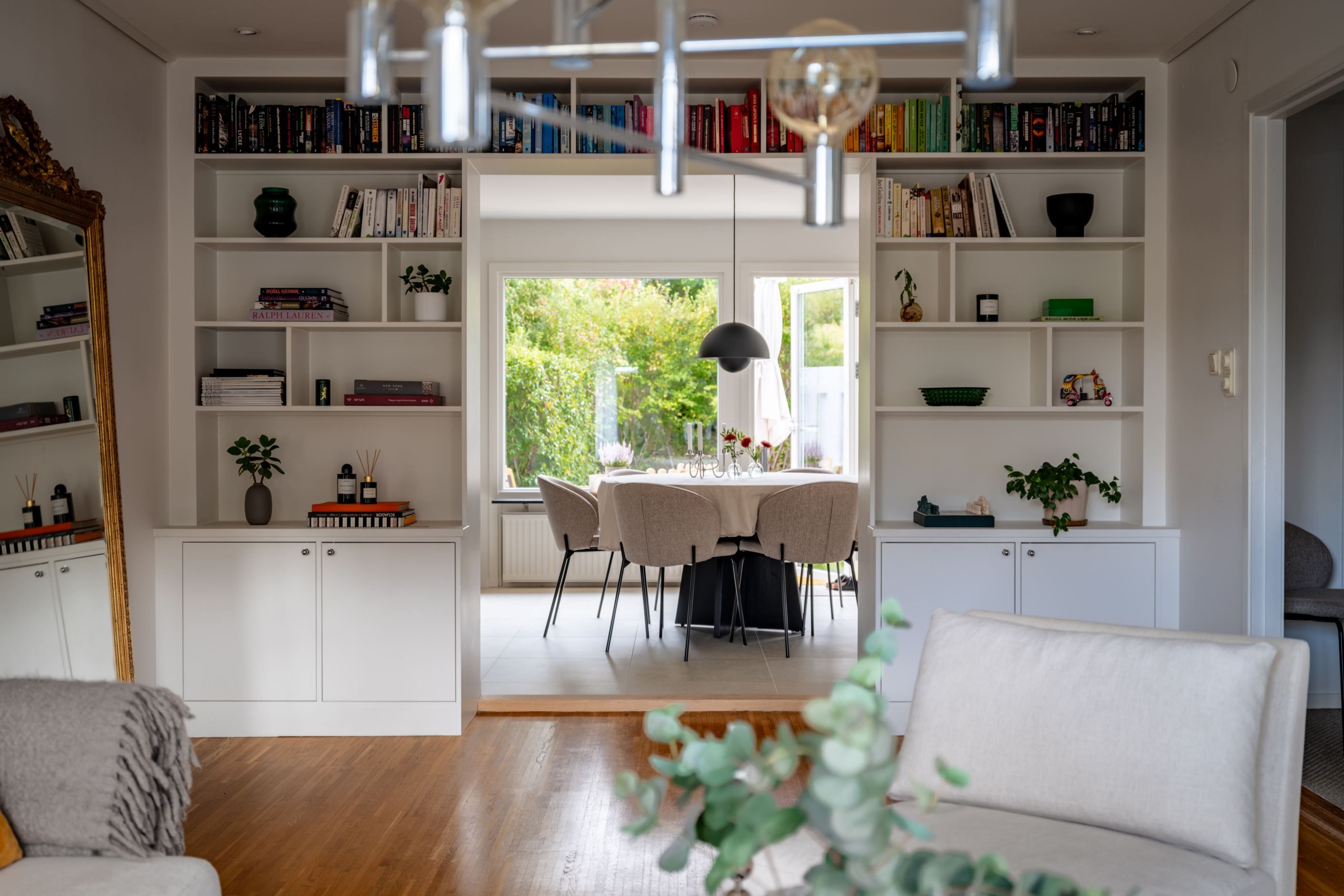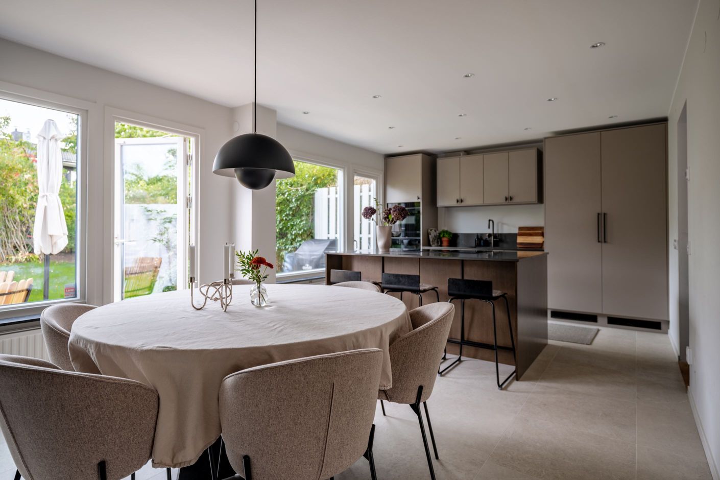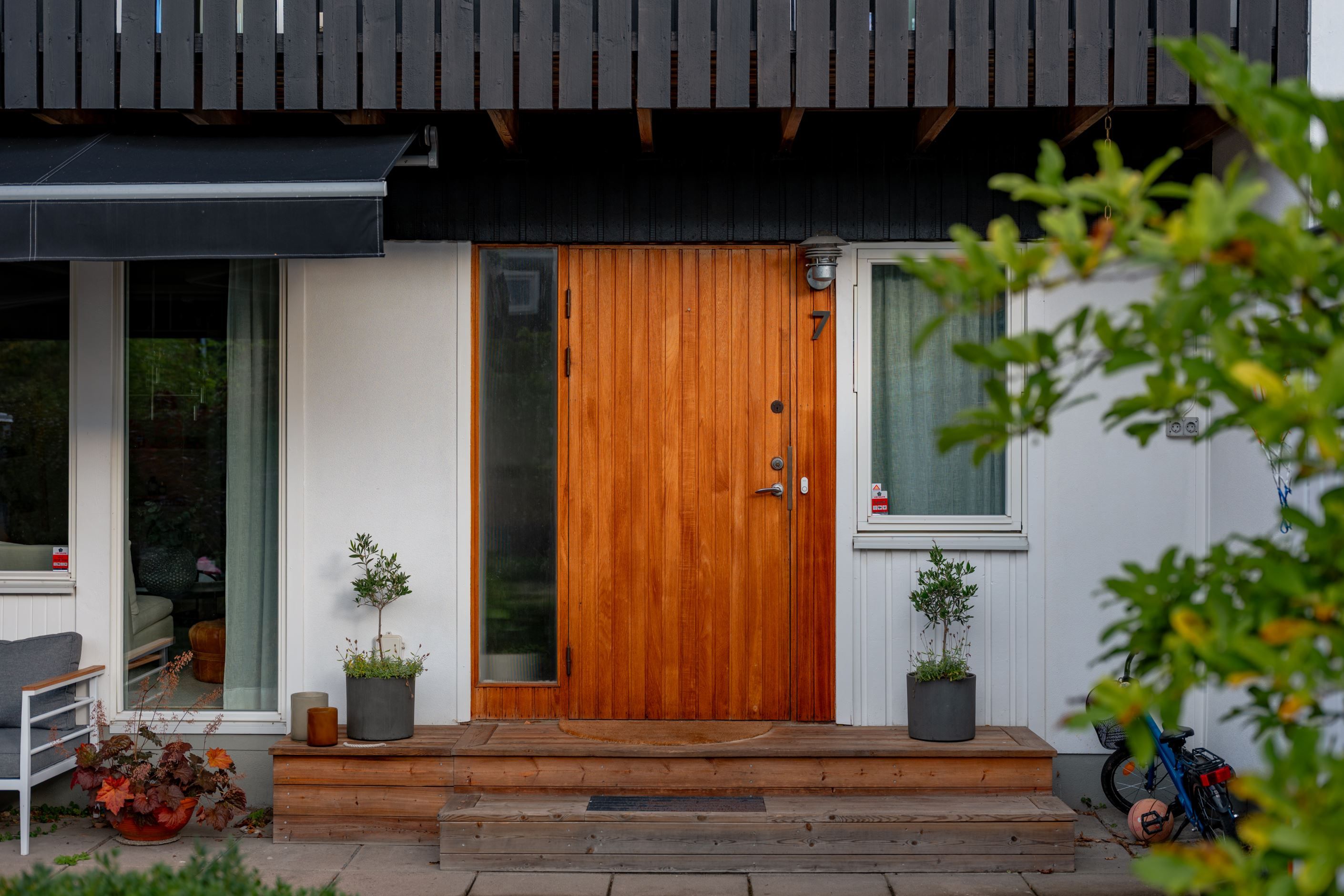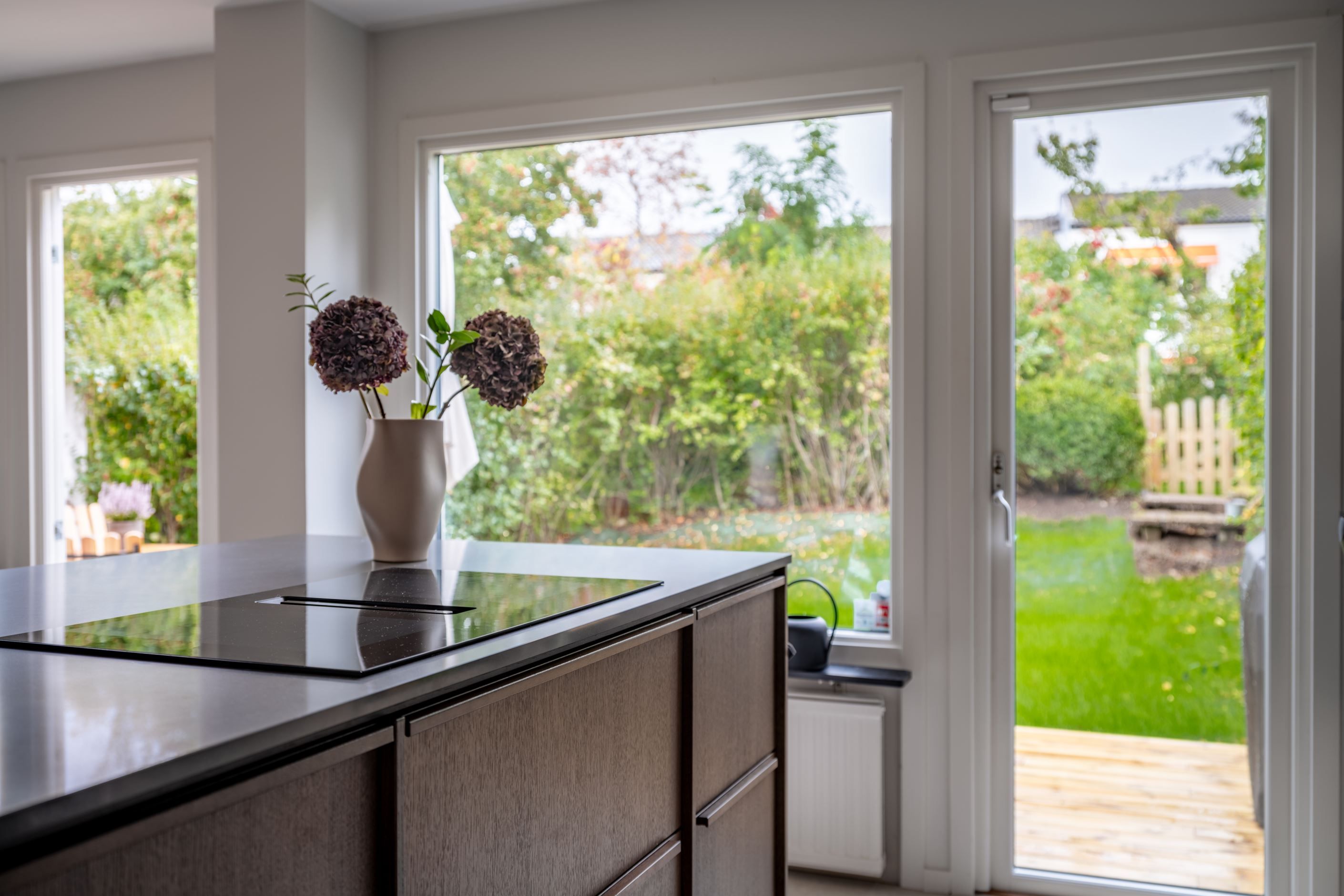 Härifrån når du direkt ut till en uteplats samt den fina lilla trädgården – en grön oas med plats för lek, odling eller avkoppling.