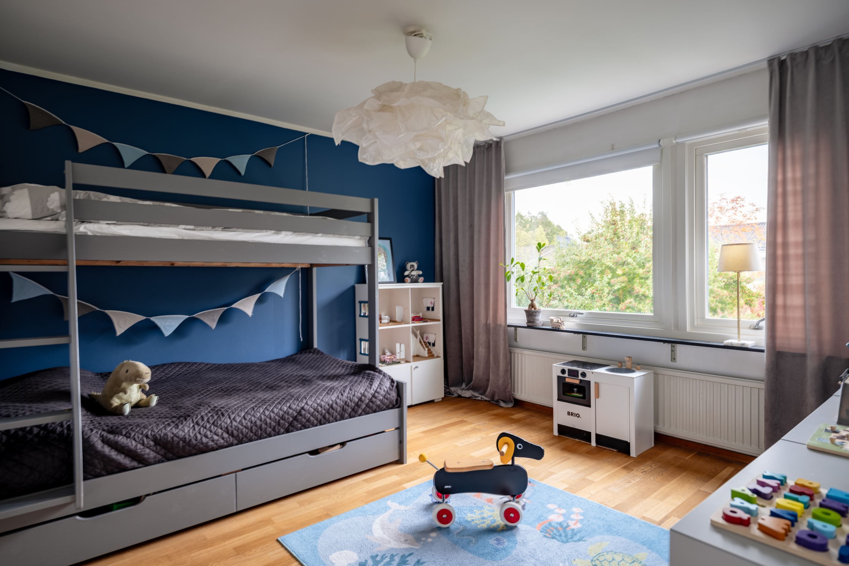 Bostaden erbjuder tre rymliga sovrum samlade på samma plan – en praktisk lösning för familjelivet. Här finner du även två rejäla klädkammare samt ett helkaklat badrum.