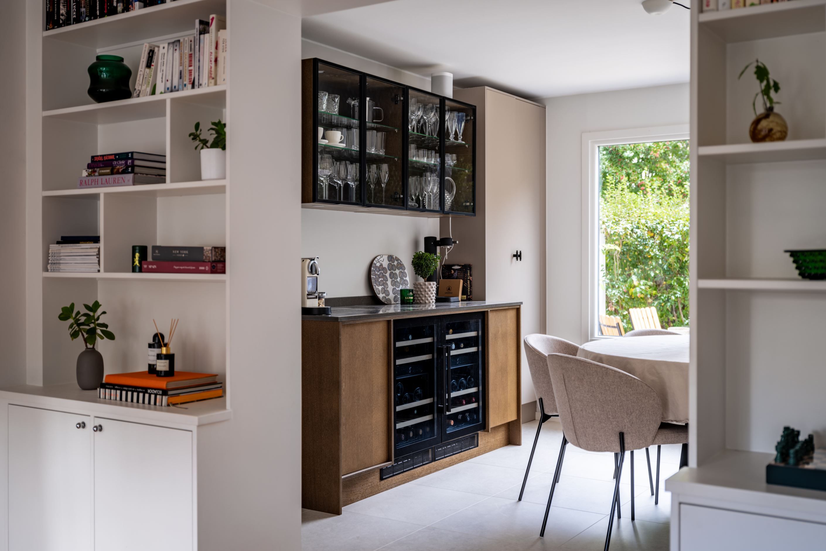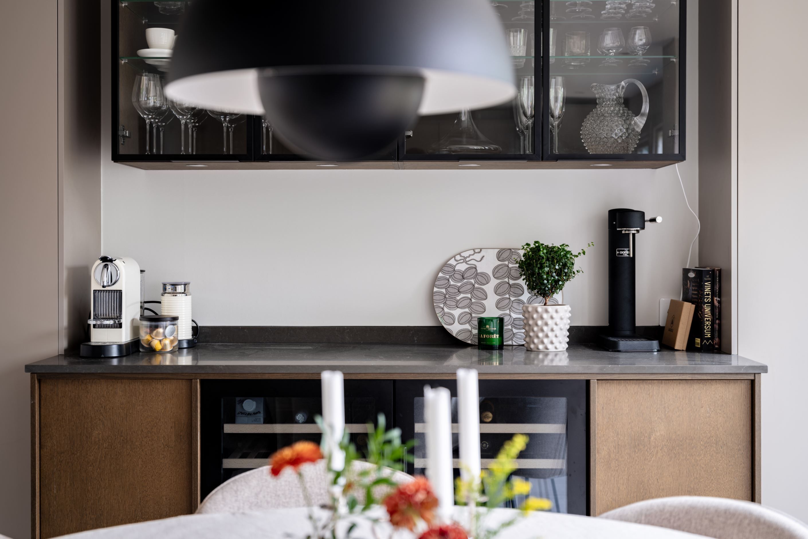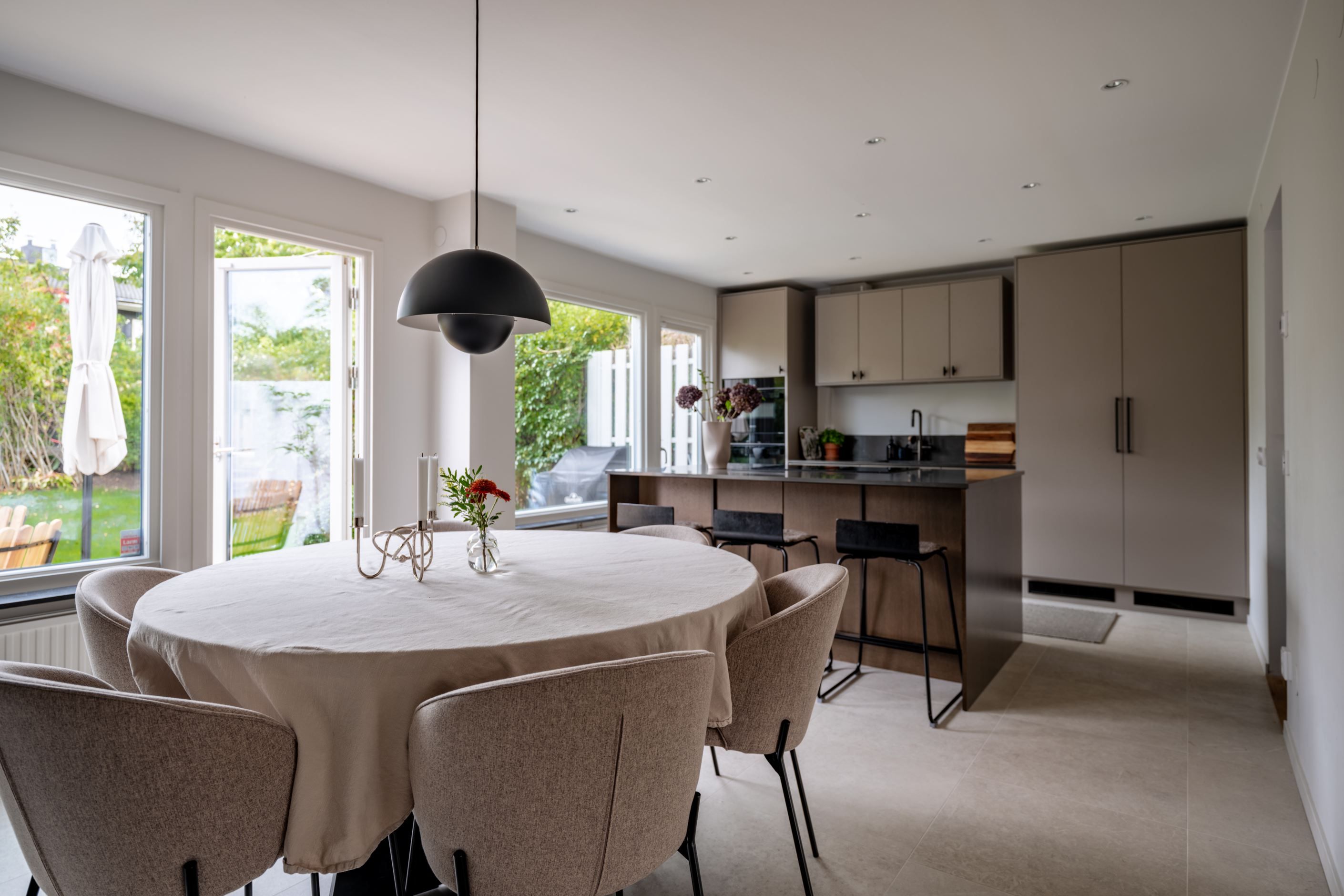 Det stora, öppna och moderna köket är mycket trivsamt och har gott om förvaringsmöjligheter, det bjuder in till både matlagning och sociala middagar. Här finns en stor köksö med induktionshäll, hel kyl och frys samt ytterligare två vinkylar, mycket plats för socialt umgänge. Köket erbjuder plats för ett stort bord för ca 8-10 personer.