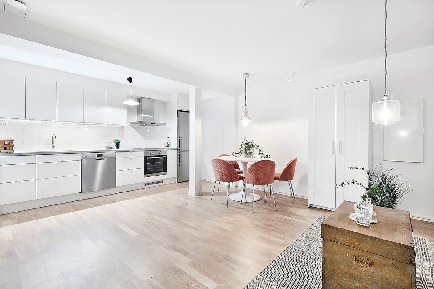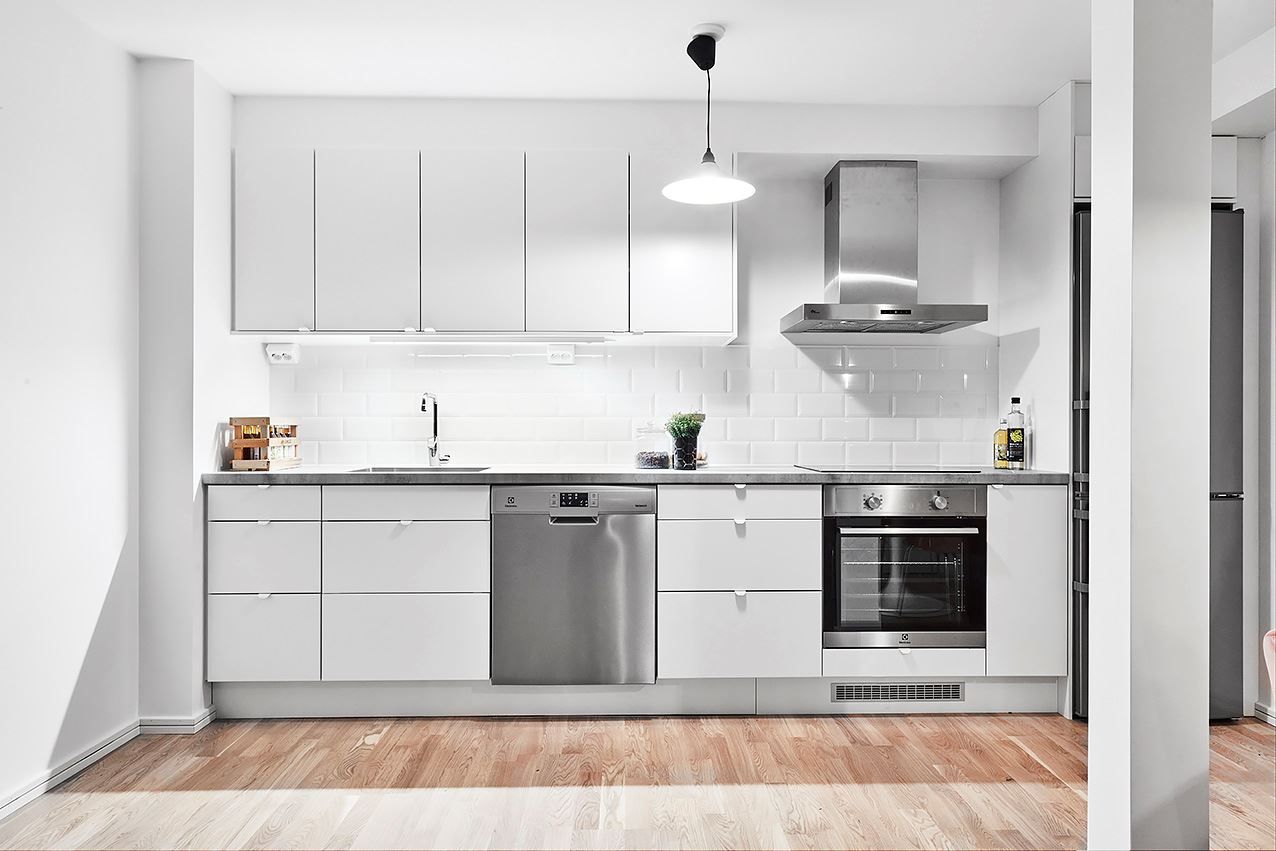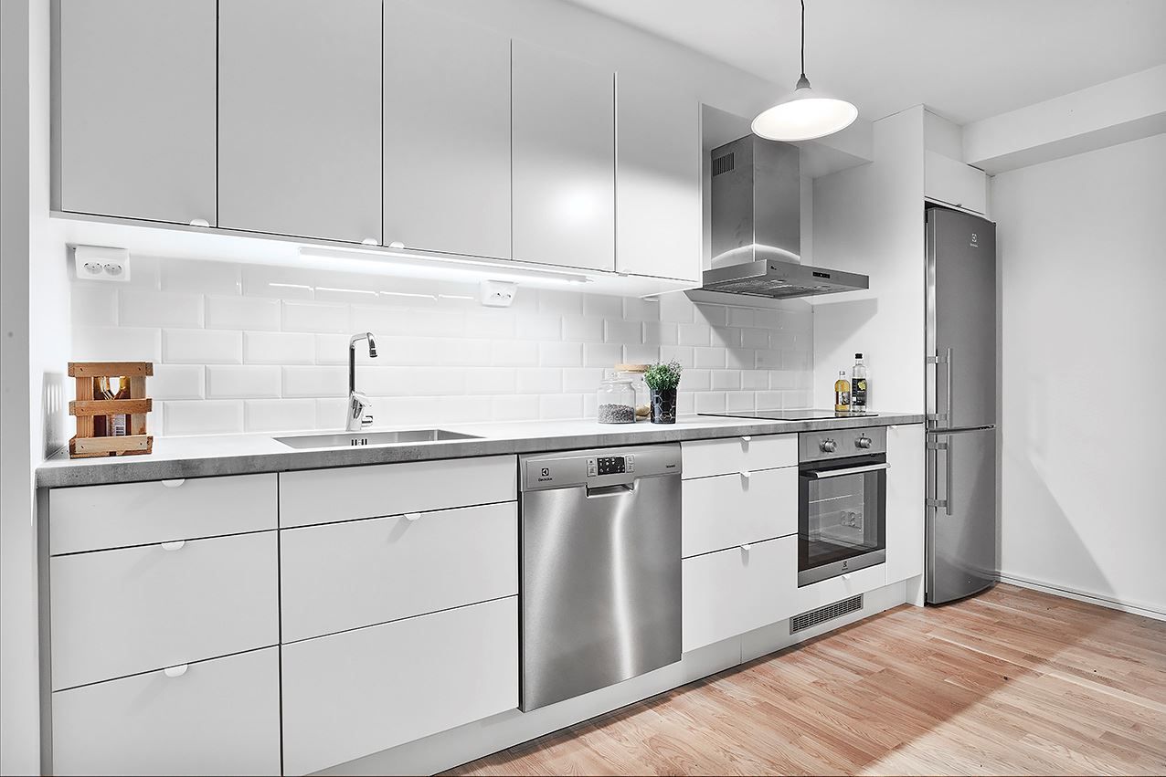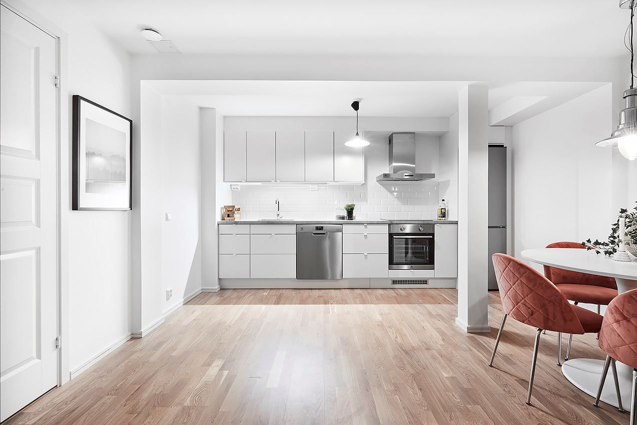Ett ljust och välutrustat kök i modern stil bjuder in till matlagning. Trevlig, öppen planlösning mot bostadens rum som bjuder fina ytor att möblera och husera på.
