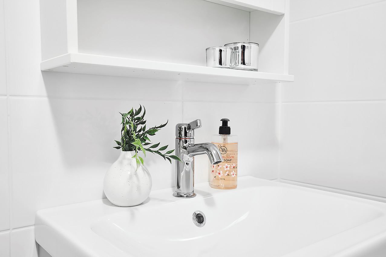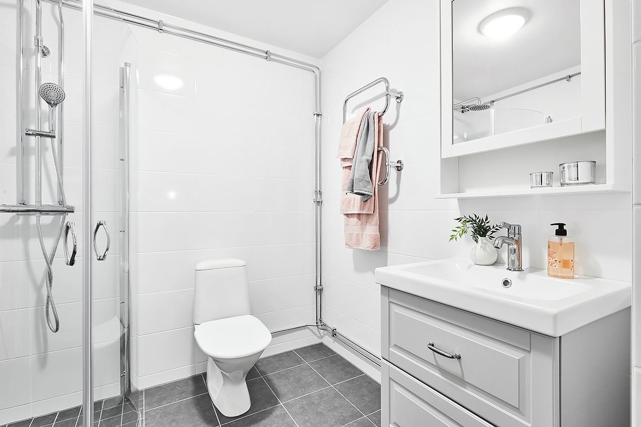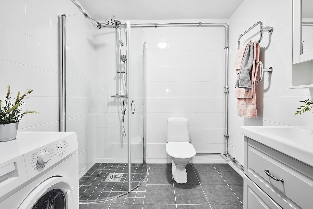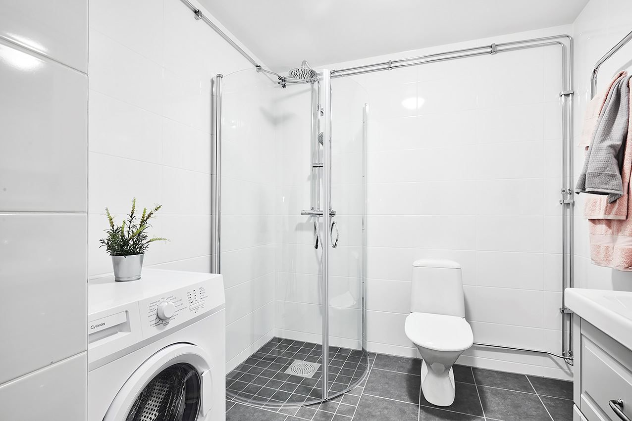Badrummet är stilrent och håller hög standard och självklart finns tvättmaskin som löser vardagstvätten. Golvvärmen som bjuds är också ett plus under vinterhalvåret.