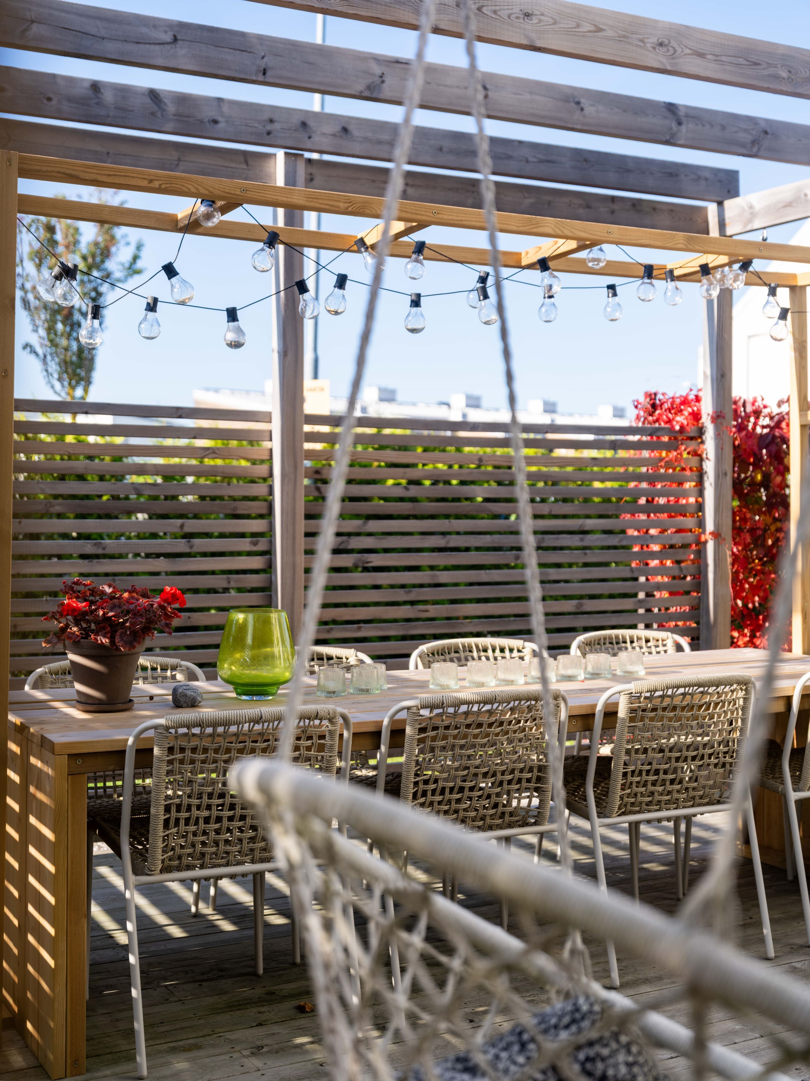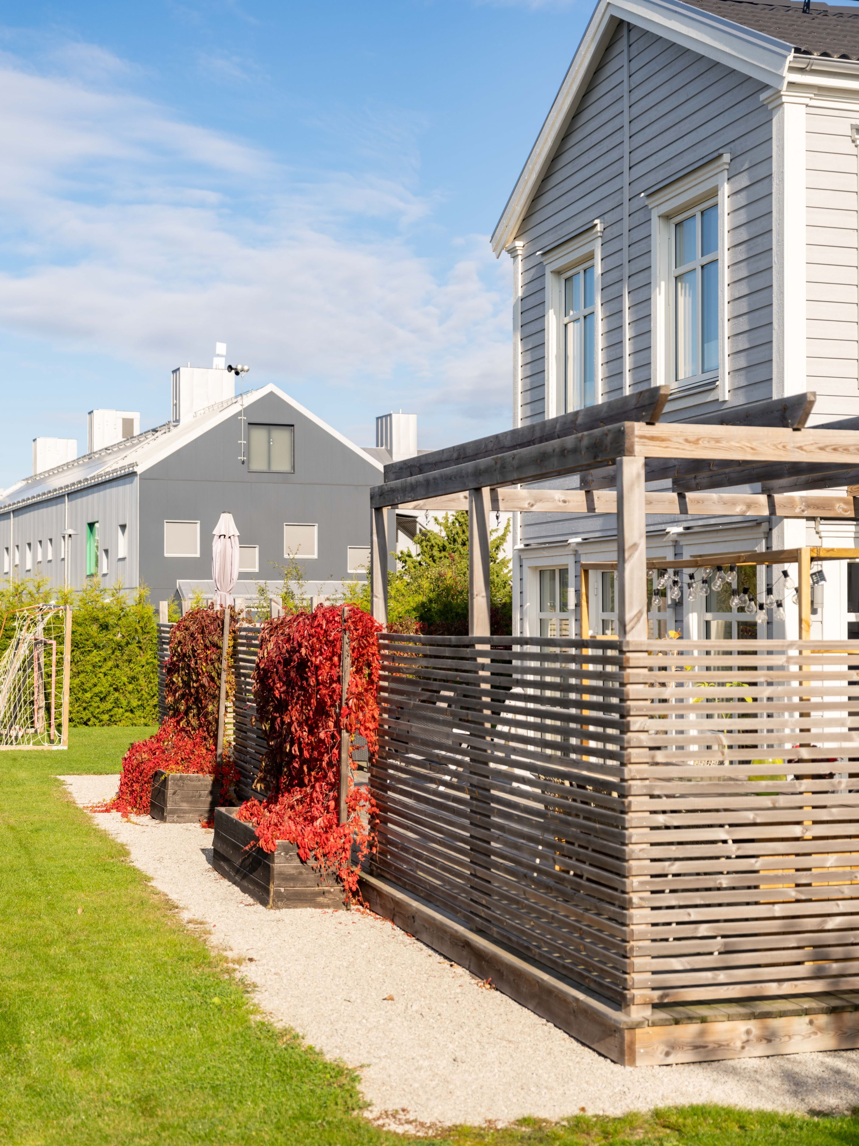 Exteriört? Fullträff! Entrén sätter tonen direkt och lockar till ett första “wow”. När kvällen smyger sig på samlas man gärna på den mysiga terrassen med något gott på tallriken och skratt i luften. Trädgården är lagom stor och lättskött, tryggt inbäddad bakom en tät tujahäck där du får både grönska och avskildhet, utan att behöva bli bästa vän med gräsklipparen.