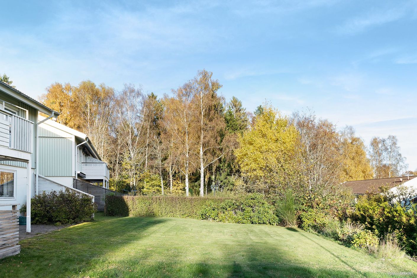 På nedre plan finns två sovrum varav det ena har utgång till uteplats och gräsmatta i söderläge. På nedre planet finns även ett badrum, klädkammare, hobbyrum samt en stor praktisk tvättstuga.