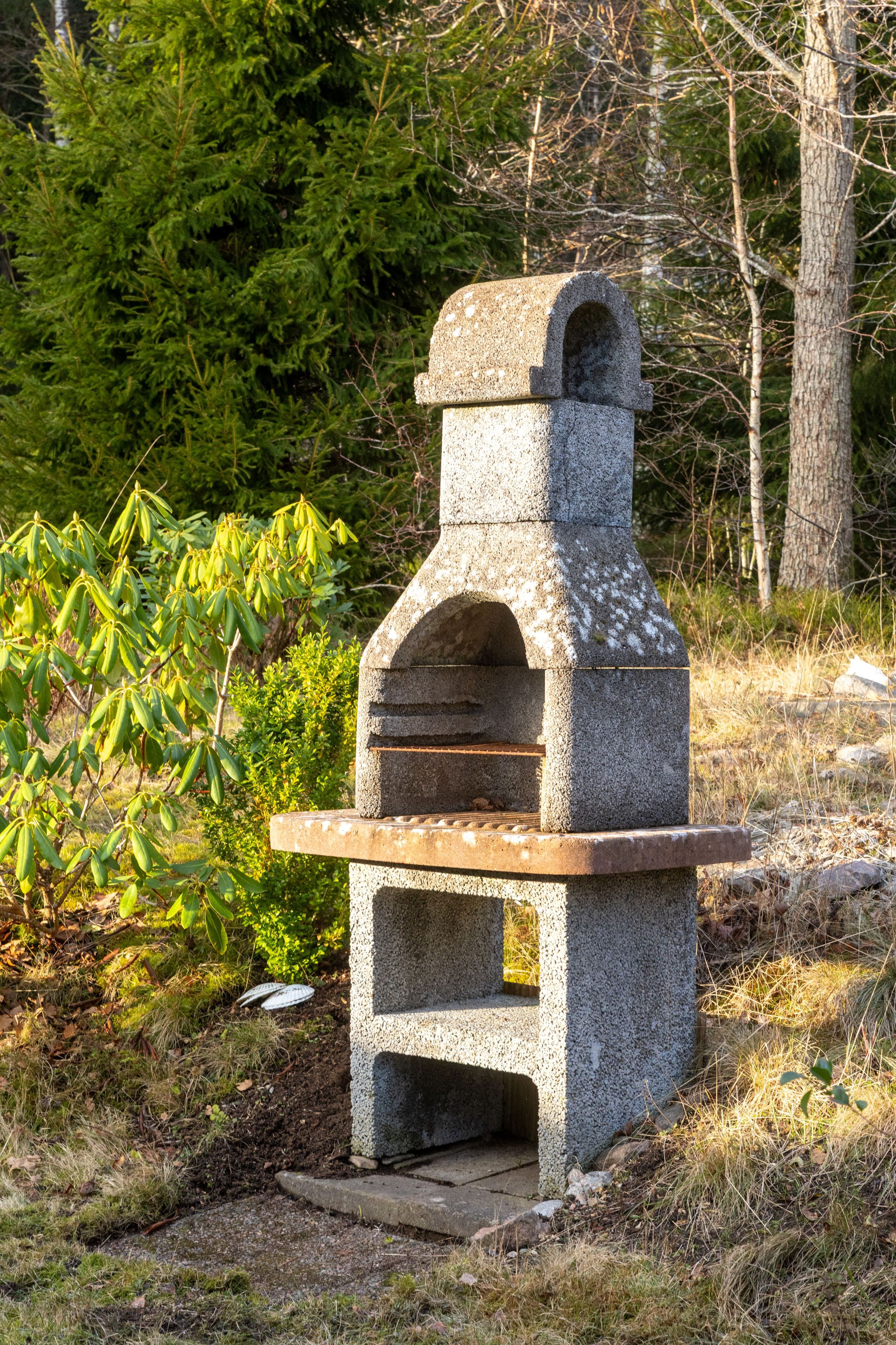 Trädgårdsdelen på baksidan är insynsskyddad och erbjuder ett härligt inglasat uterum med plats för umgänge med nära och kära. Här finns även en gedigen murad grill – perfekt för sommarens middagar – samt en lummig och lättskött trädgård mot skogskanten, vilket ger en lugn och avkopplande atmosfär.