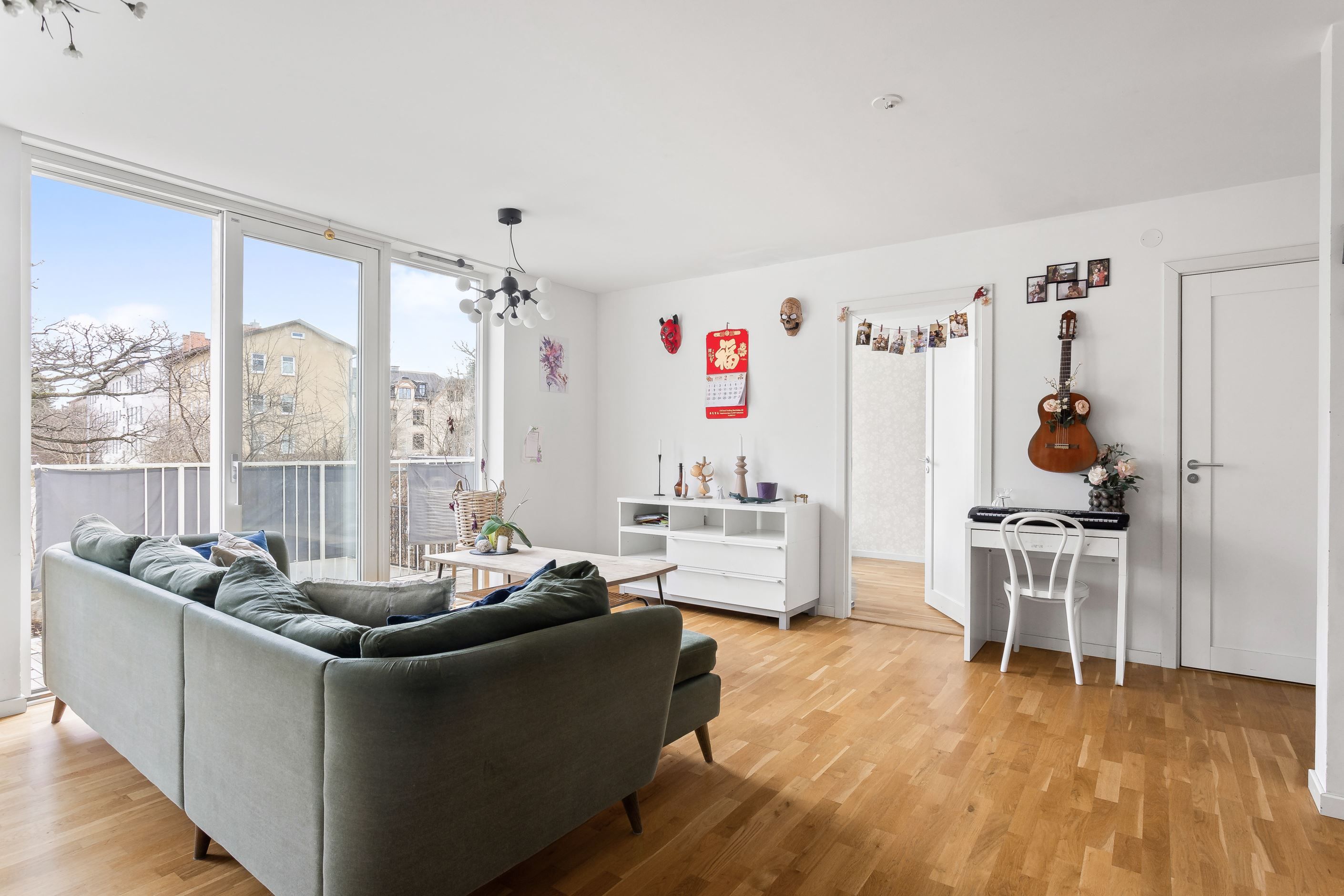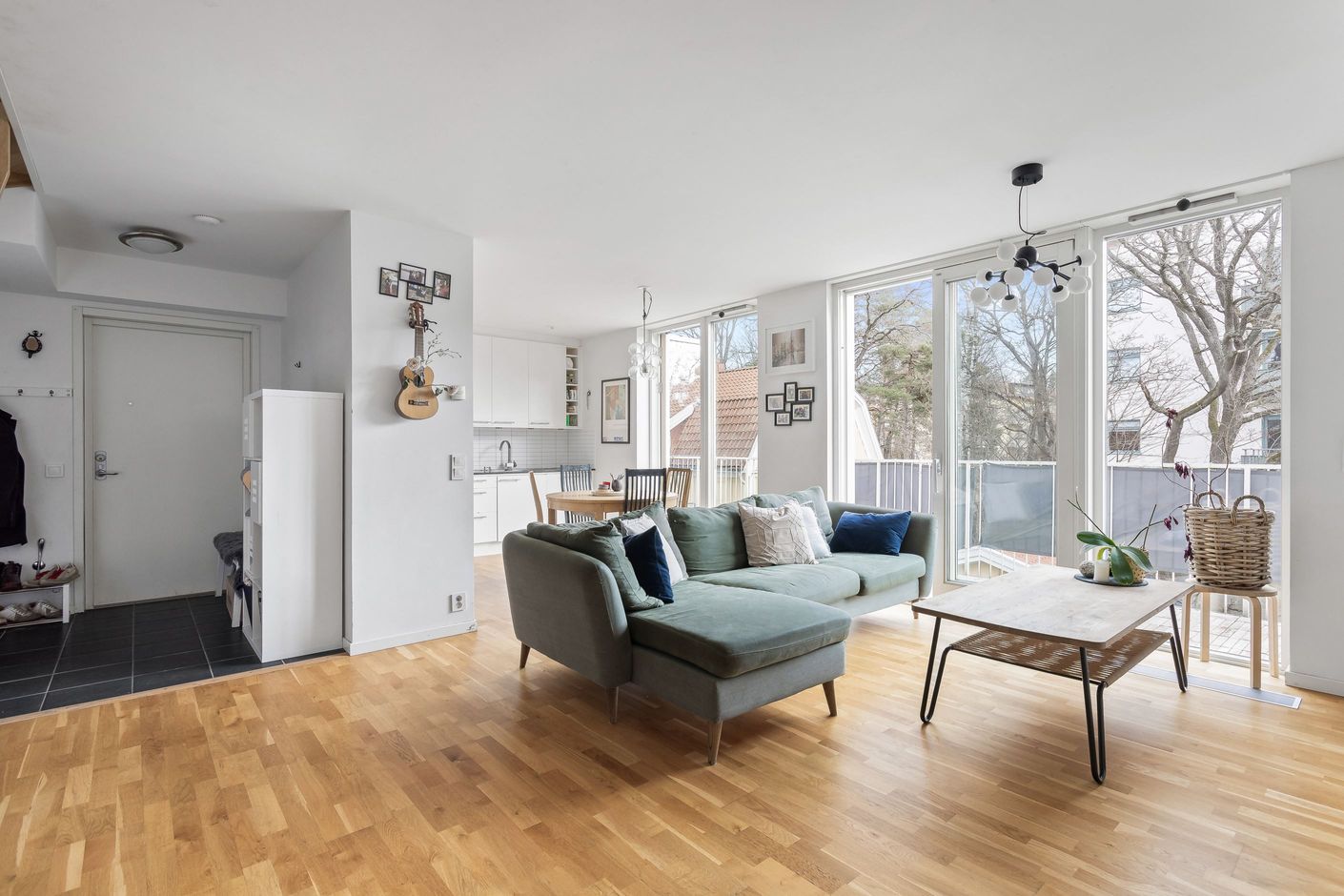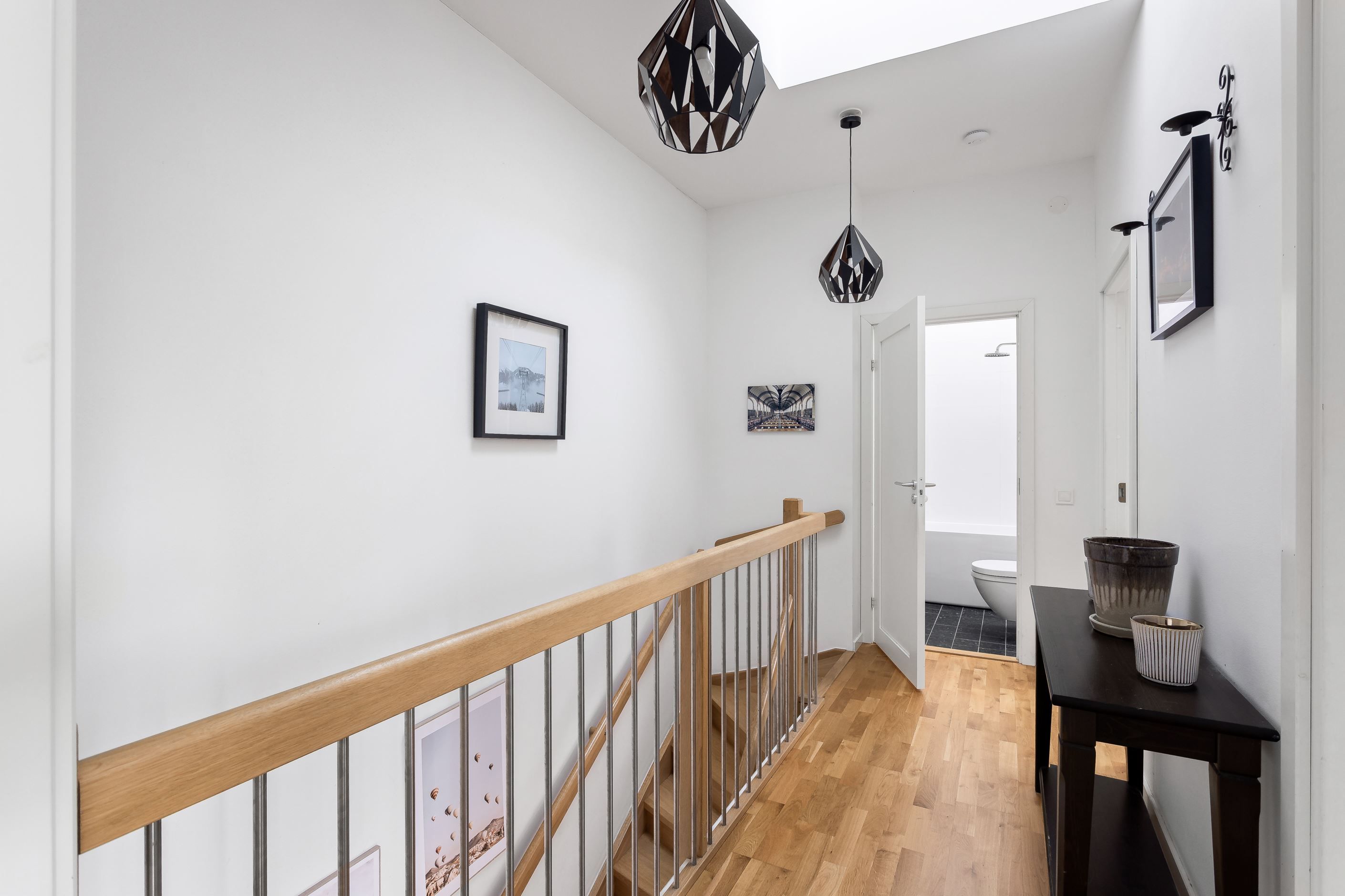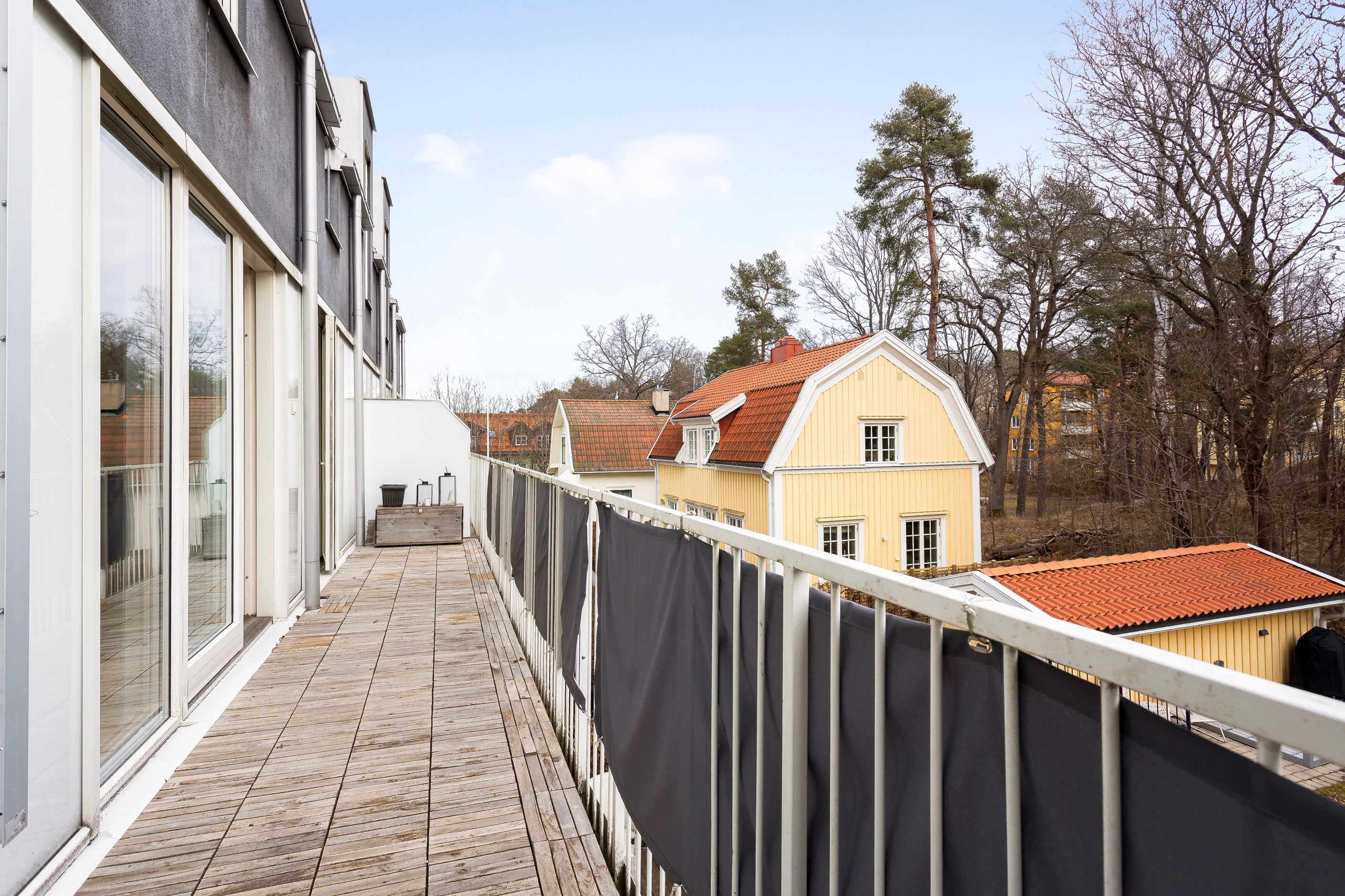 Här presenteras en unik etagelägenhet, ritad av Thomas Sandell Arkitektbyrå, med ett fantastiskt ljusinsläpp från generösa fönsterpartier. Den rymliga balkongen sträcker sig längs hela sällskapsytan och erbjuder sol från tidig morgon till sen eftermiddag. Bostaden har en öppen planlösning där vardagsrum och kök samspelar, med badrum och ett sovrum på nedre plan samt tre sovrum och ytterligare ett badrum på övre plan. Genomgående ljusa färgval kombineras med betsade trägolv som skapar en stilren och harmonisk känsla.