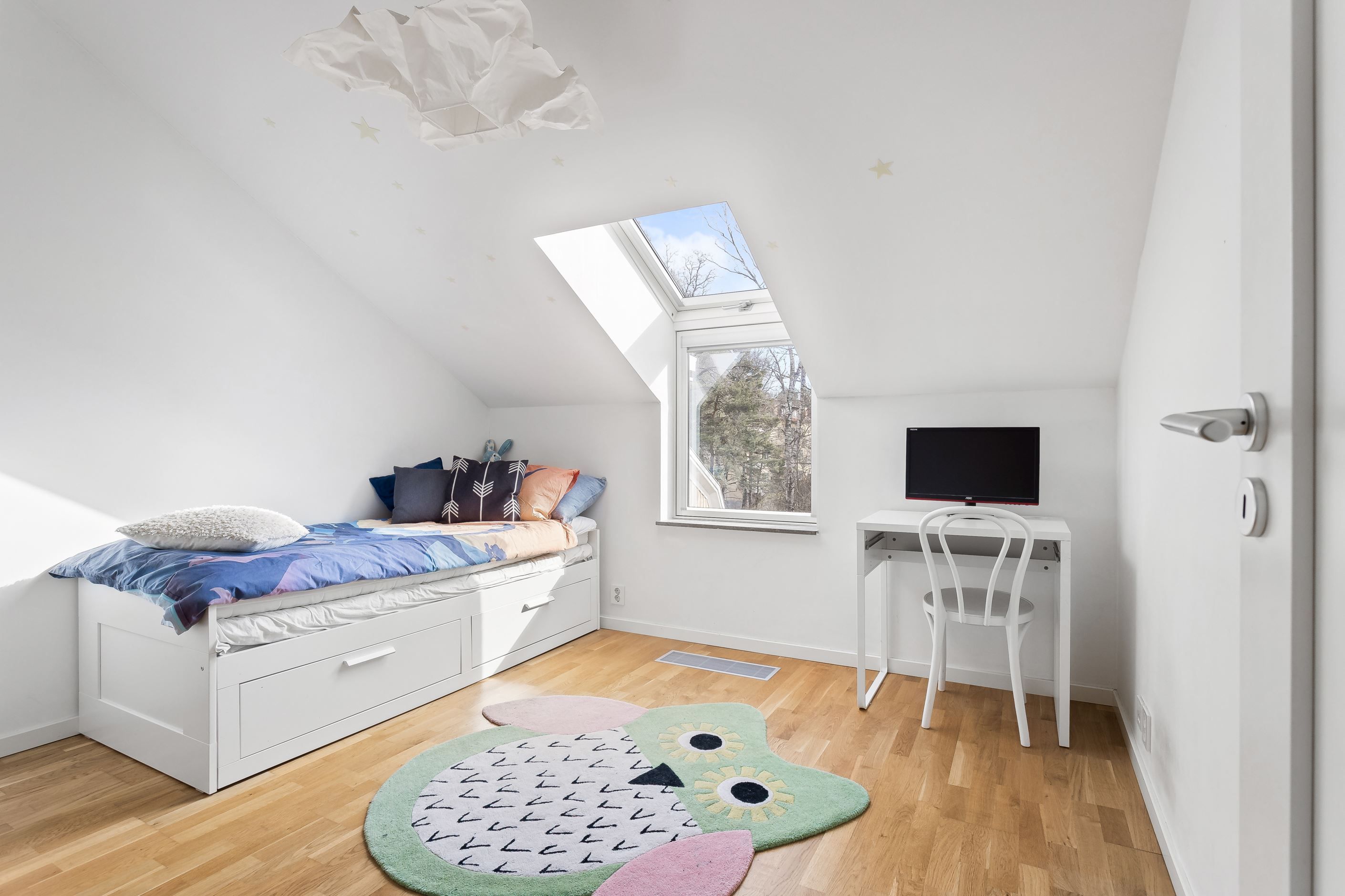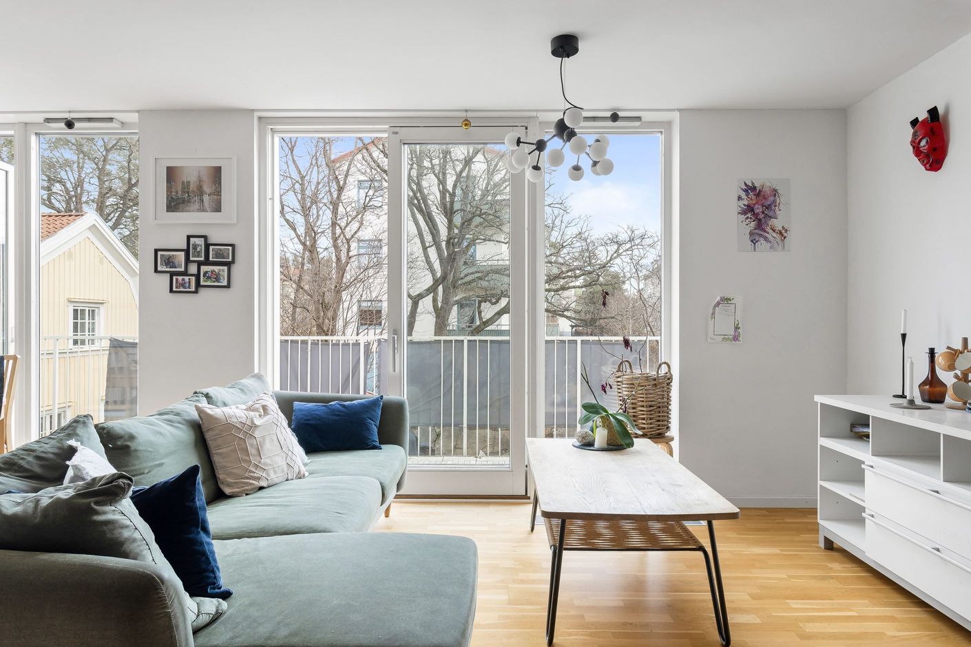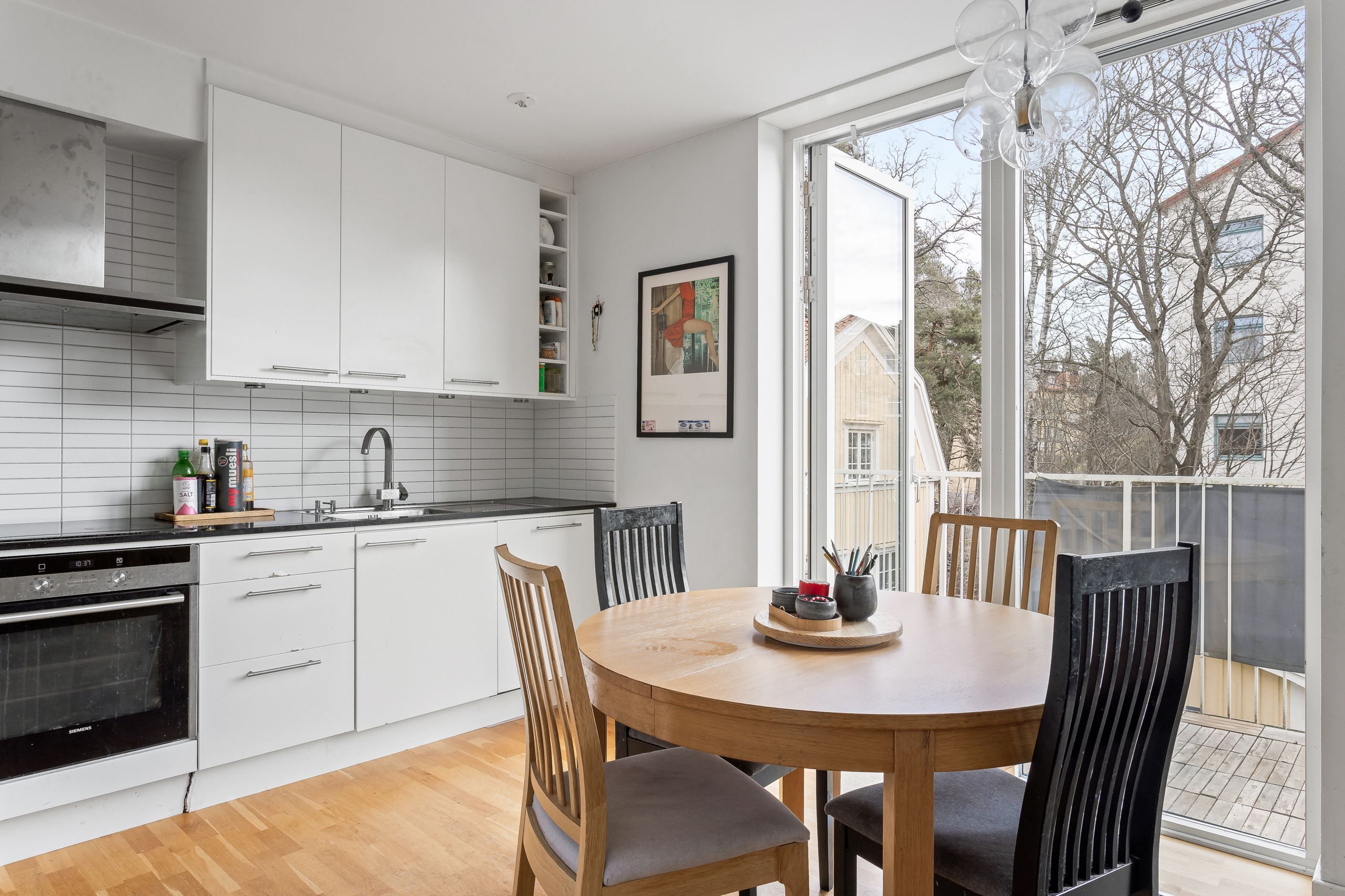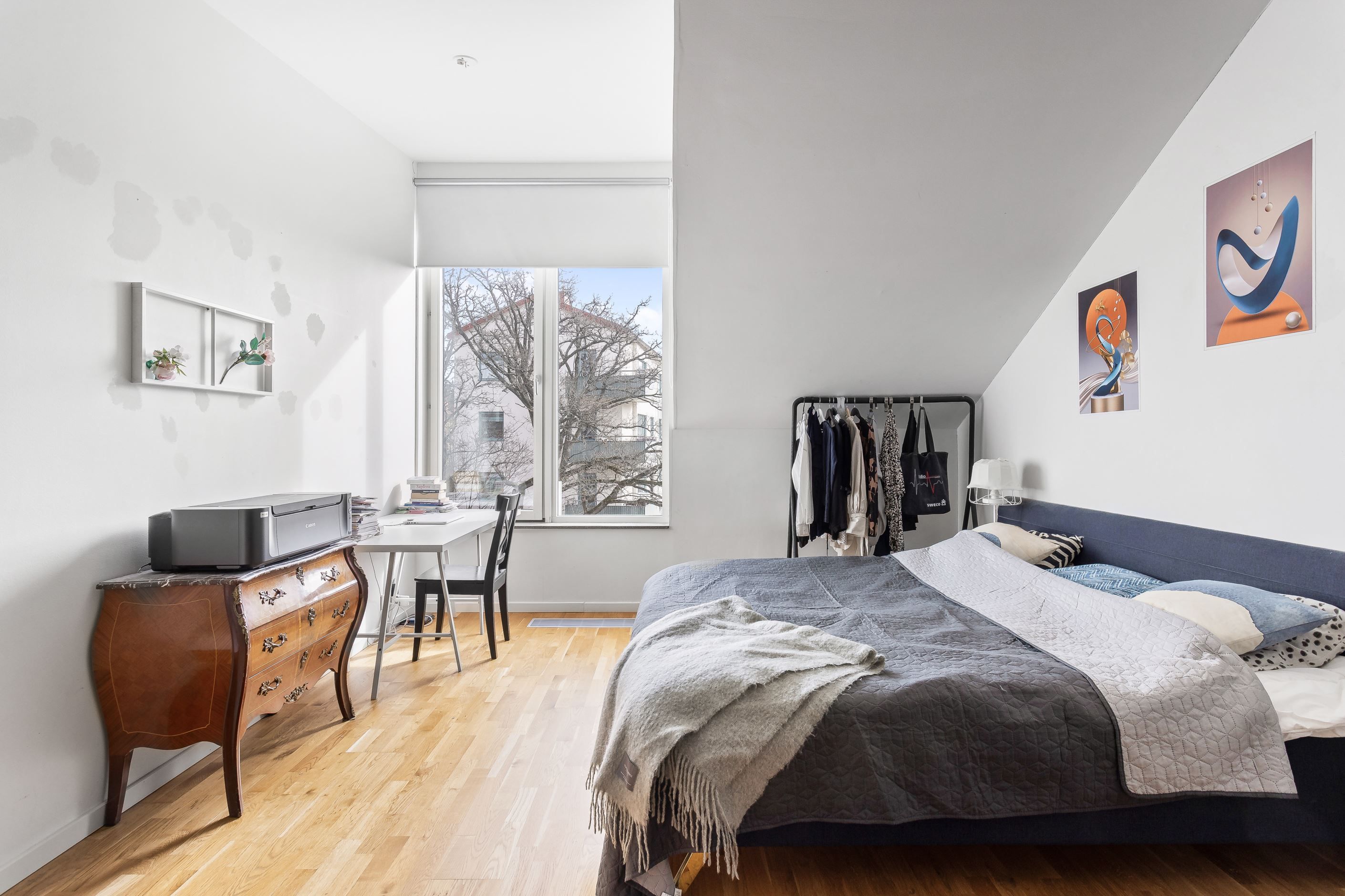 Här presenteras en unik etagelägenhet, ritad av Thomas Sandell Arkitektbyrå, med ett fantastiskt ljusinsläpp från generösa fönsterpartier. Den rymliga balkongen sträcker sig längs hela sällskapsytan och erbjuder sol från tidig morgon till sen eftermiddag. Bostaden har en öppen planlösning där vardagsrum och kök samspelar, med badrum och ett sovrum på nedre plan samt tre sovrum och ytterligare ett badrum på övre plan. Genomgående ljusa färgval kombineras med betsade trägolv som skapar en stilren och harmonisk känsla.