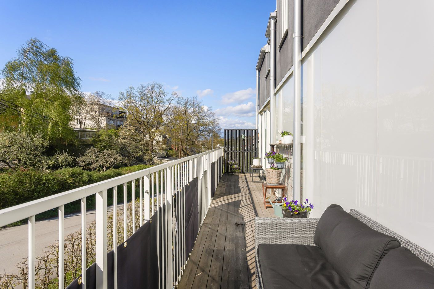 Här erbjuds en unik arkitektritad (Thomas Sandell Arkitektbyrå) etagelägenhet med underbart ljusinsläpp från stora fönster. Stor balkong längs hela sällskapsytan med sol från lunch till kväll. Lägenheten har öppen planlösning med sällskapsdel och kök, badrum på nedre plan och sovrumsdel med badrum på övre plan. Genomgående ljusa färgval med mörkbetsat trägolv i alla rum. Bostaden ligger på en lummig och lugn villagata med närhet till Mälaren.