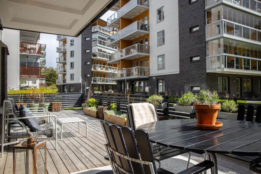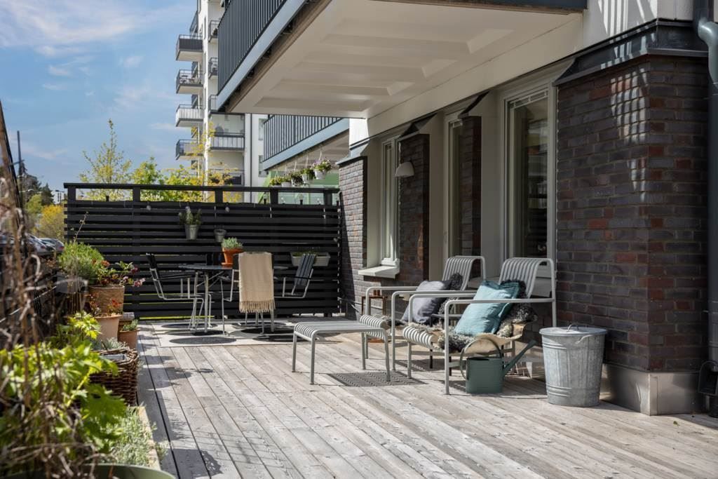 En av bostadens absoluta höjdpunkter är den unika, terrasserade uteplatsen om hela 48 kvm – en verklig oas med plats för både loungemöbler, matgrupp och planteringar. Här njuter du av solen större delen av dagen, perfekt för både vardagsavkoppling och sociala tillställningar.
