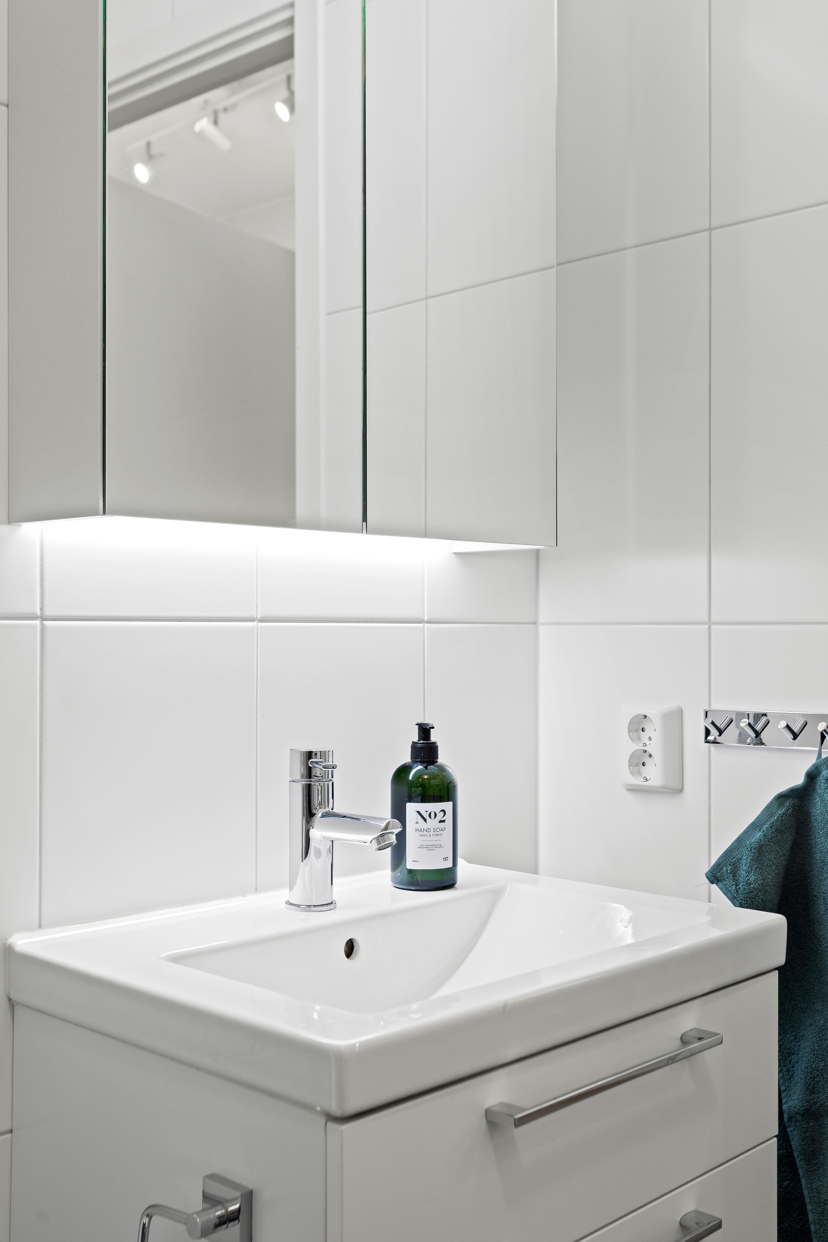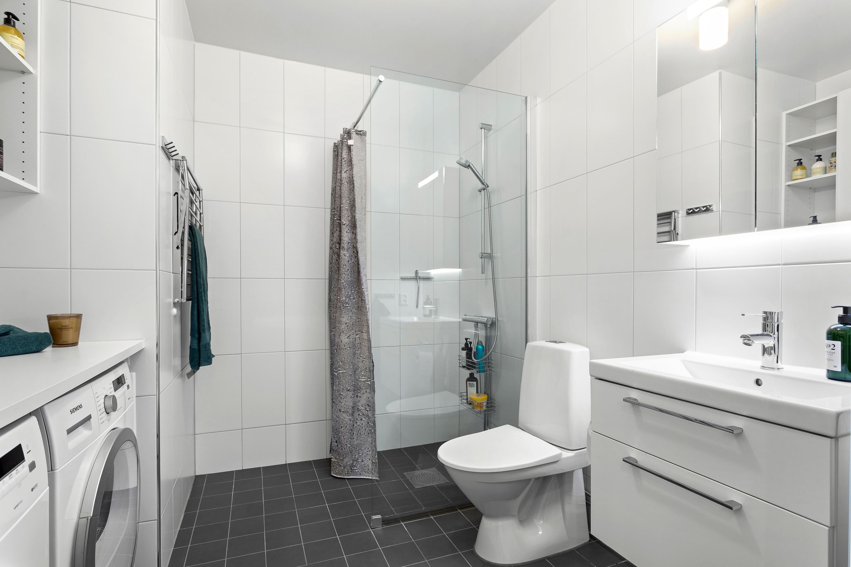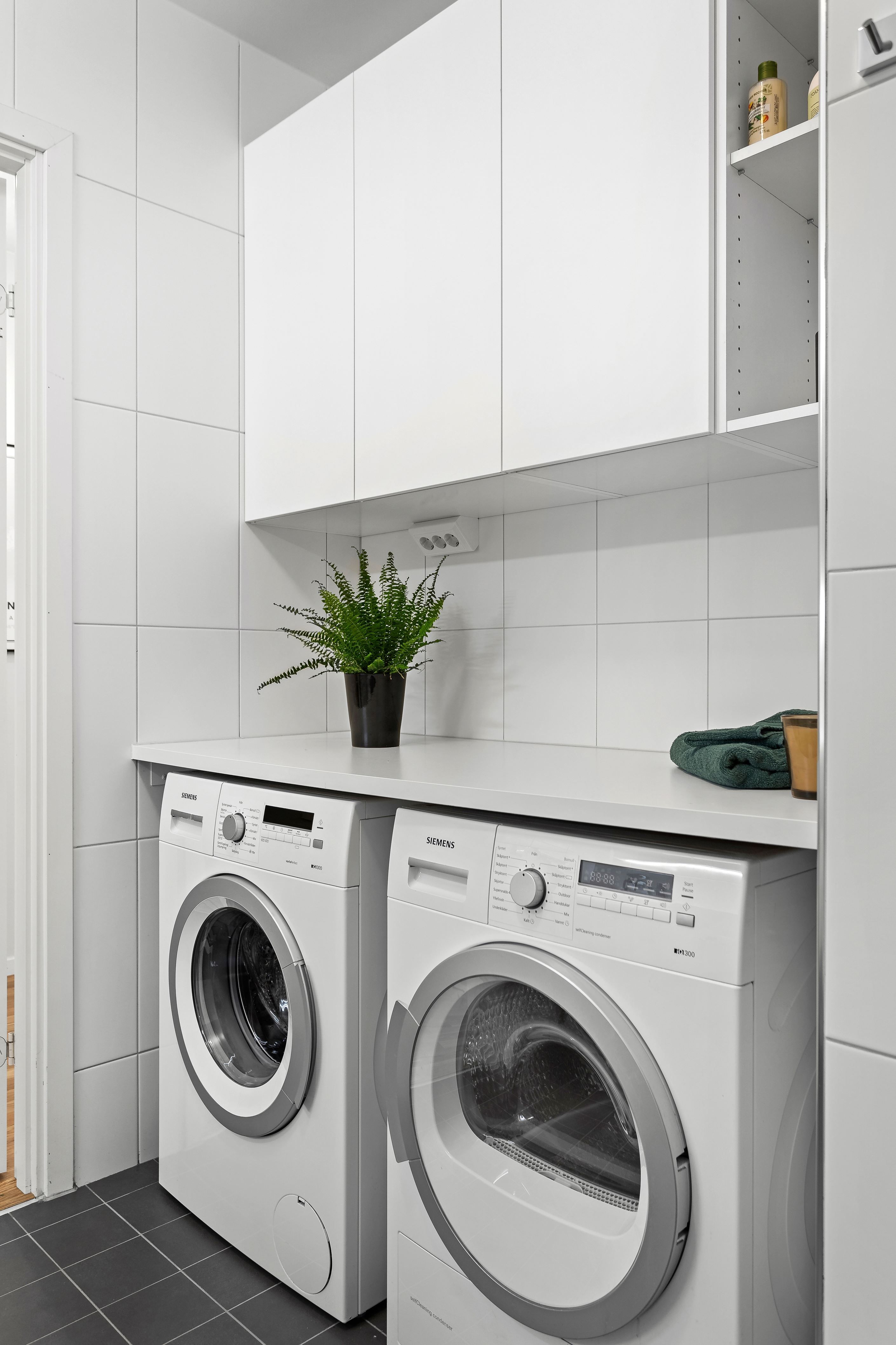 Två helkaklade badrum – ett med tvättmaskin och torktumlare.