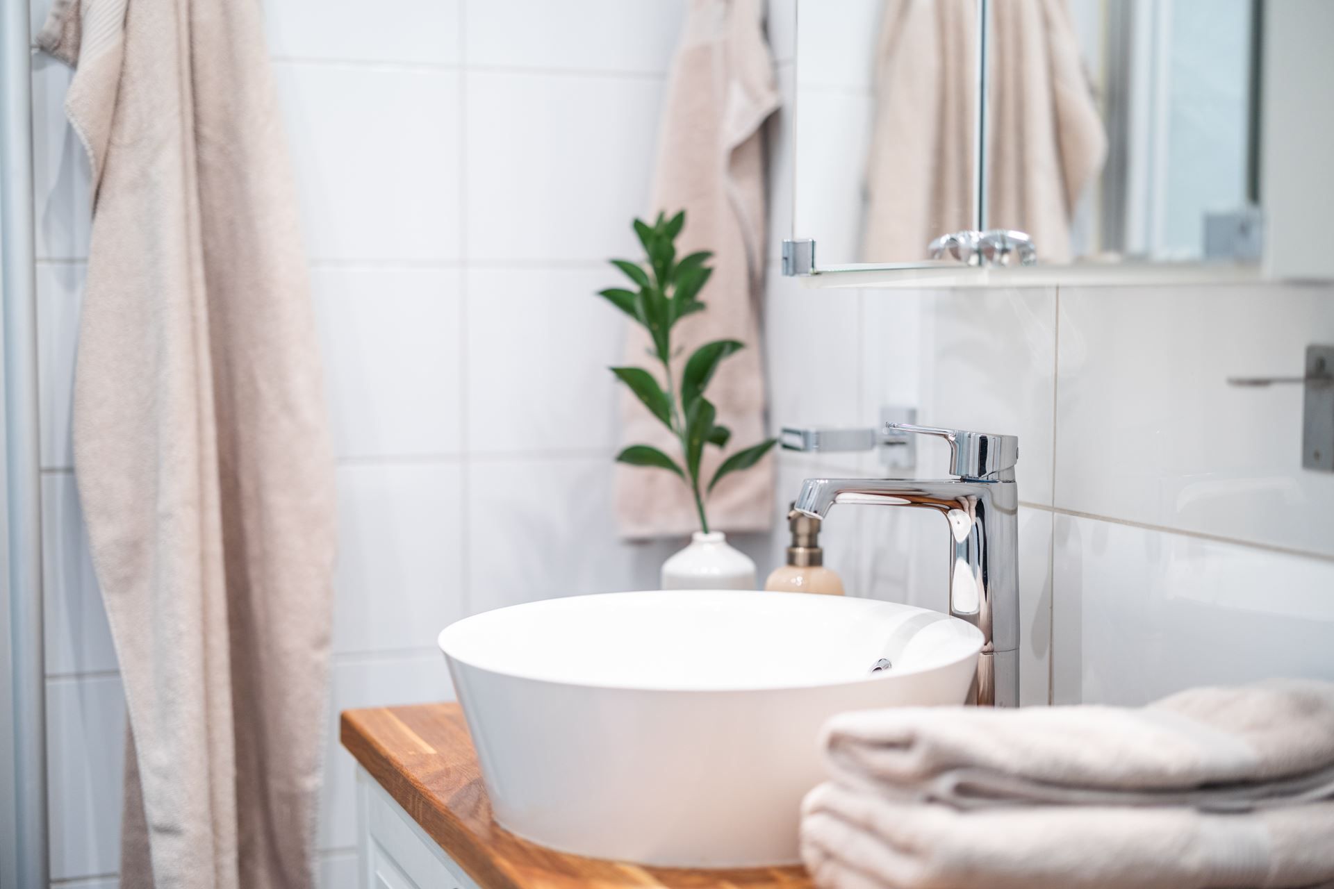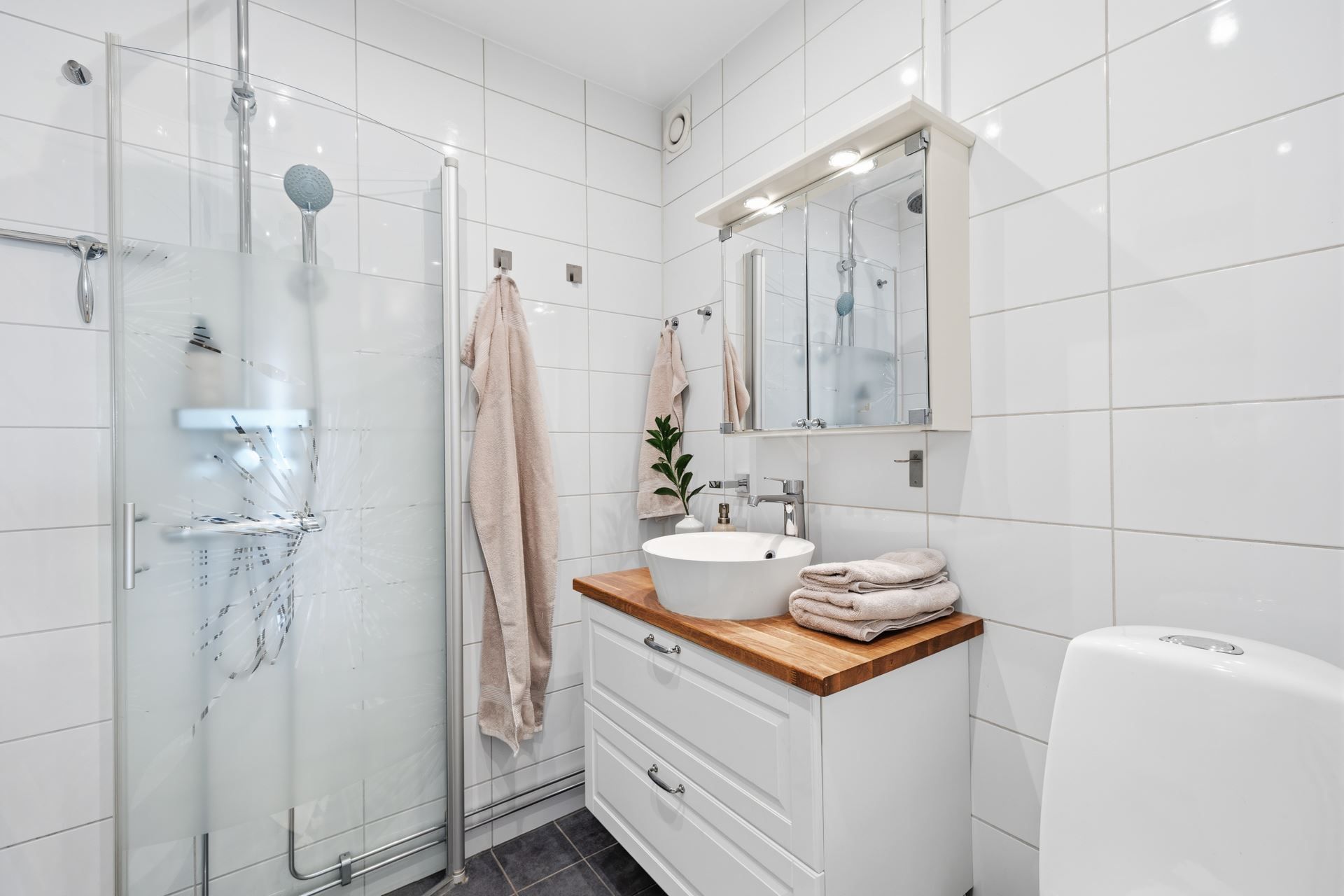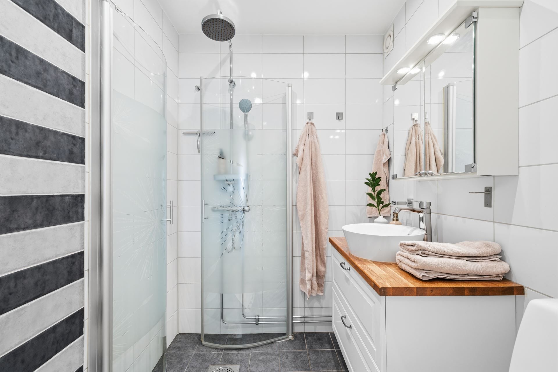 Det helkaklade badrummet är stilrent och erbjuder dessutom möjlighet att installera tvättmaskin för extra bekvämlighet.