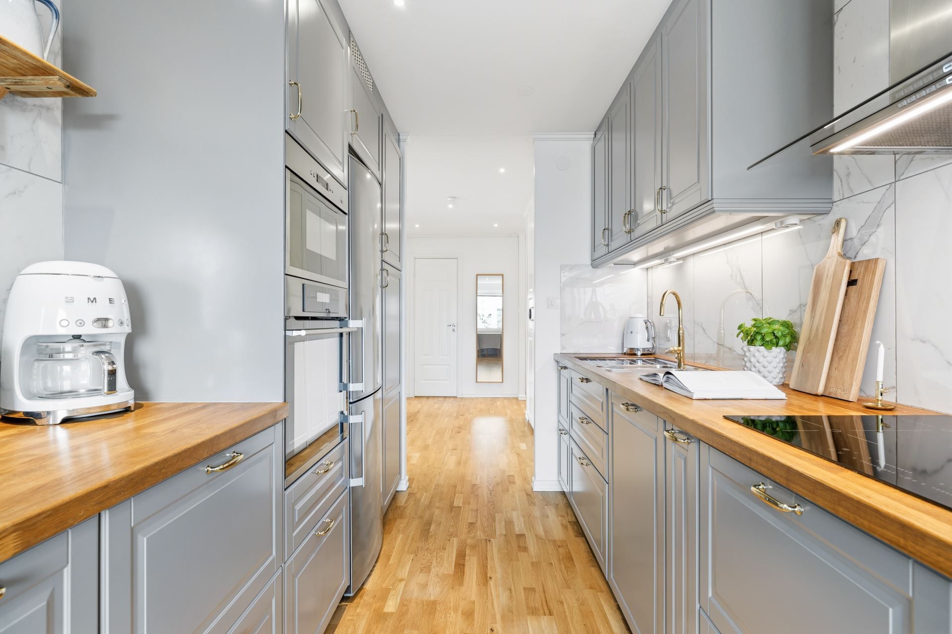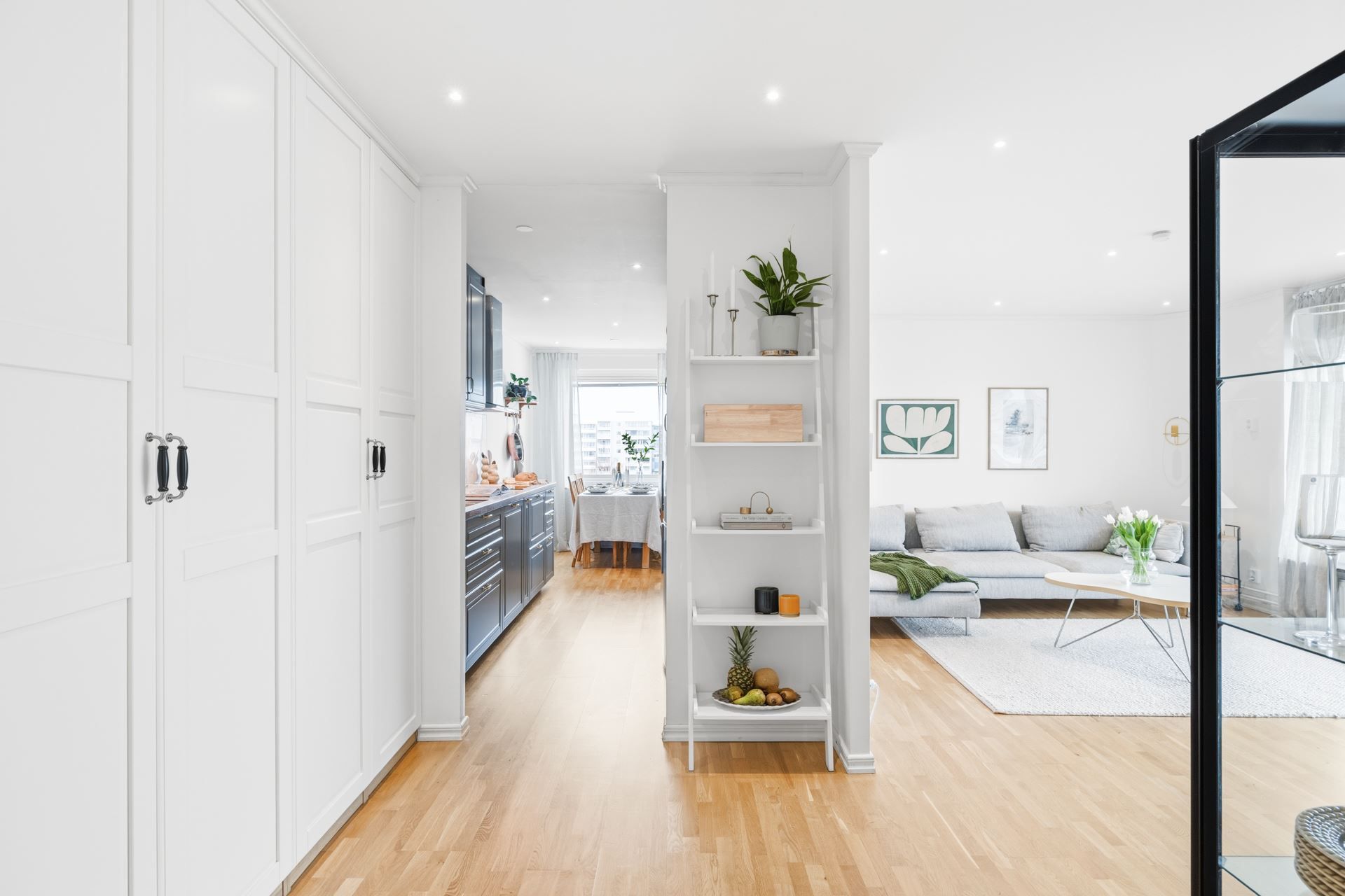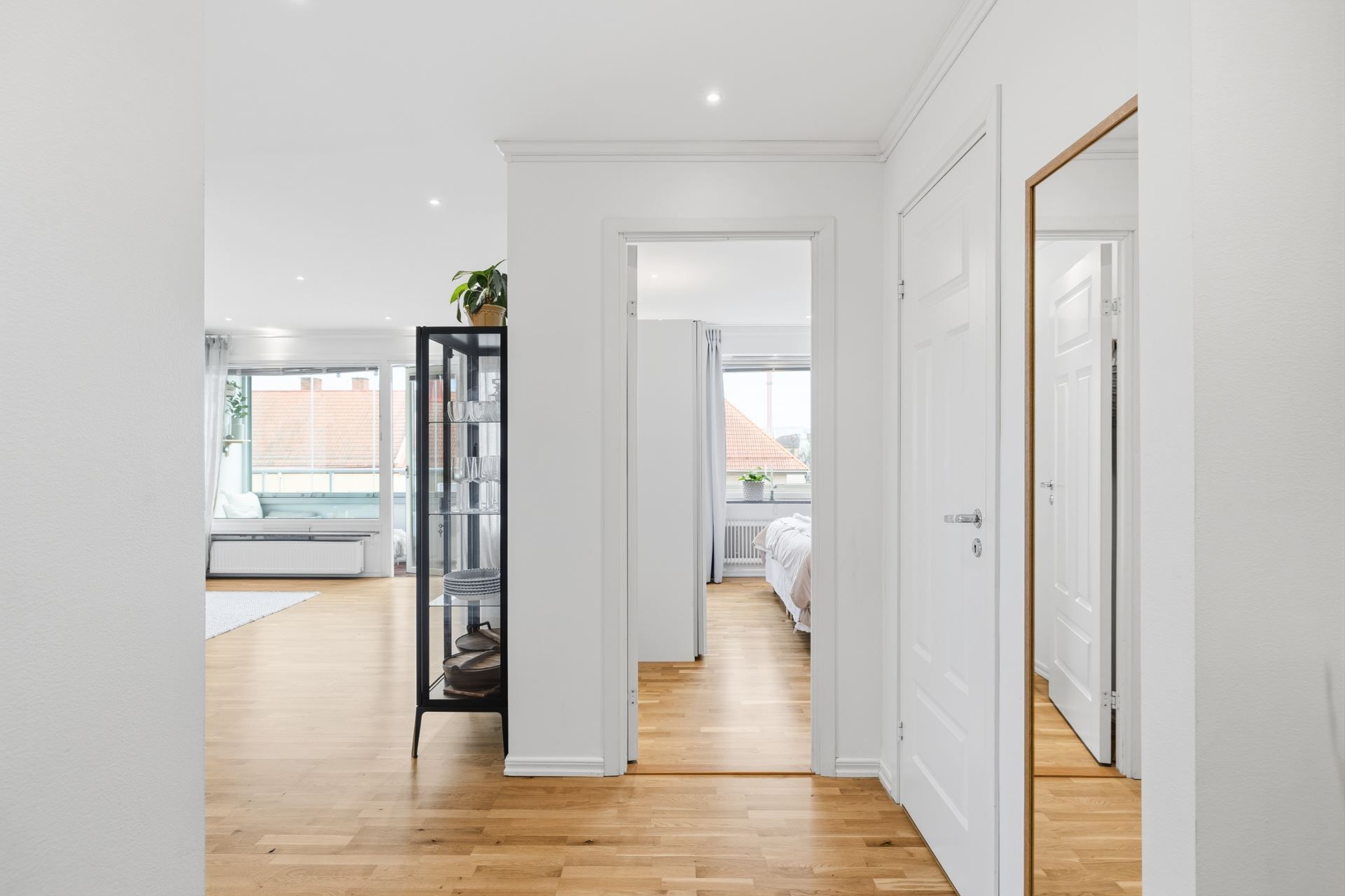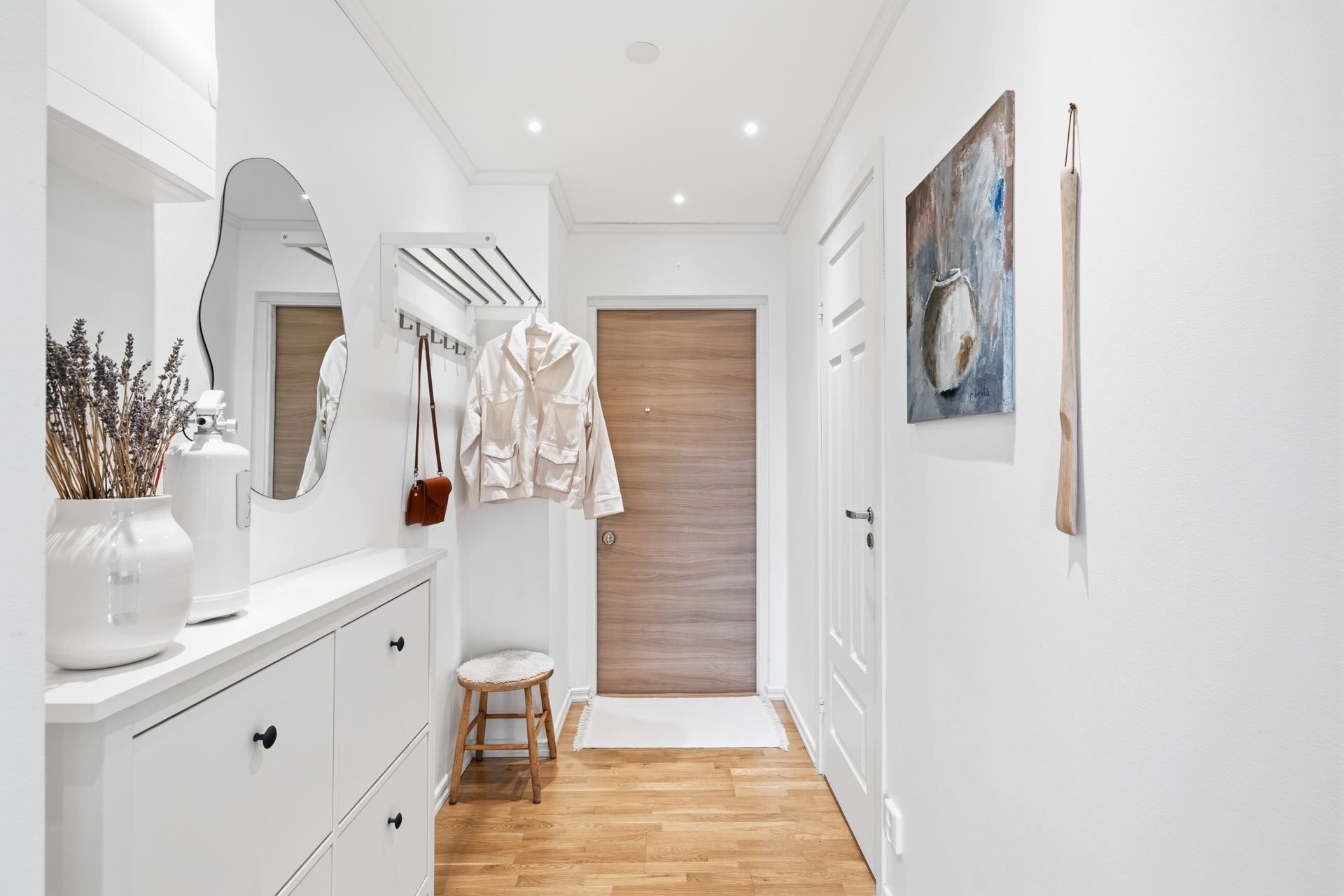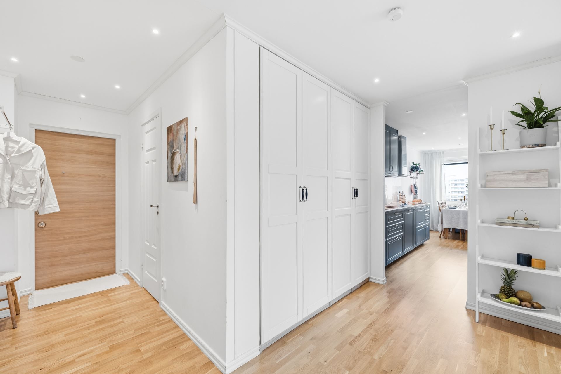 Redan i hallen möts du av ett ljust och välkomnande intryck med goda avhängningsmöjligheter samt en praktisk klädkammare som löser förvaringen på ett smidigt sätt.