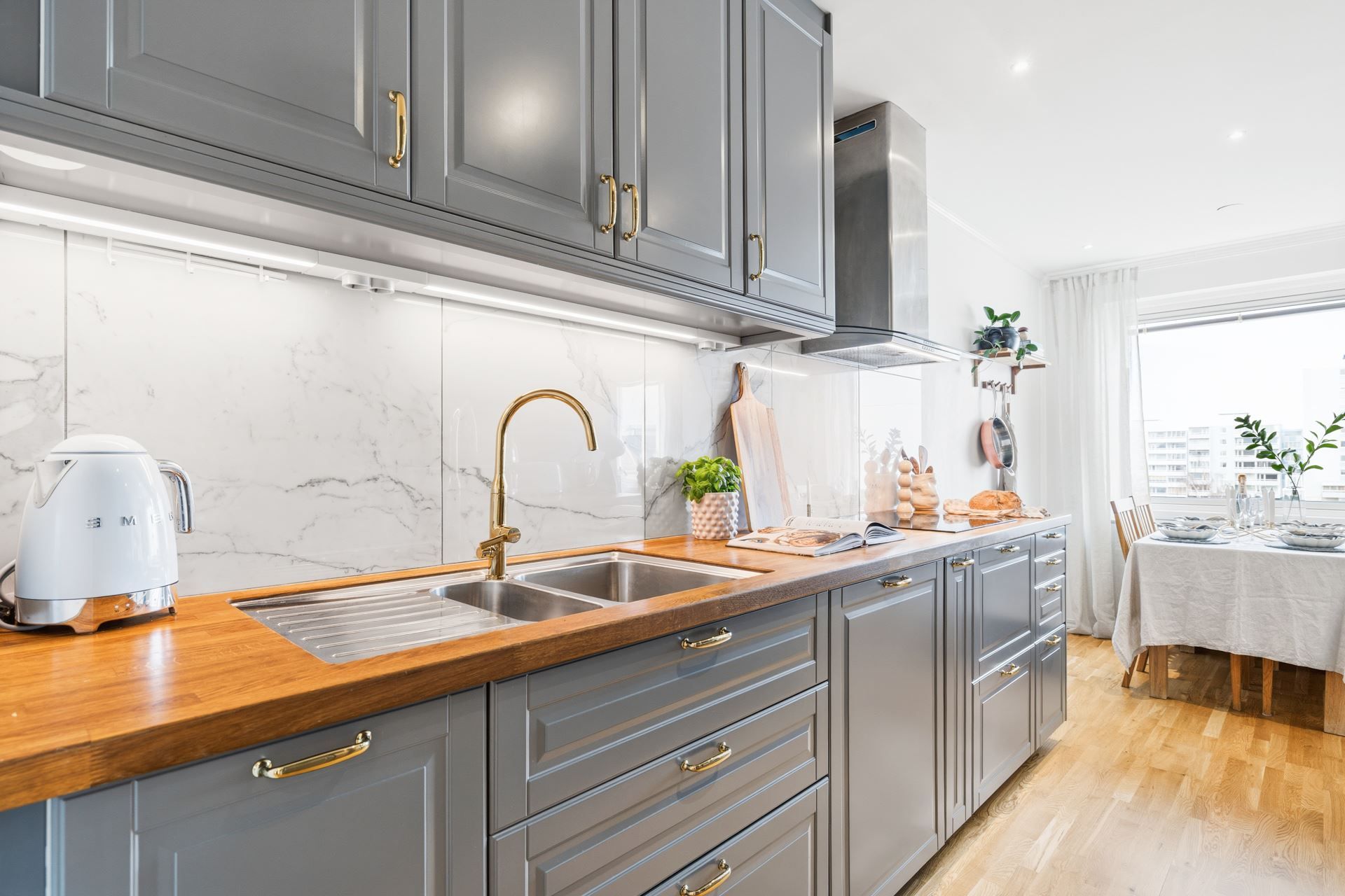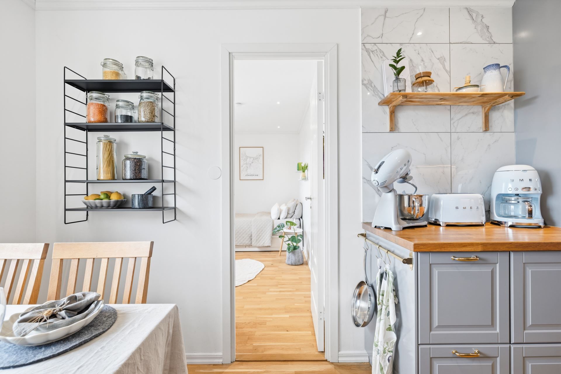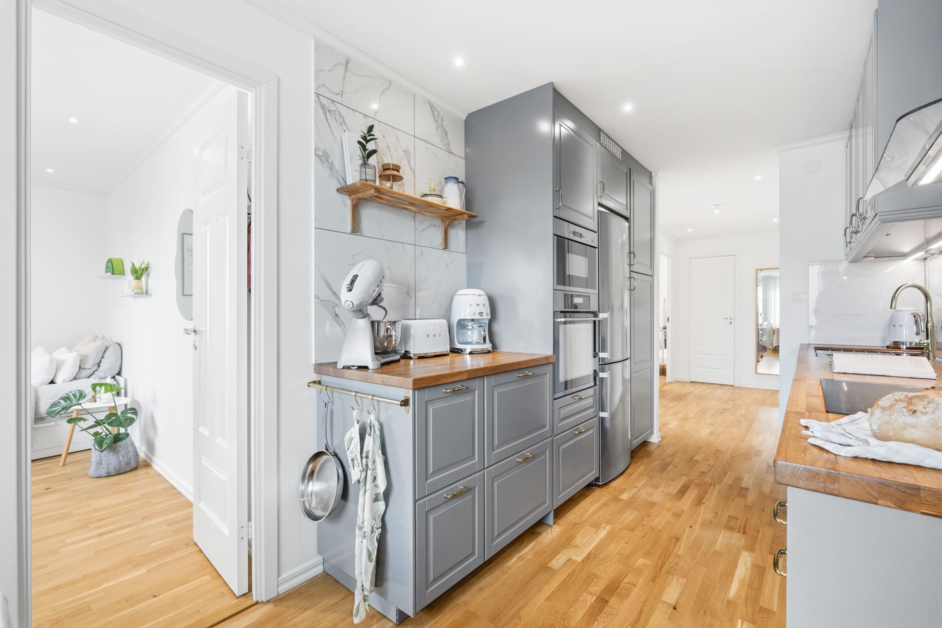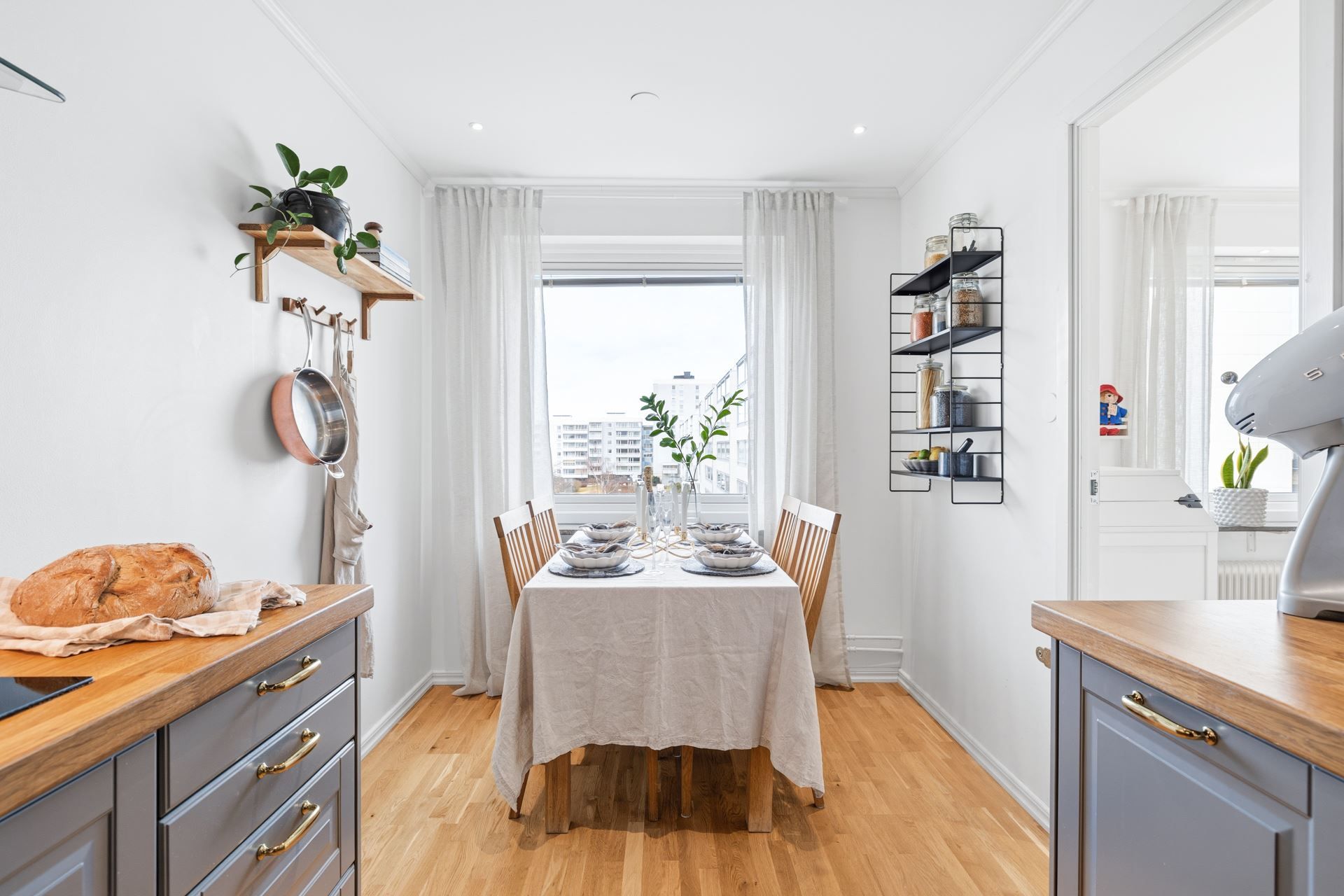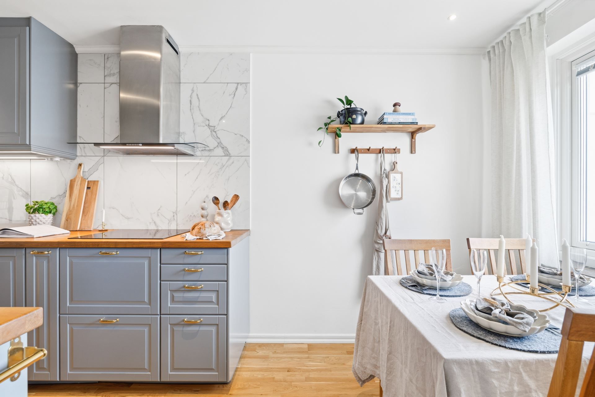 Köket är funktionellt med gott om arbetsytor och plats för matgrupp – en naturlig samlingspunkt i hemmet.