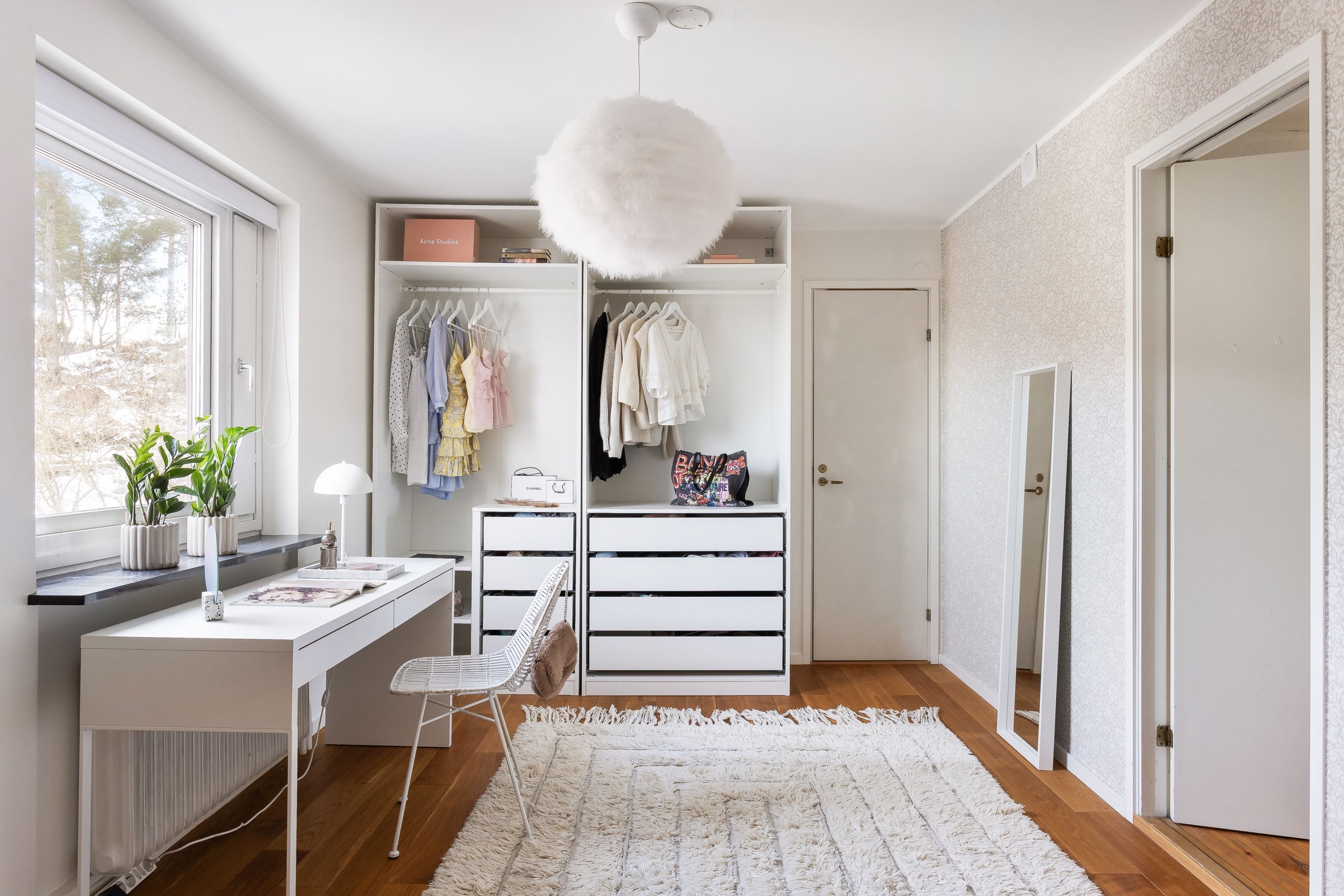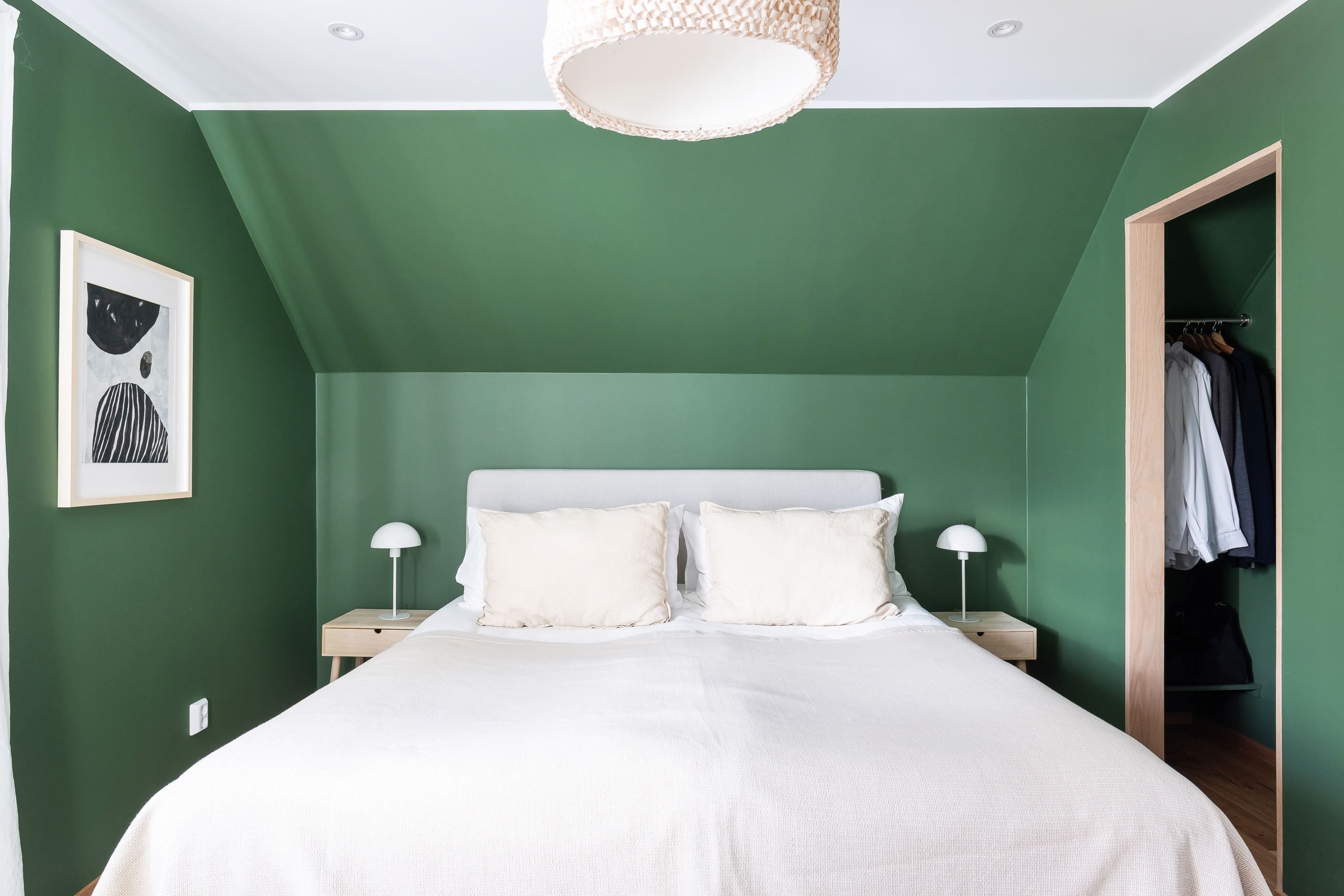 SOVRUM med fönster i sydöst, mot grannens faluröda 1800-talsfasad. Bra plats för säng samt gott om förvaring i inbyggd garderob.