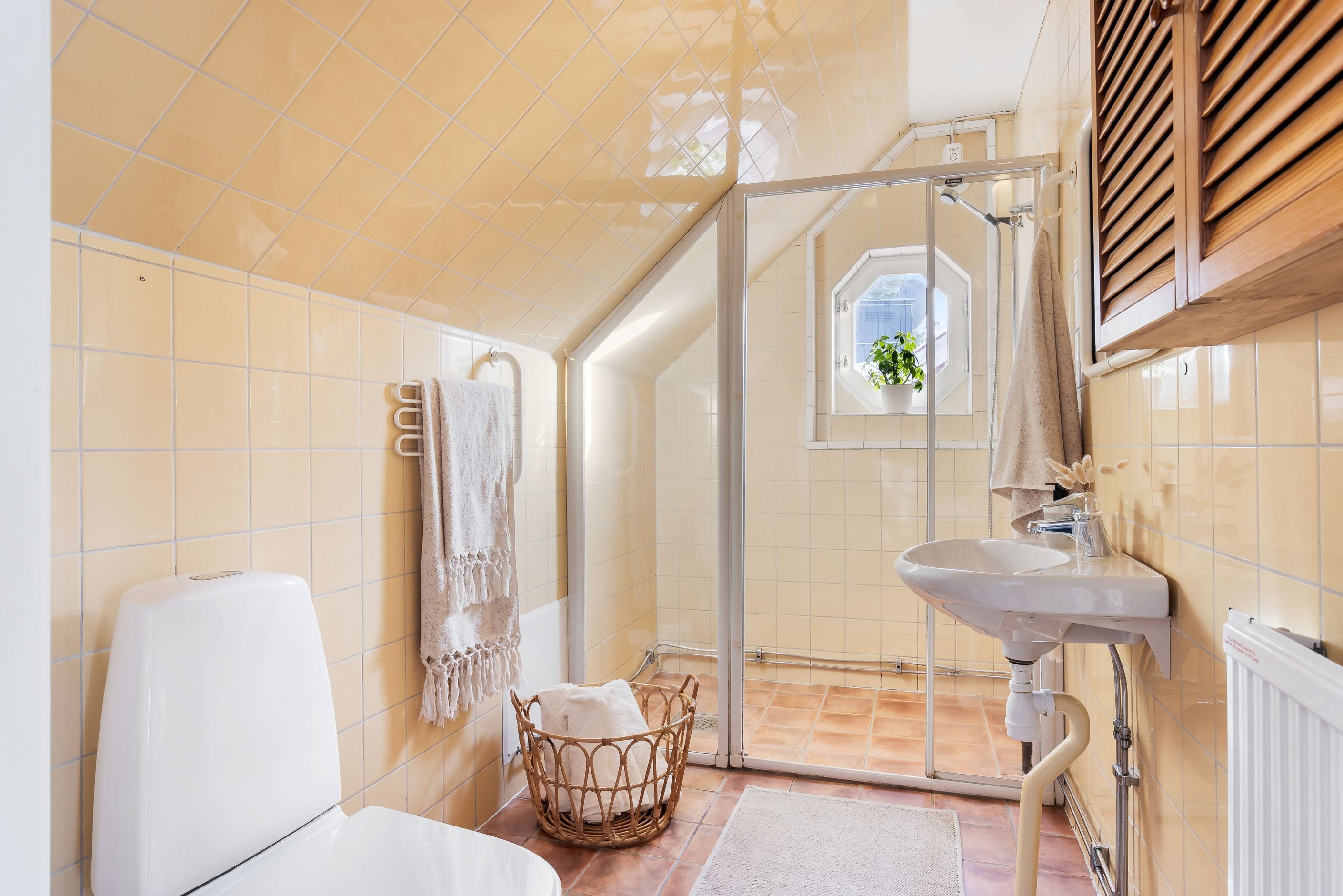 BADRUM med WC, dusch samt handfat. Vackert åttkantigt fönster i sydöst, om man inte har bråttom har man fin utsikt även när man duschar.