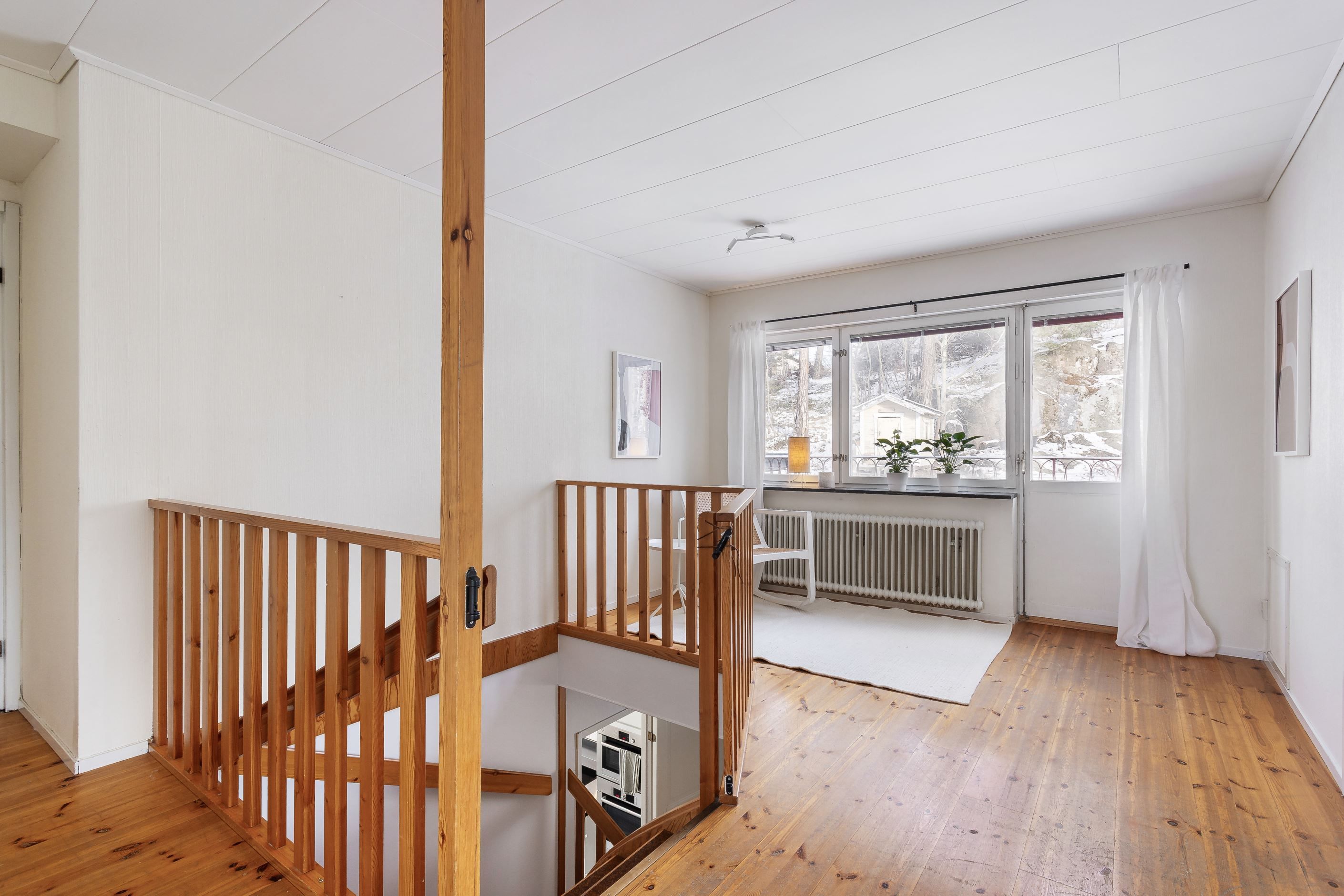 ALLRUM som nås via trätrappa leder upp till övervåningens luftiga allrum. Stora fönster ut mot den egna tomten samt utgång till generös balkong, som sommartid är en del av allrummet och där morgon- och förmiddagssolen flödar - härligt att äta frukost här om man inte hellre vill sitta på den lilla farstukvisten under balkongen, precis intill ytterdörren dit de första morgonsolstrålarna når. Allrummet lämpar sig väl som TV-hörna, lekrum eller kanske biblioteksdel eller blomsterrum. Trägolv.