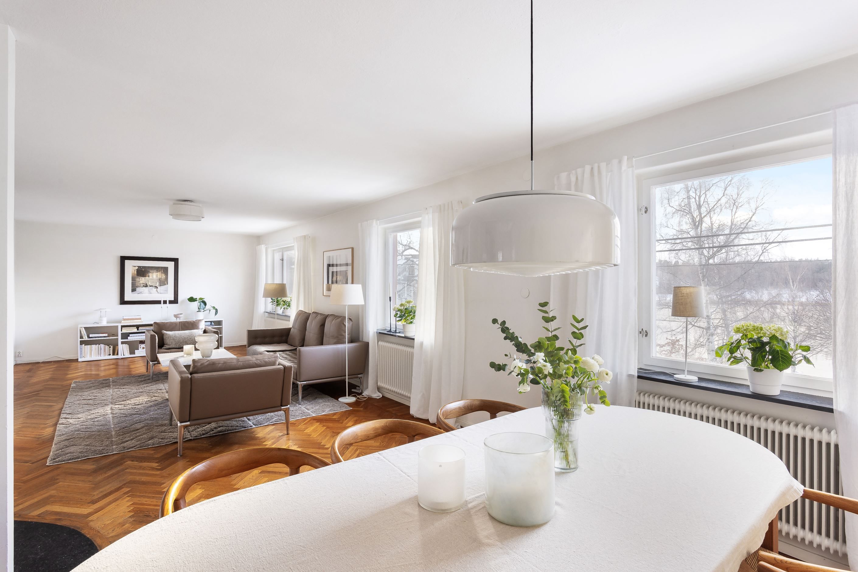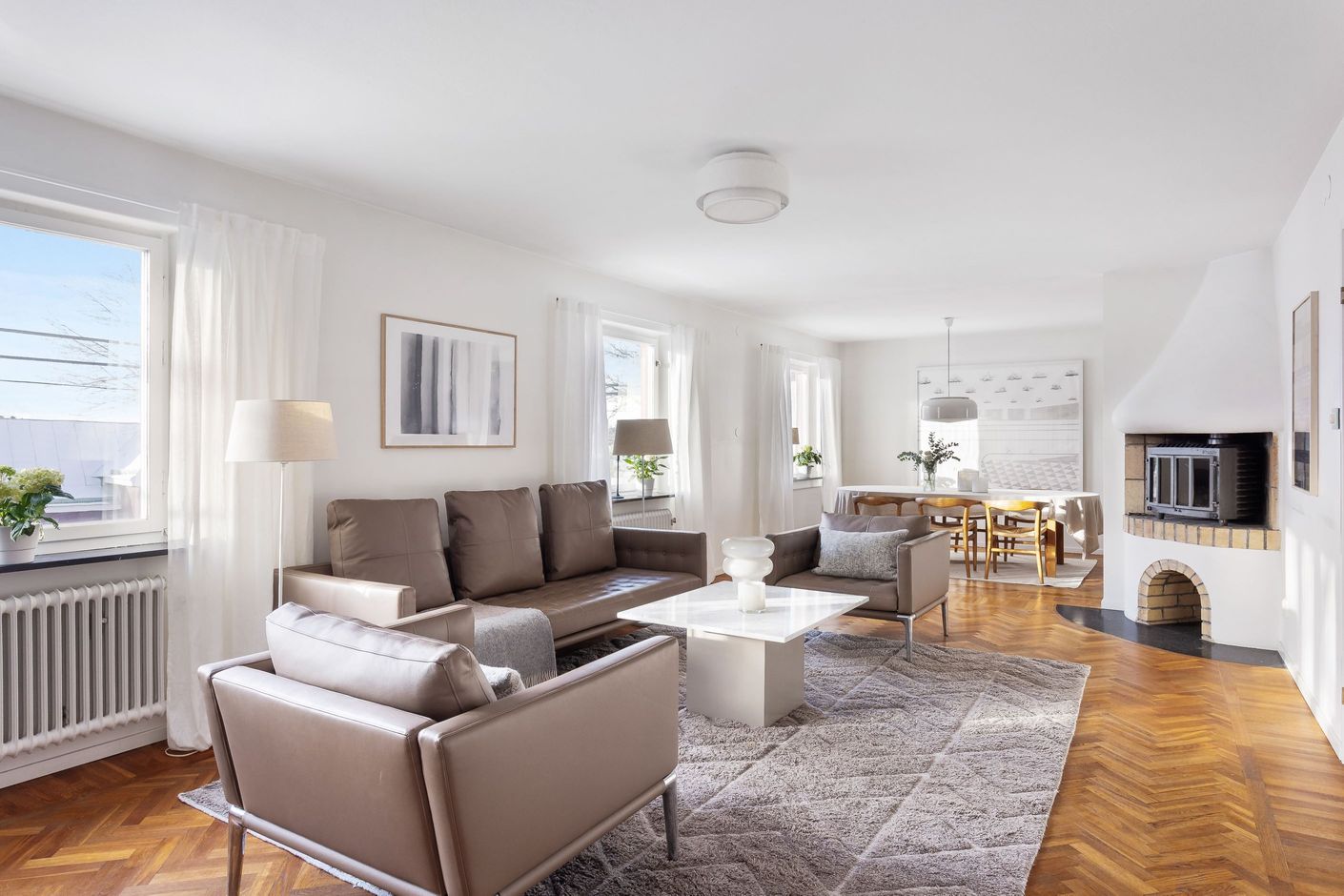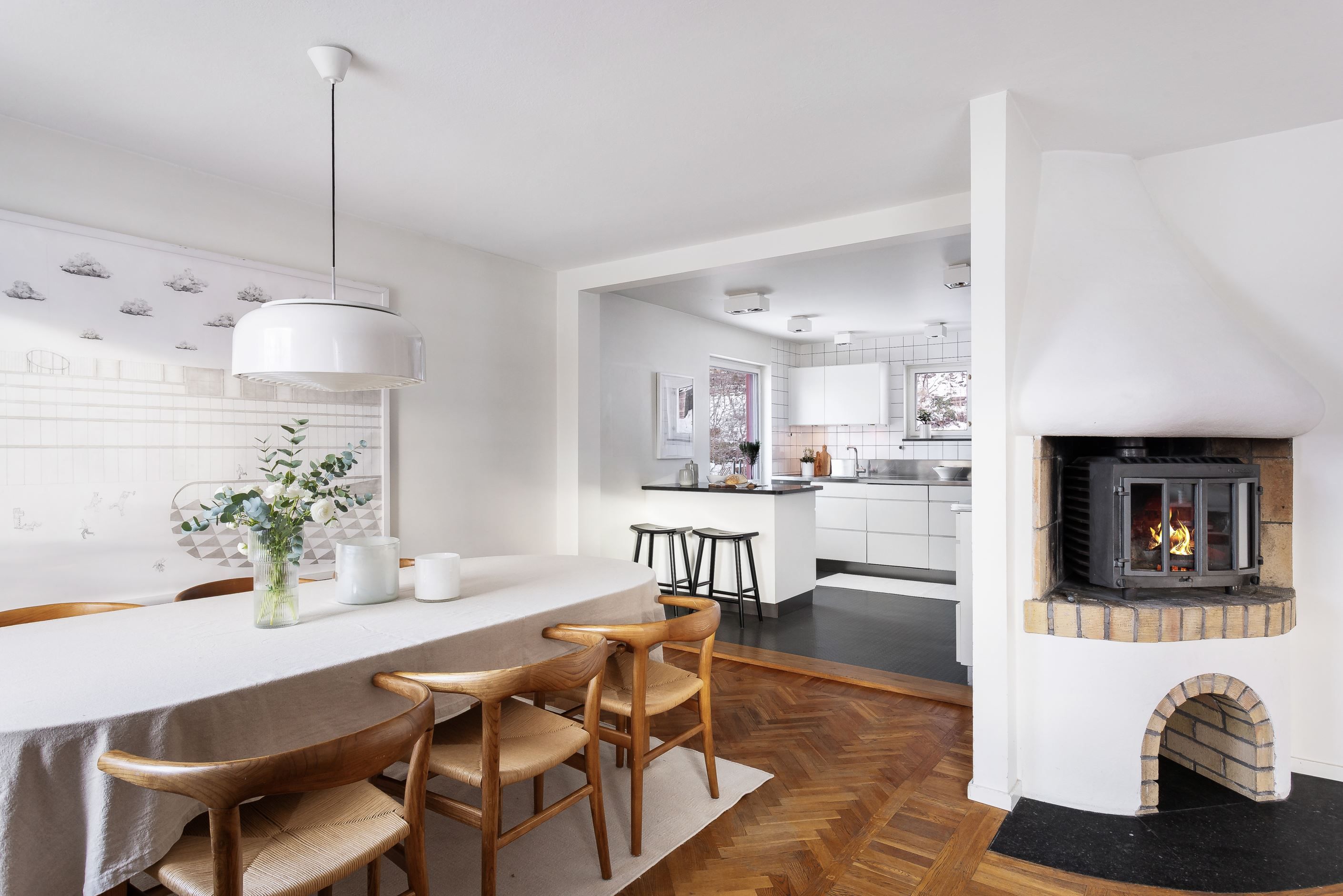 SÄLLSKAPSKAPSYTA där ljuset flödar in från generösa fönster i S/V. Mälarglitter och grönska ger en fin vy att lägga blicken på. Rummet i fil rymmer både sittgrupp framför den tidstrogna öppna spisen med brasinsats samt en väl tilltagen matsalsdel med plats för många. Stavlagda ekgolv i fiskbensmönster.