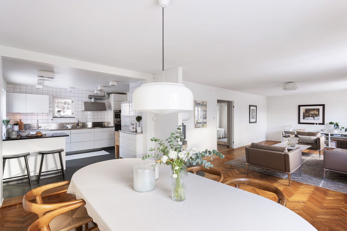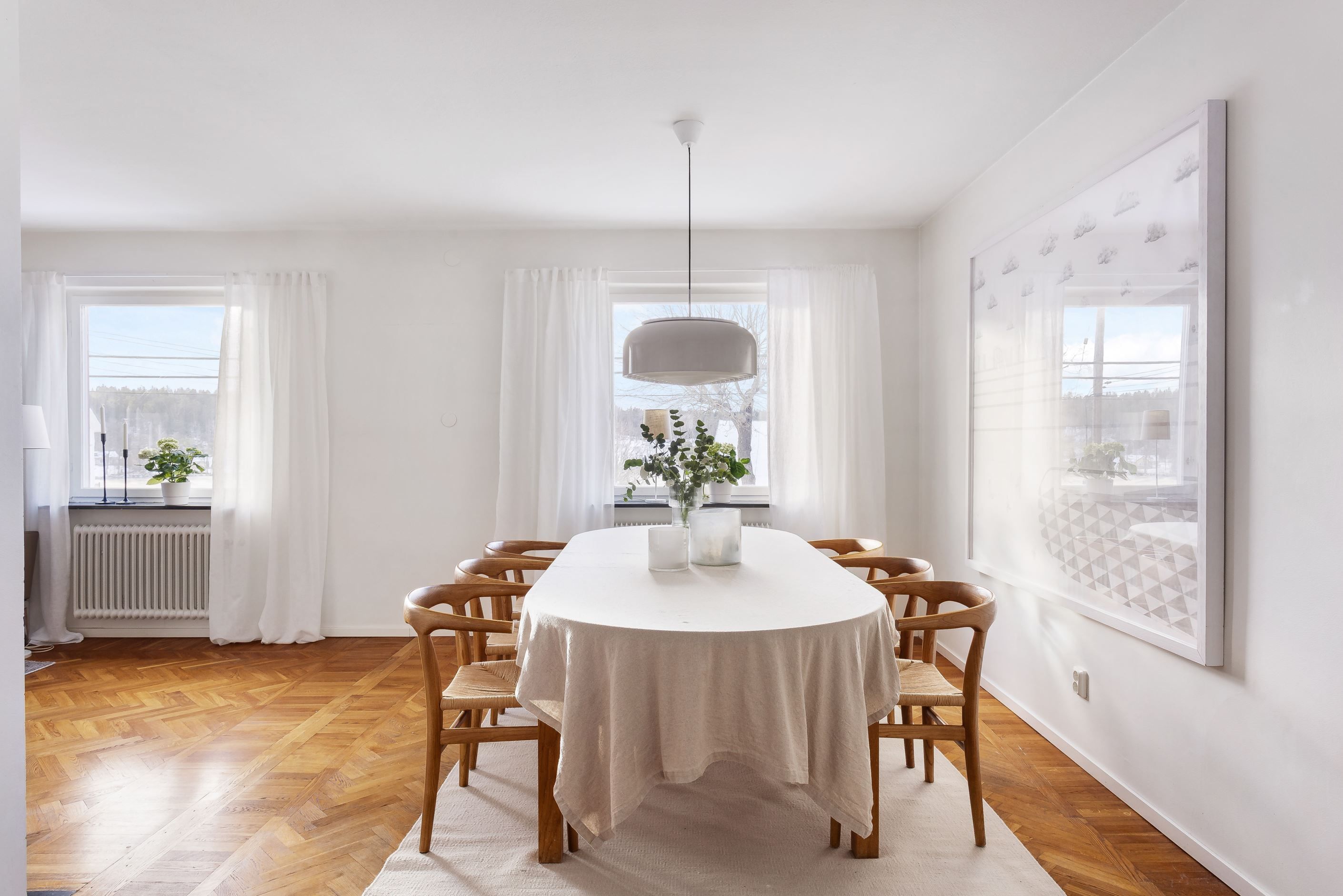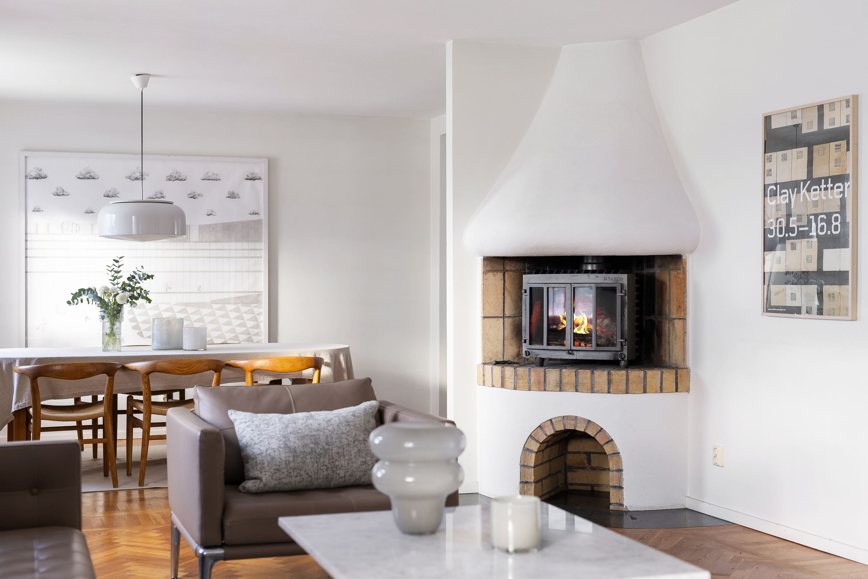 SÄLLSKAPSKAPSYTA där ljuset flödar in från generösa fönster i S/V. Mälarglitter och grönska ger en fin vy att lägga blicken på. Rummet i fil rymmer både sittgrupp framför den tidstrogna öppna spisen med brasinsats samt en väl tilltagen matsalsdel med plats för många. Stavlagda ekgolv i fiskbensmönster.