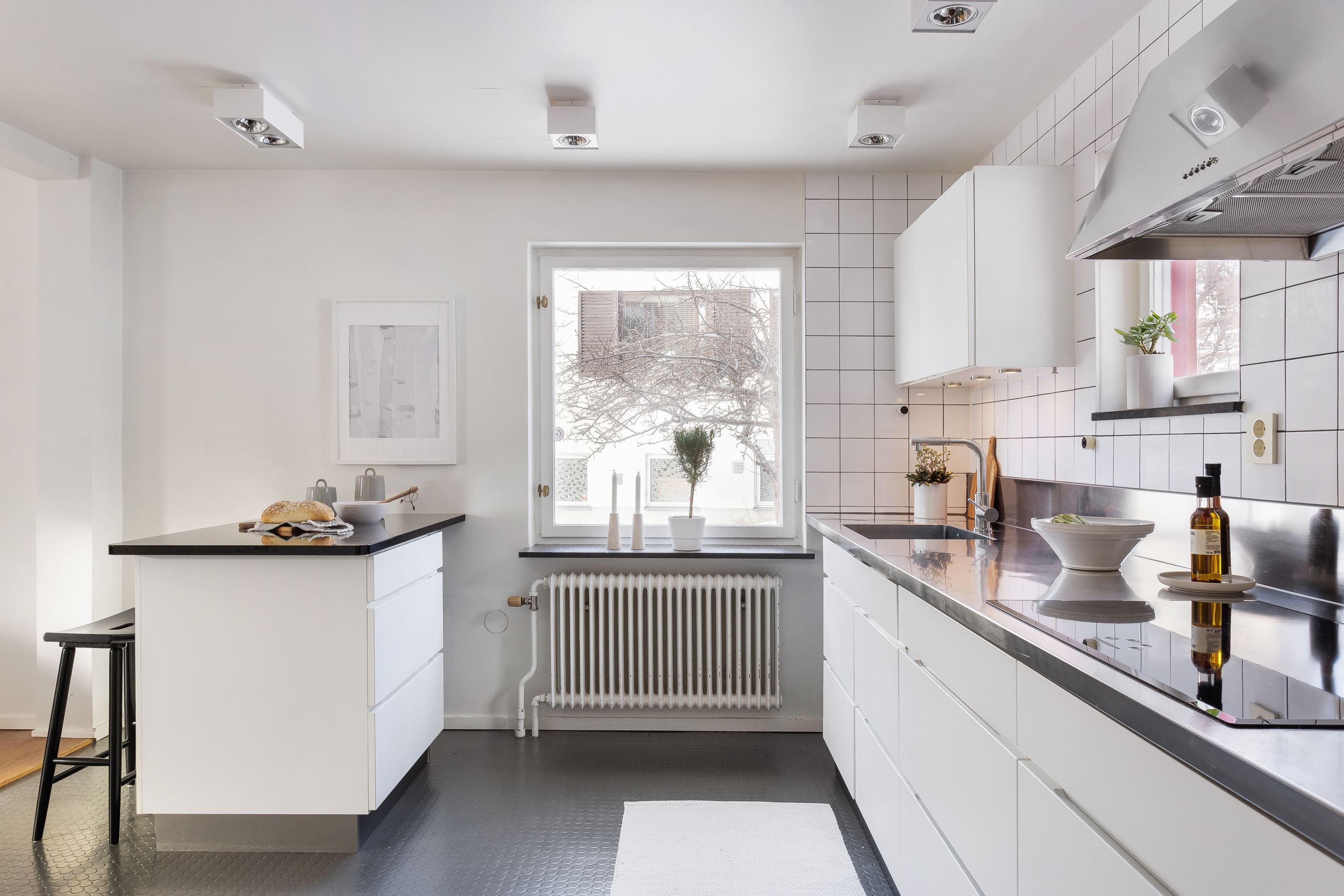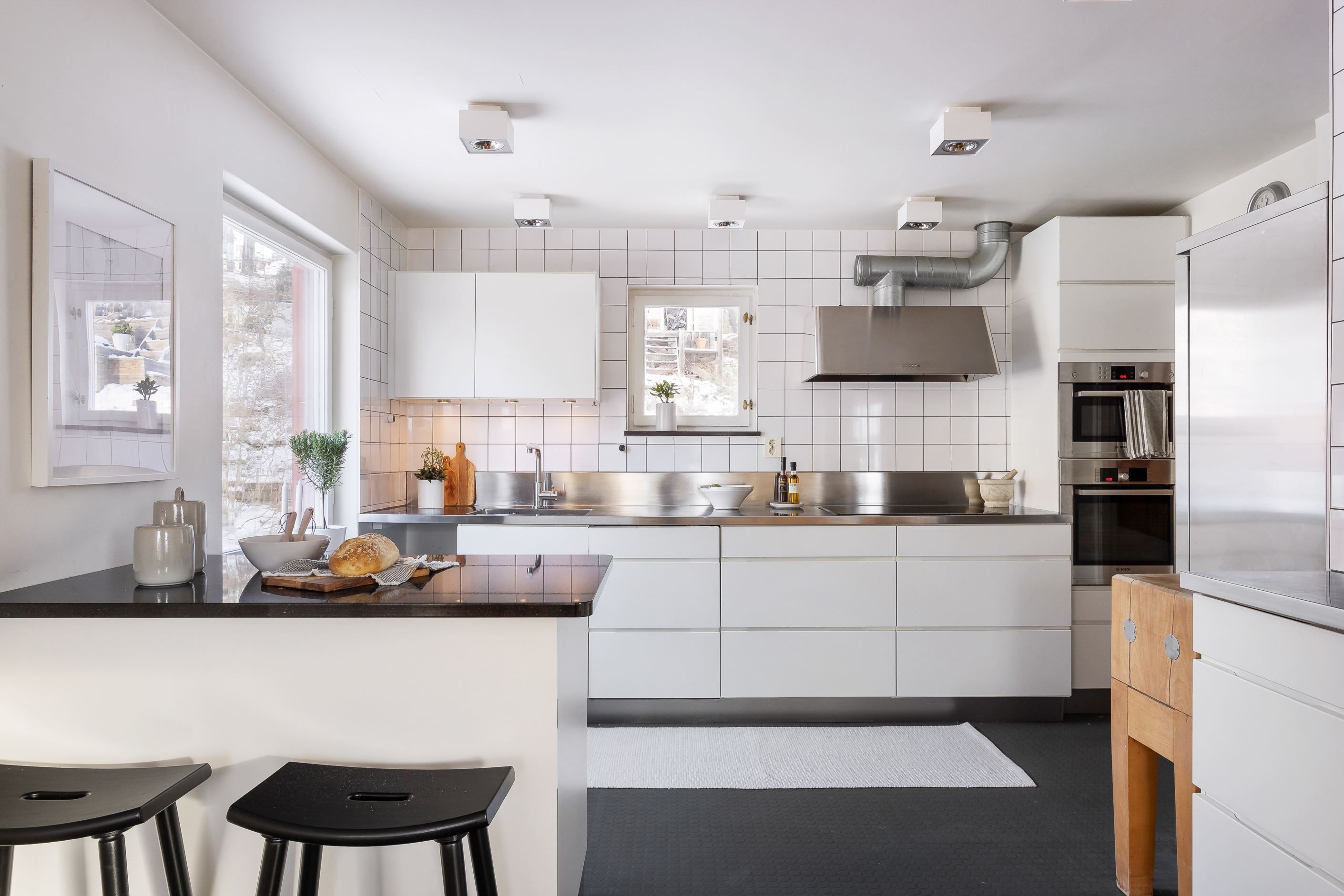 KÖK som är smakfullt renoverat och fullt utrustat, i öppen planlösning med sällskapsytan. Köksö med sittplatser delar av rummen. Trivsam utsikt i tre väderstreck där det charmiga fönstret mot trädgården, som sitter bra placerat invid diskhon, ger morgonsol och en fin utsikt mot den varierade vackra tomten och vidare mot allmänningen. Gavelfönster som ger en sjöglimt åt väster.