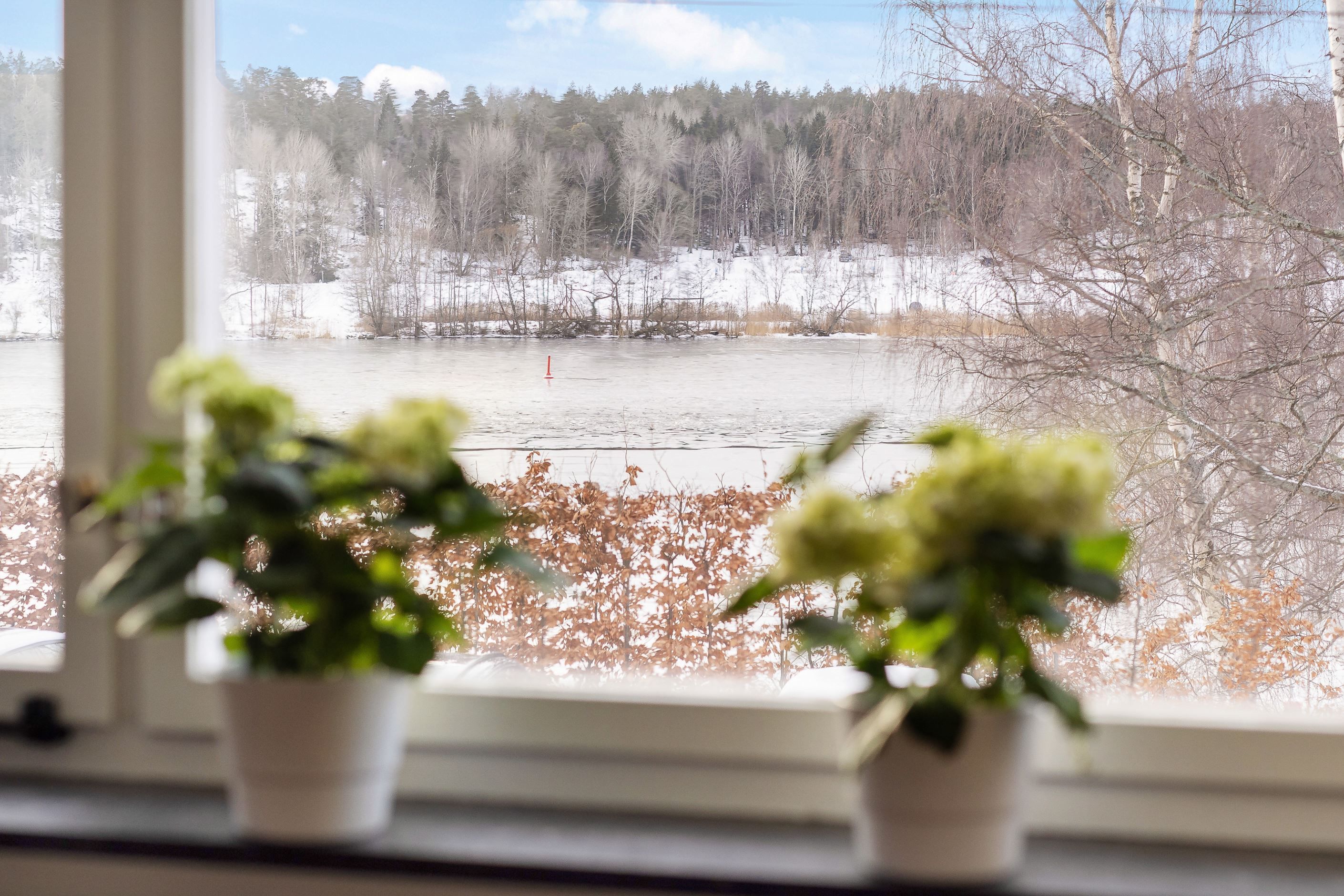 Fin sjöutsikt mellan tegeltak och grönska!