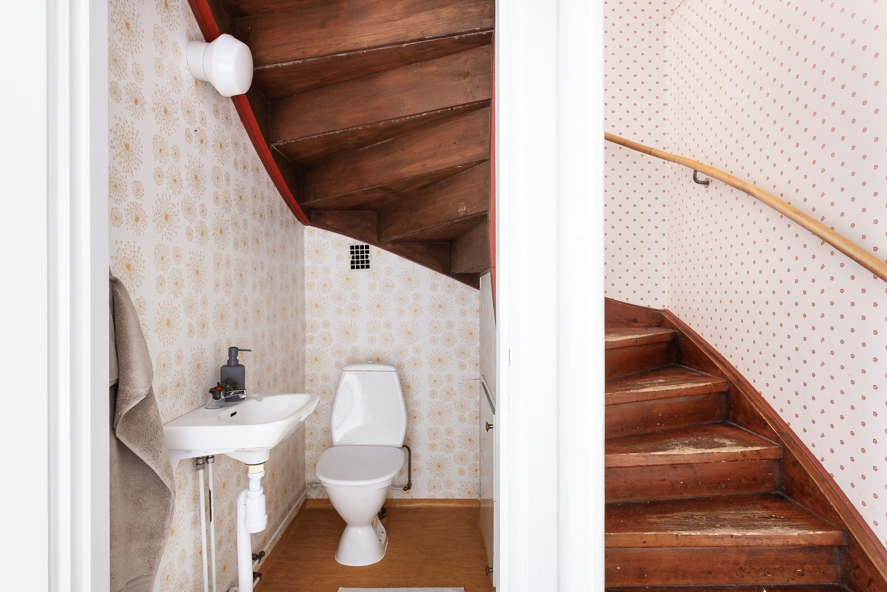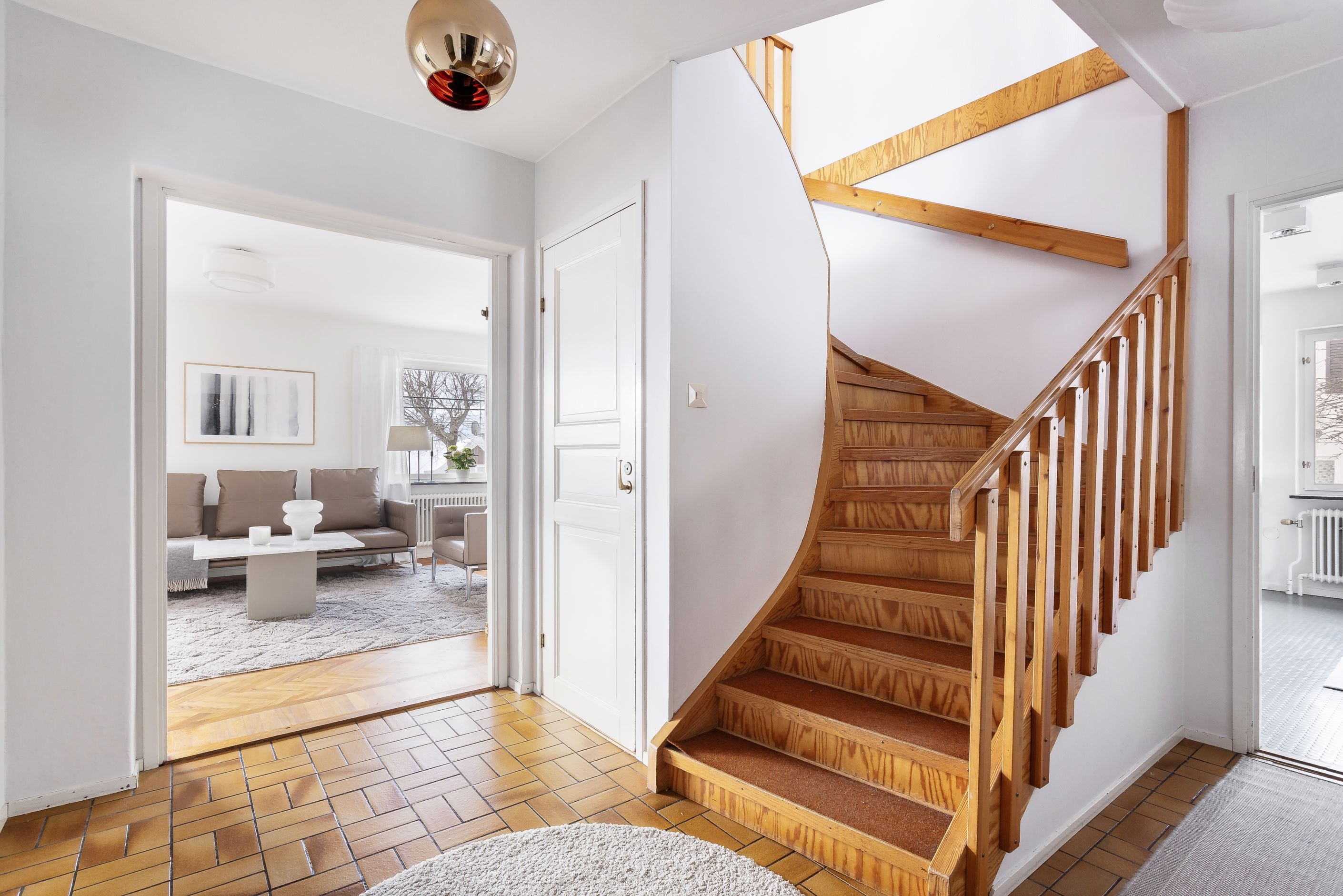 NEDRE HALL nås via svängd trappa i trä. Avhängningsyta och förvaringsmöjligheter.