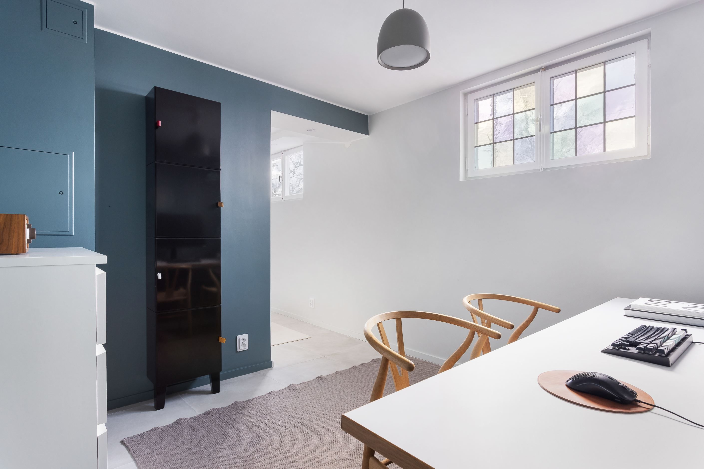 ARBETSRUM/SOVRUM i inrett källarrum med ekgolv och fint ljus från generöst blyinfattat källarfönster i söderläge. Lämpar sig väl som tonårsrum eller ett avskilt arbetsrum eller möjligen en blivande uthyrningdel?