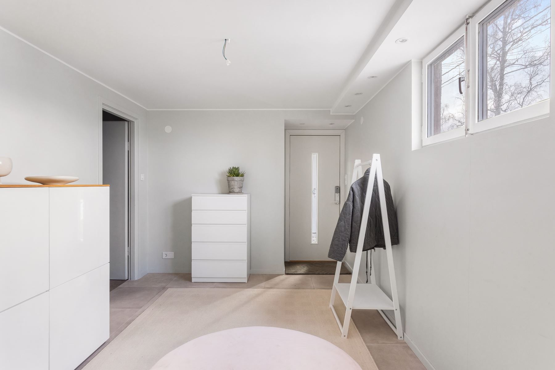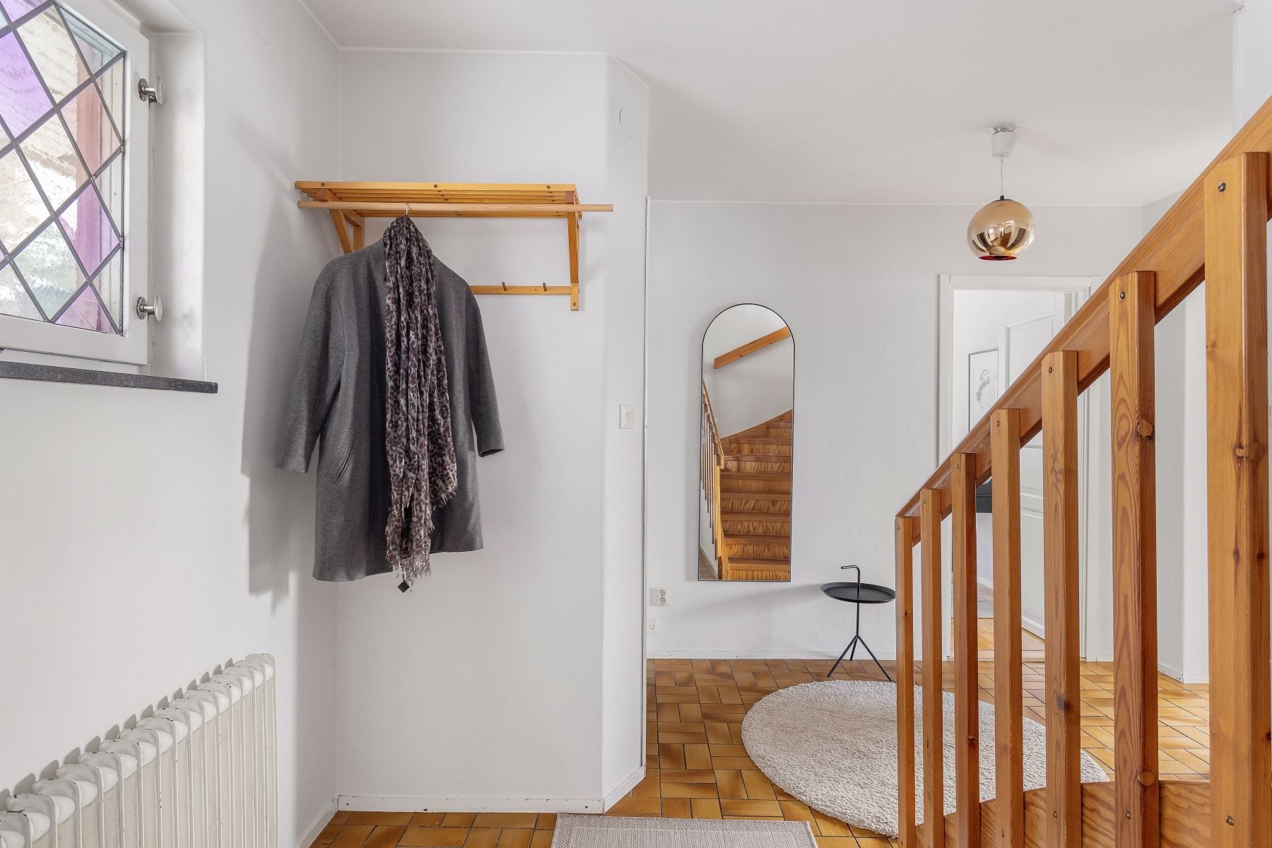 NEDRE HALL nås via svängd trappa i trä. Avhängningsyta och förvaringsmöjligheter.