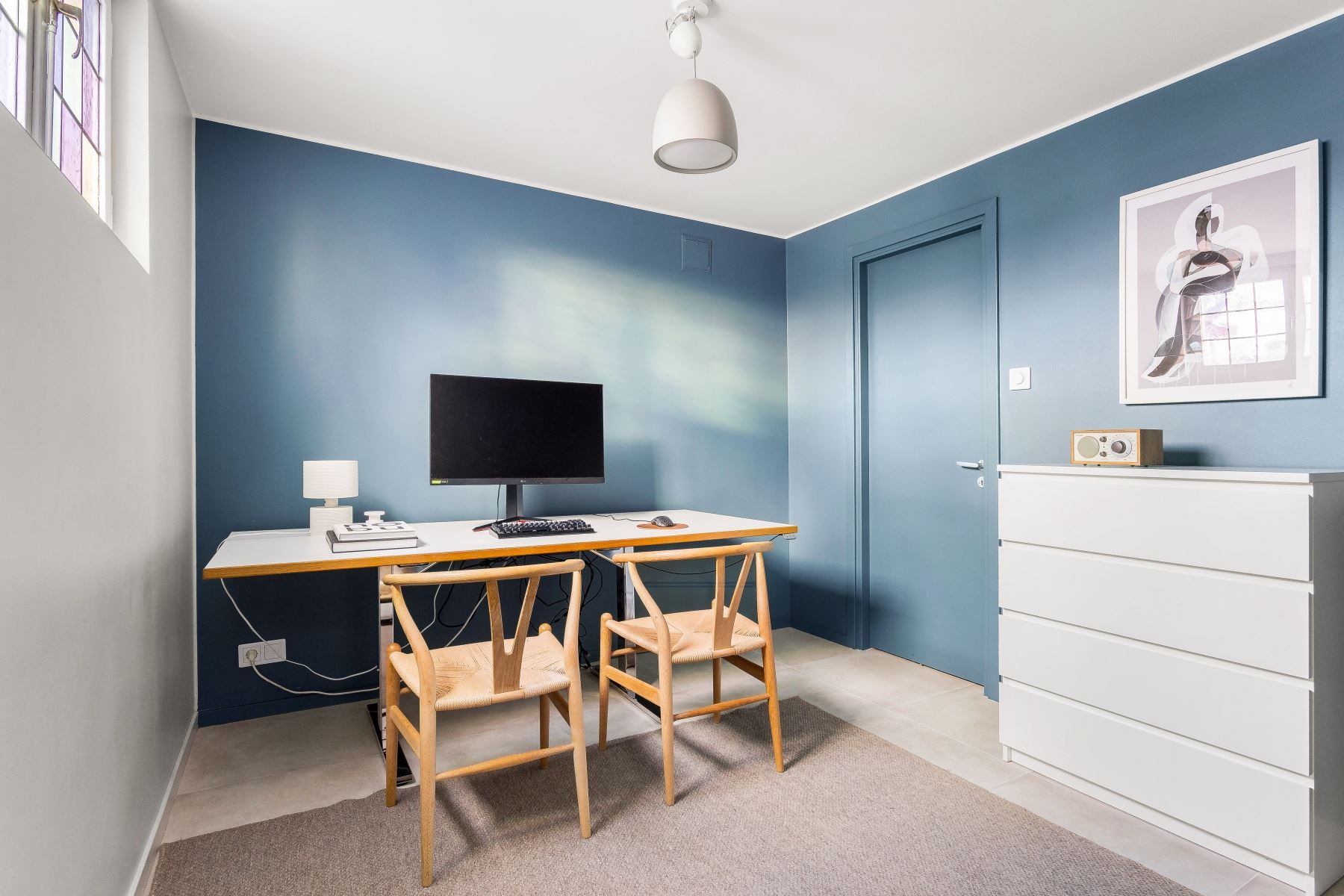 ARBETSRUM/SOVRUM i inrett källarrum med ekgolv och fint ljus från generöst blyinfattat källarfönster i söderläge. Lämpar sig väl som tonårsrum eller ett avskilt arbetsrum eller möjligen en blivande uthyrningdel?