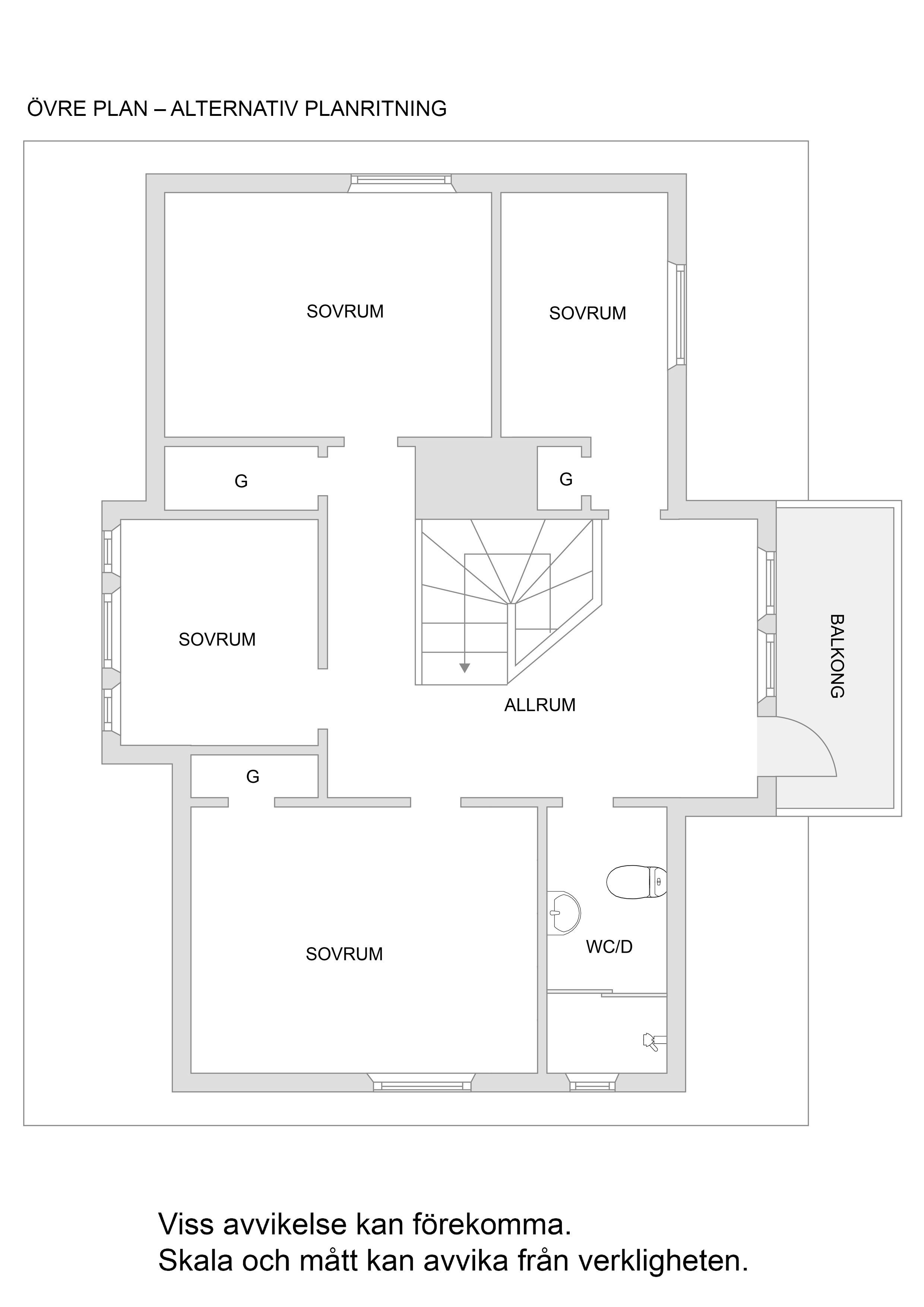 ALLRUM som nås via trätrappa leder upp till övervåningens luftiga allrum. Stora fönster ut mot den egna tomten samt utgång till generös balkong, som sommartid är en del av allrummet och där morgon- och förmiddagssolen flödar - härligt att äta frukost här om man inte hellre vill sitta på den lilla farstukvisten under balkongen, precis intill ytterdörren dit de första morgonsolstrålarna når. Allrummet lämpar sig väl som TV-hörna, lekrum eller kanske biblioteksdel eller blomsterrum. Trägolv.
