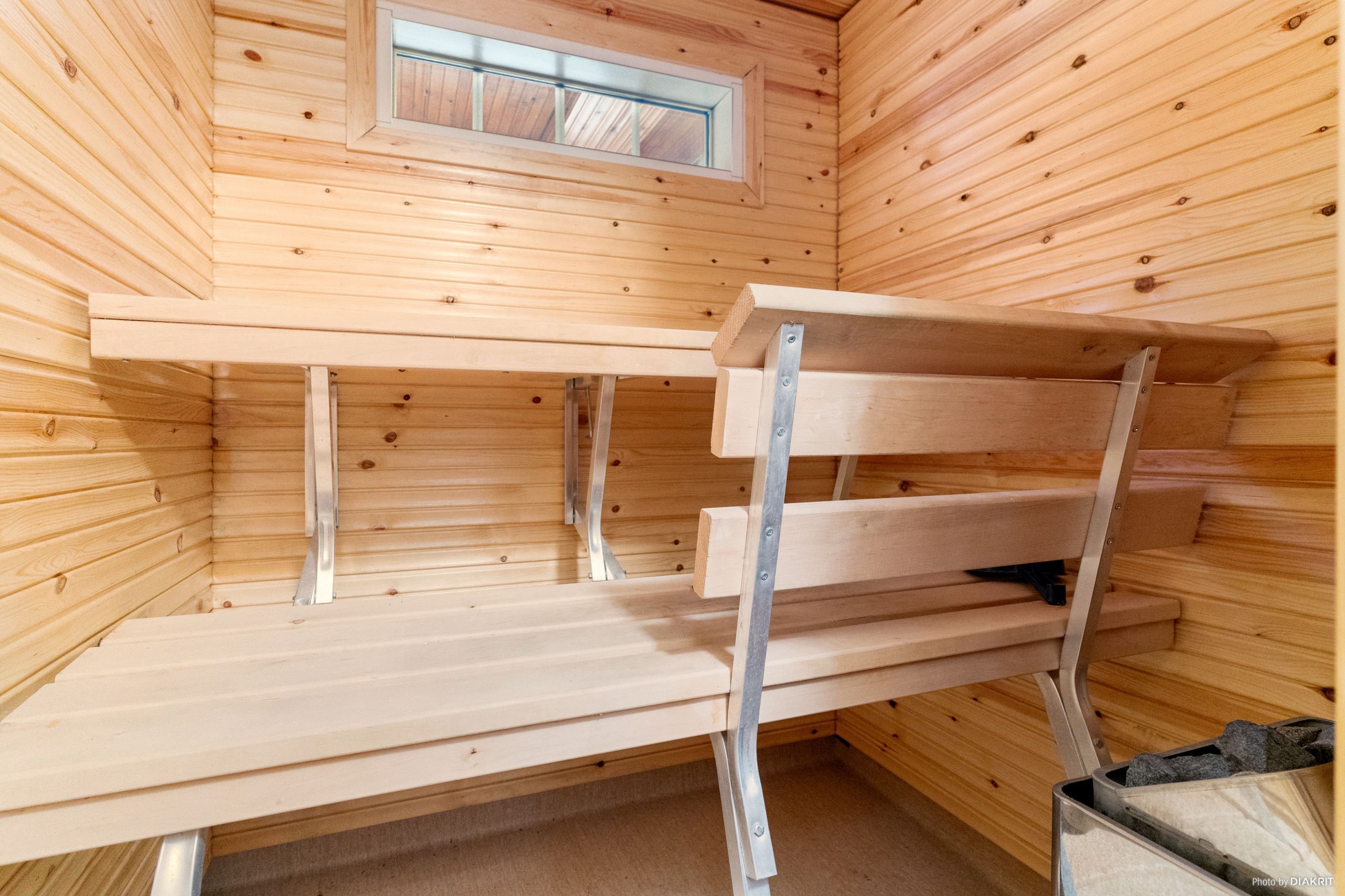 På övre plan möts du av en hall och ett rymligt sovrum. Här finns även ett badrum med åtkomst till bastu för extra avkoppling. För extra komfort finns även ett välutrustat badrum och WC placerad på entréplan.