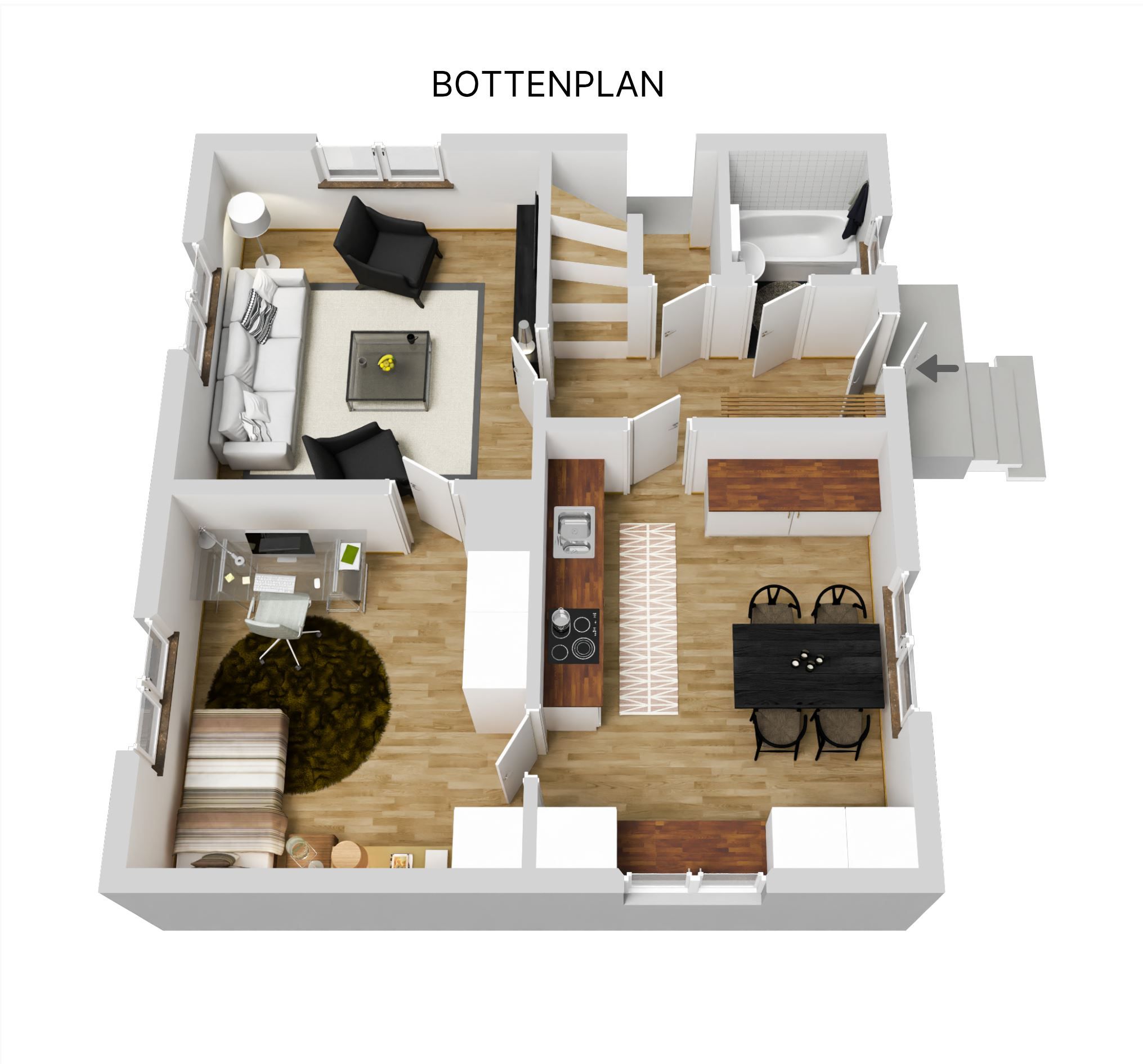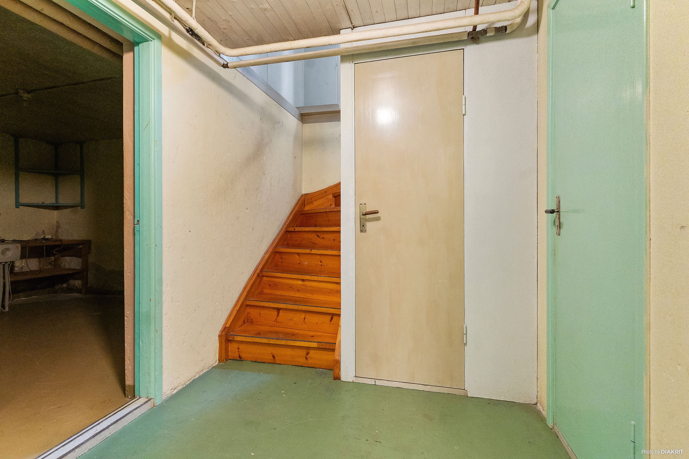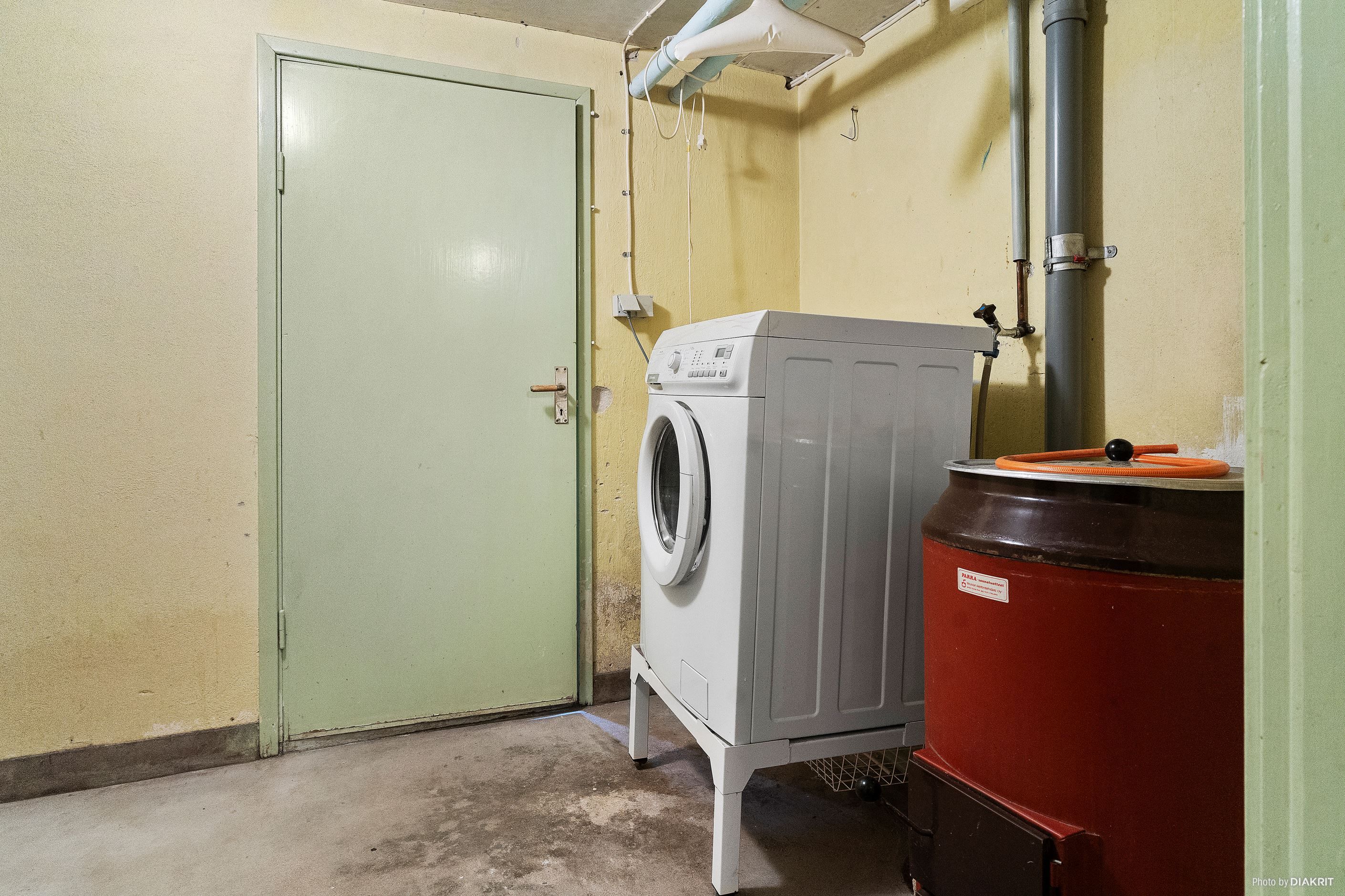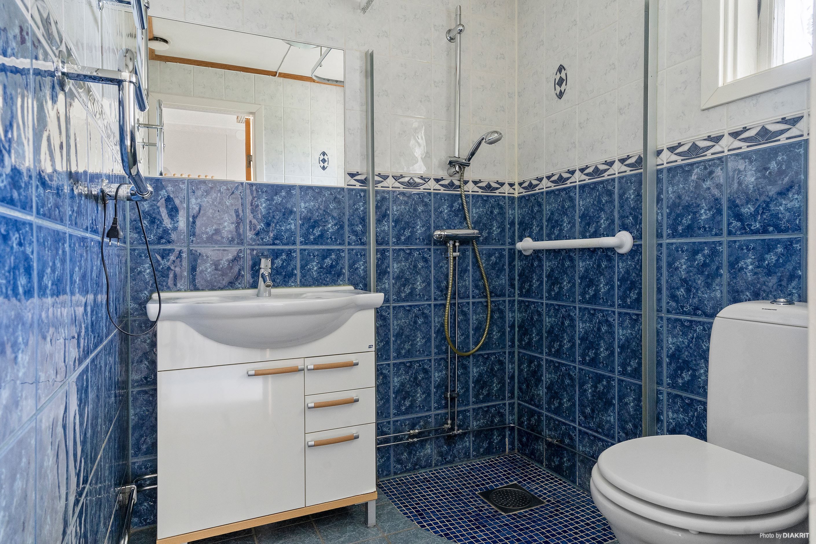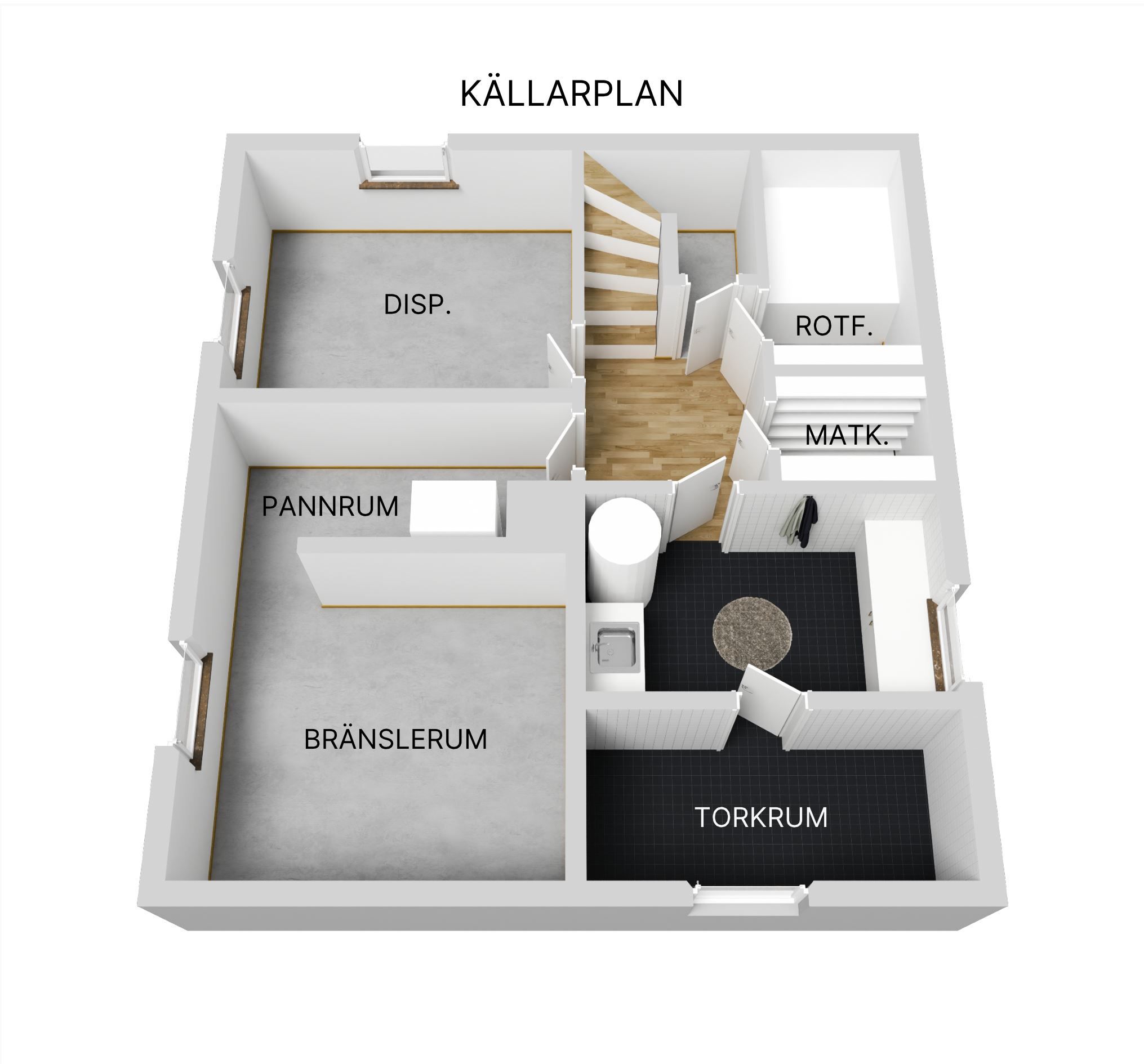 Badrummet är väl utrustat och har dessutom golvvärme för extra komfort. I källarplanet finns det gott om förvaringsmöjligheter, pannrum samt tvättstuga med tvättmaskin.
