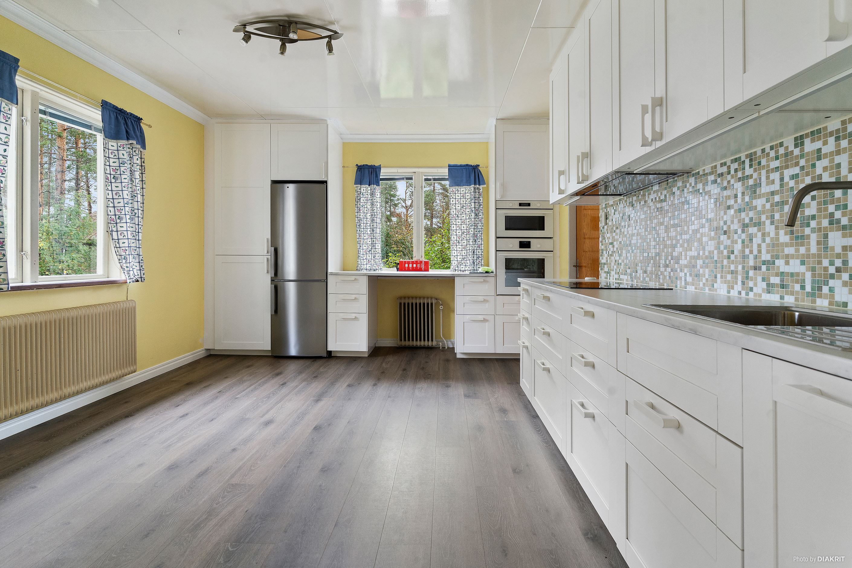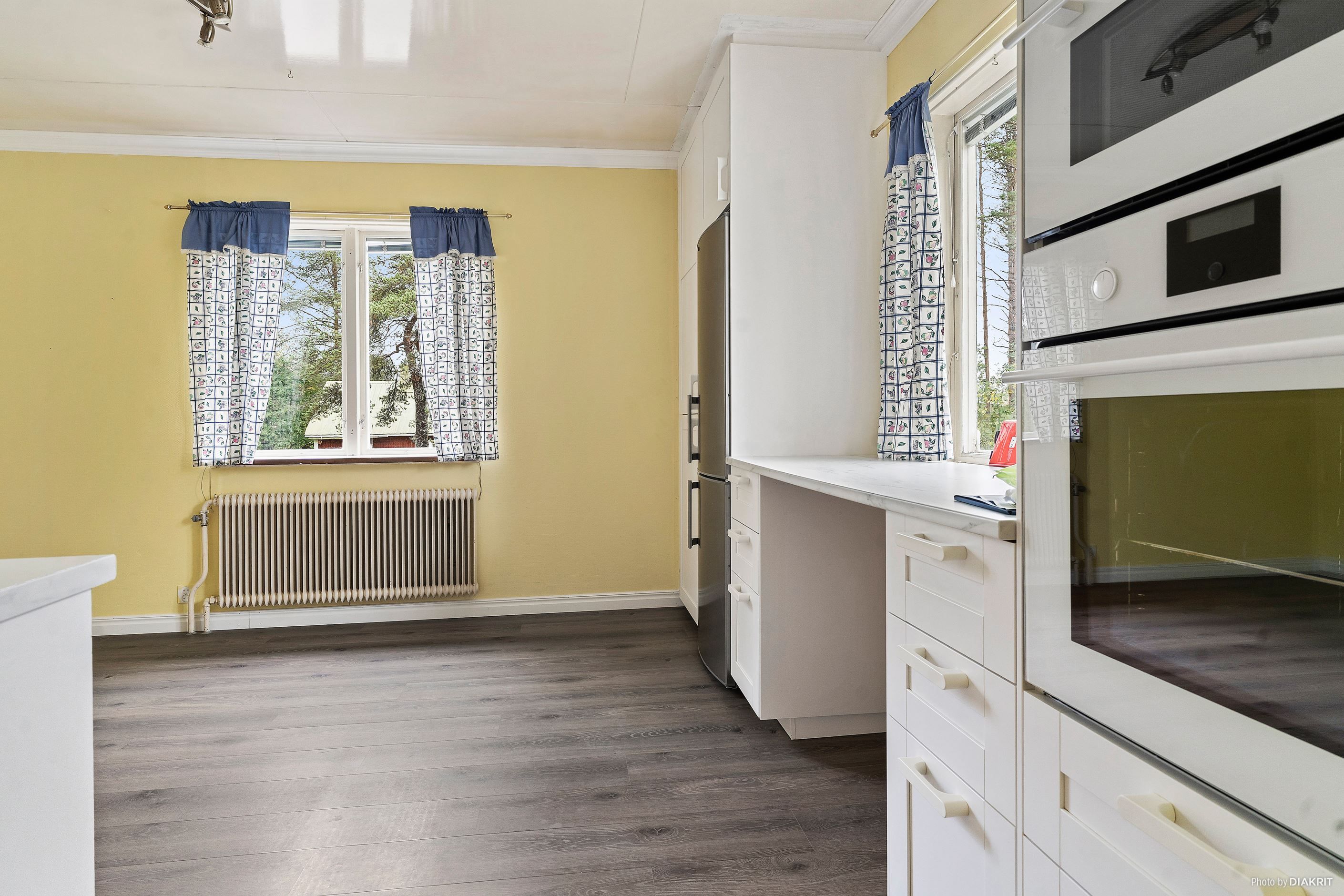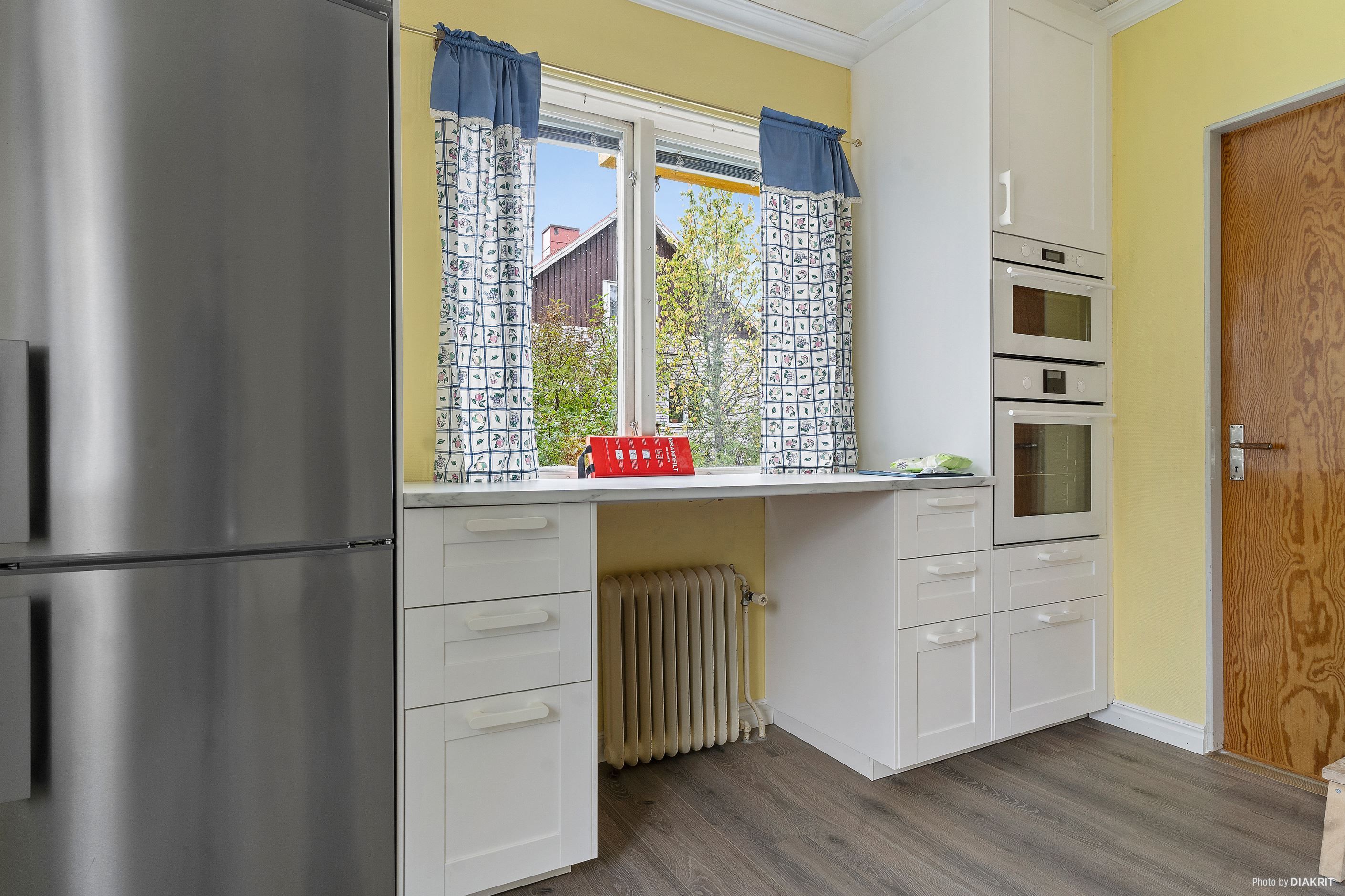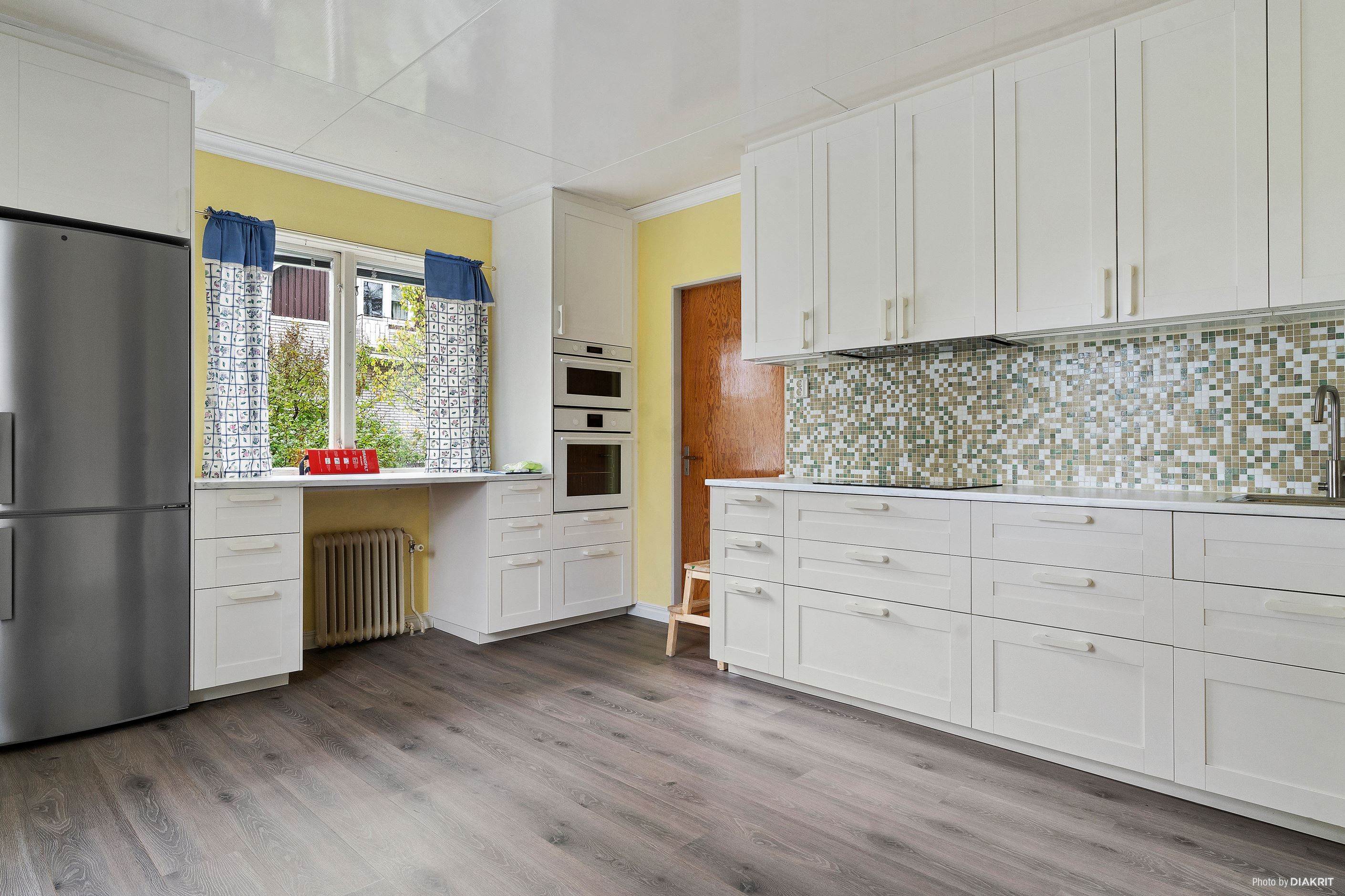 Köket som har renoverats omkring 2017-2018 har stilren inredning från Ikea och välutrustat med modern maskinell utrustning. Finns gott om utrymme för matlagning och gemenskap med familjen. I anslutning finns ett charmigt vardagsrum med fint parkettgolv. Perfekt yta för umgänge och avkoppling.