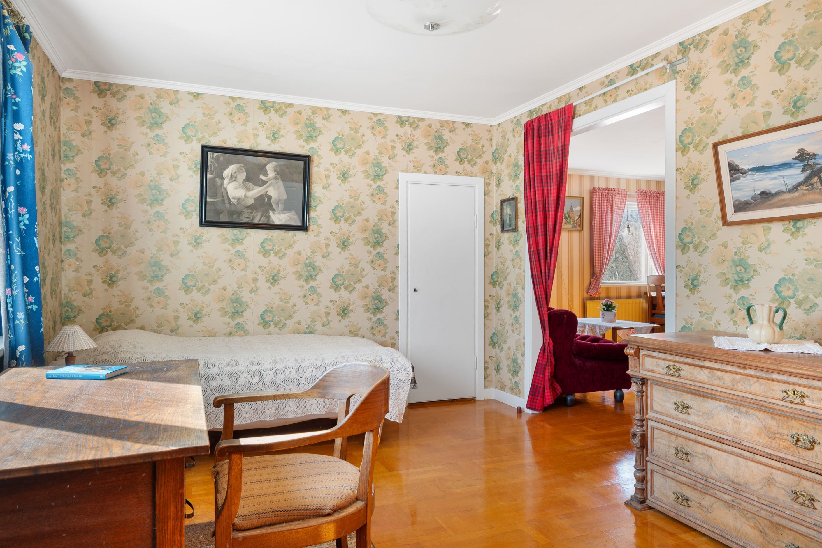 Rum/sovrum med parkett och tapetserade väggar.