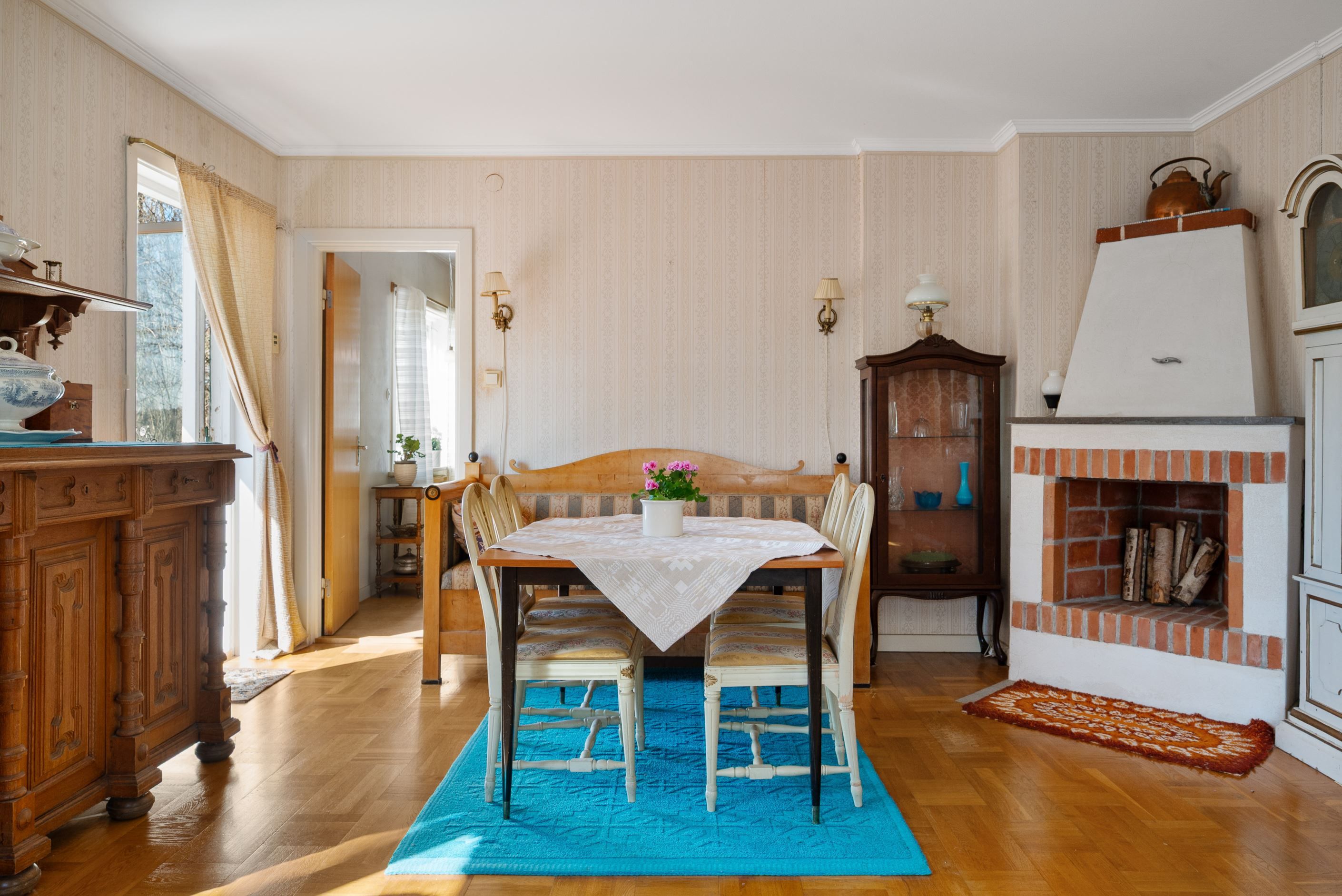 Matrum med parkettgolv och tapetserade väggar. Öppen spis som skall kontrolleras innan eldning. Utgång till balkong.