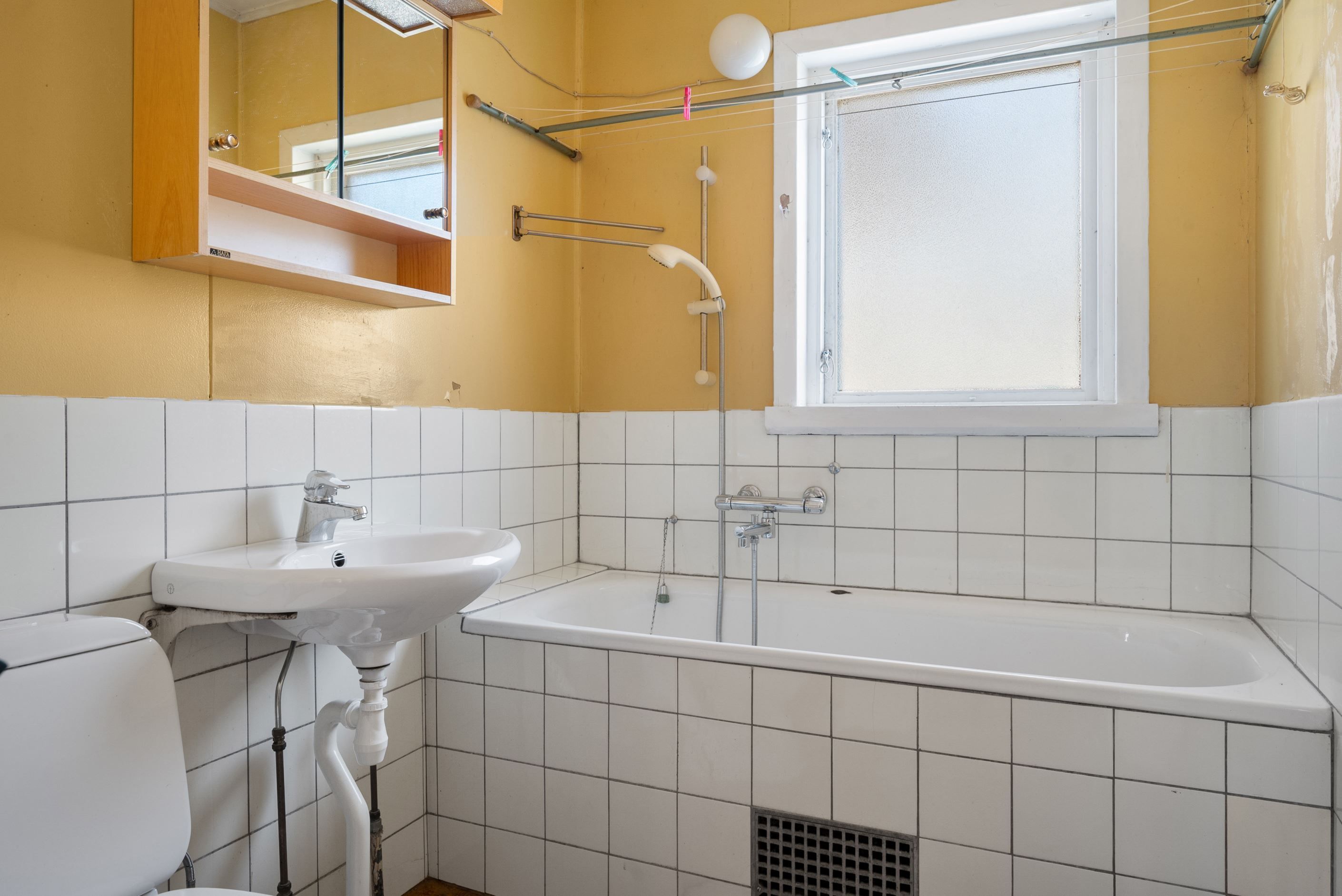 Badrum i original med badkar, wc och handfat.