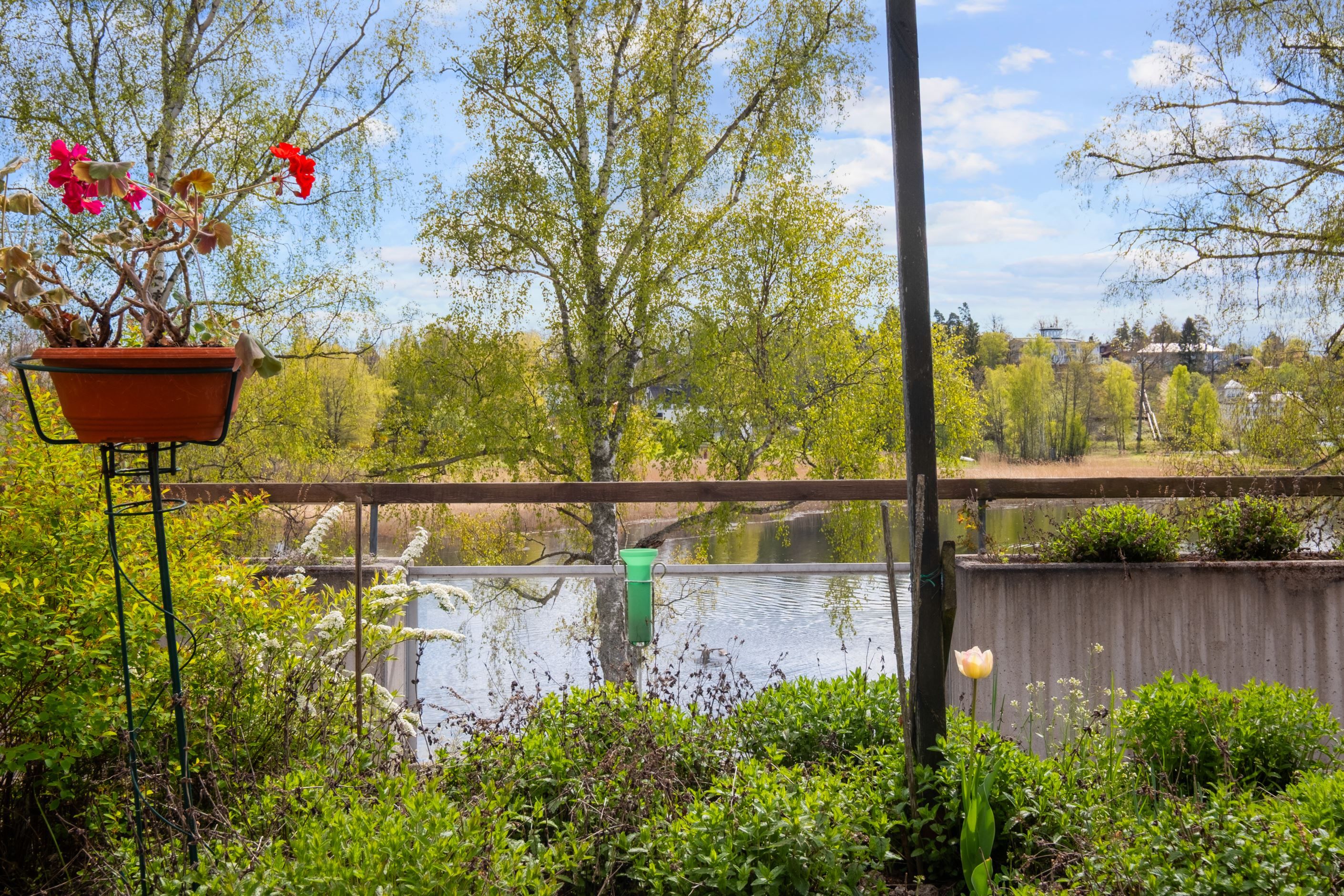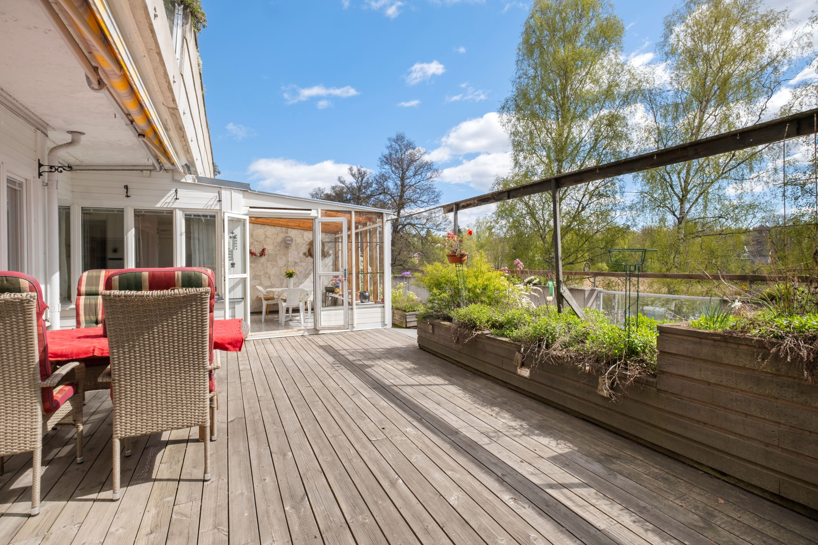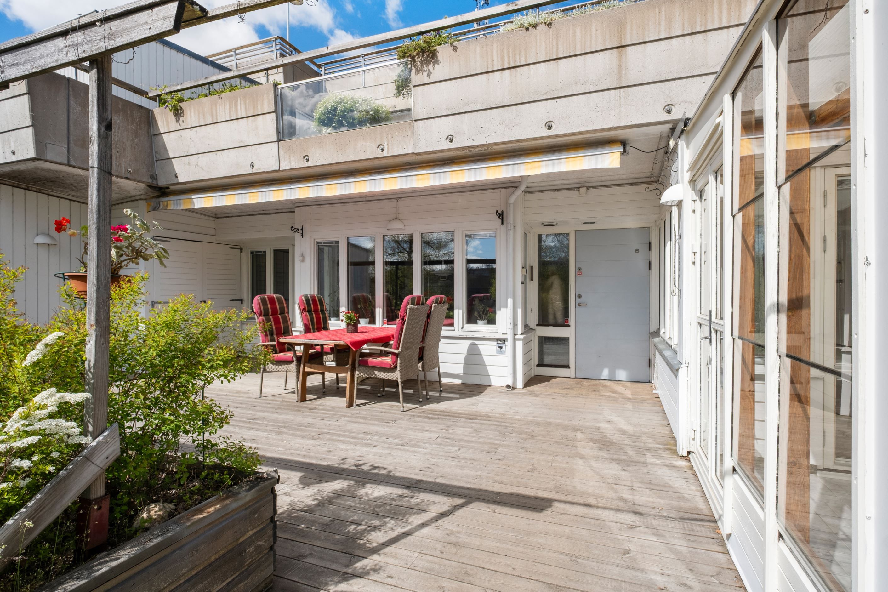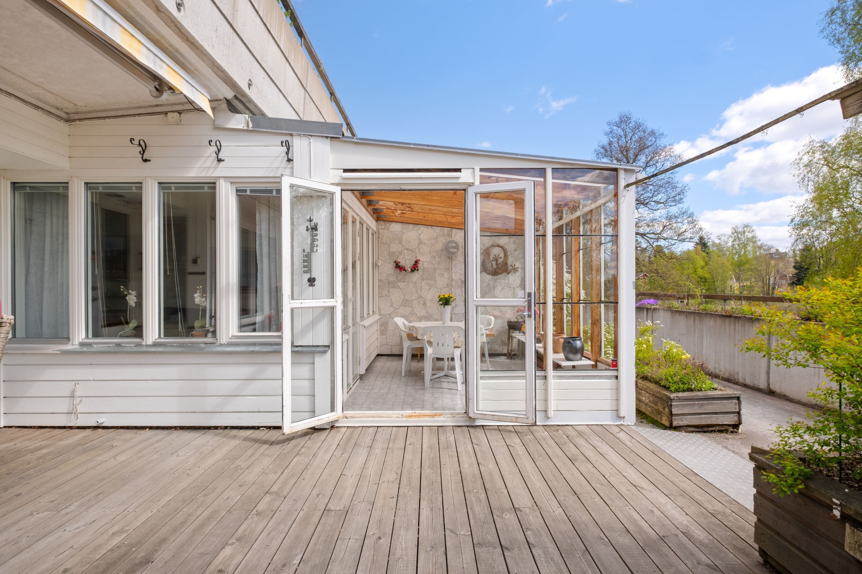Lägenhetens genomtänkta planlösning ger en luftig känsla, där det ljusa vardagsrummet smidigt ansluter till ett inglasat uterum. Här kan du njuta av den fria utsikten året runt. Köket är funktionellt med gott om arbetsytor och en inbjudande matplats. Via köket når du även det rofyllda sovrummet som erbjuder direktaccess till uteplatsen.