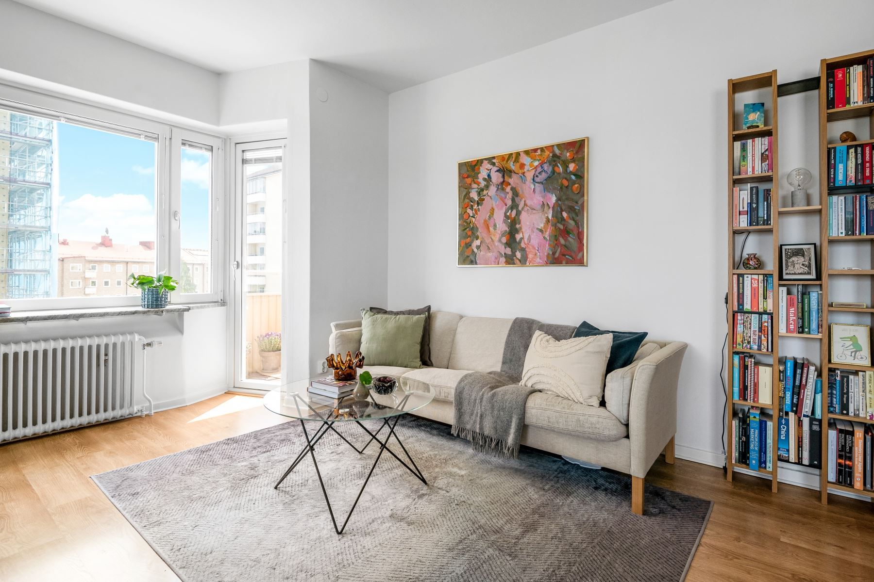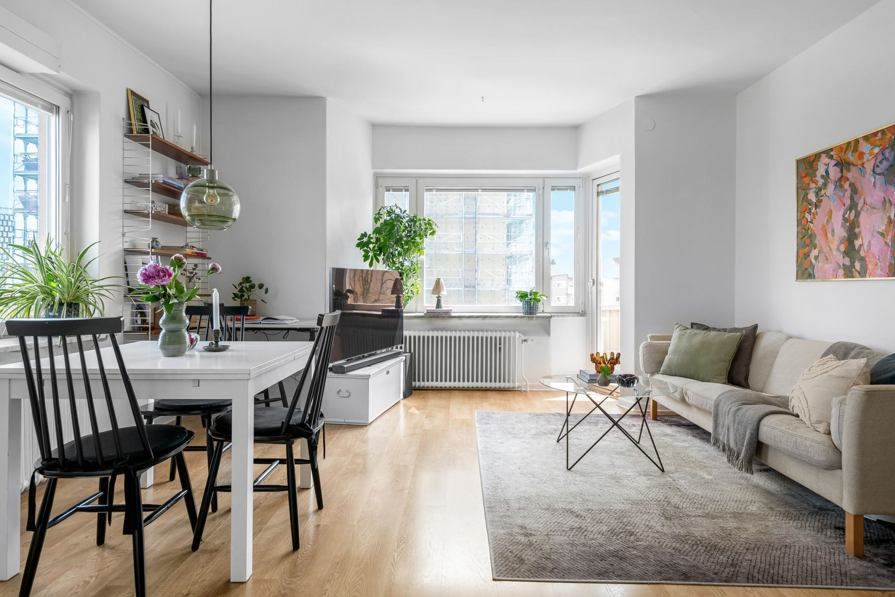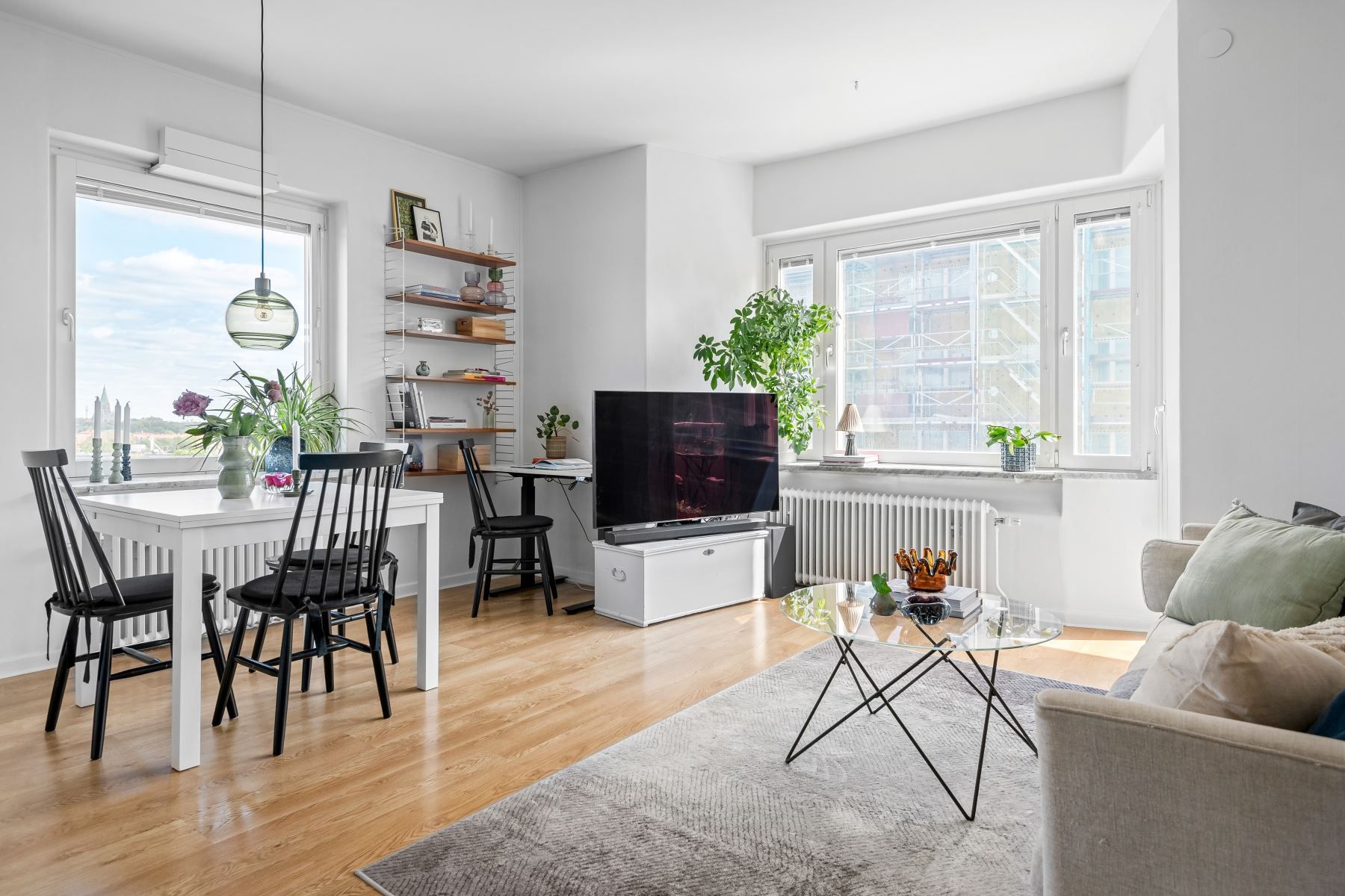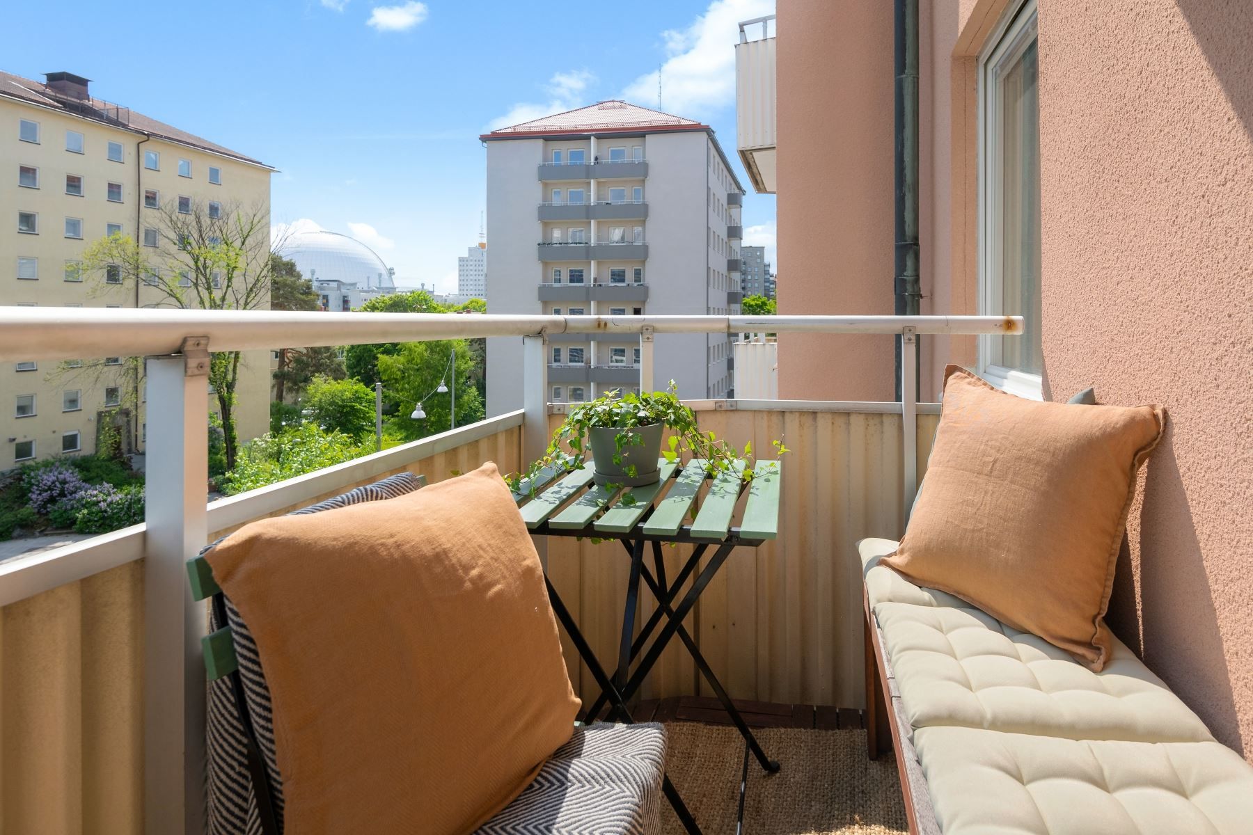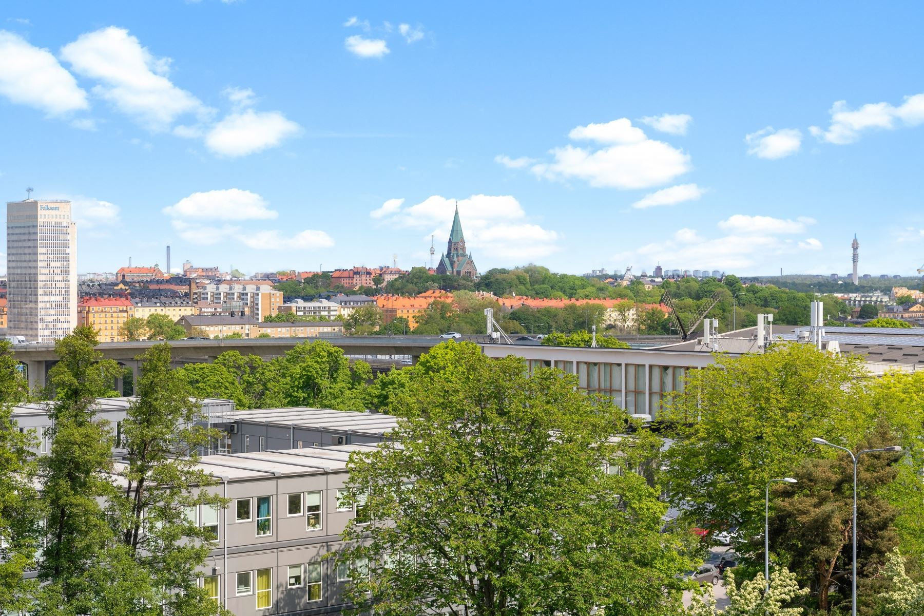 Här bor du i högt läge med utsikt över vackra Södermalm och balkong mot öster. Bostaden bjuder på en optimal planlösning fördelad på vardagsrum, kök, sovrum, badrum och en rymlig hall. Tack vare gavelläget finns här fönster i två väderstreck vilket bidrar till härligt ljusinsläpp i hela bostaden, där vackra originaldetaljer så som fönsterbrädor och hallgolv i natursten är bevarade. Det lättmöblerade vardagsrummet är bostadens mittpunkt, perfekt för sociala sammankomster och middagar eller lugna hemmakvällar framför TV:n. Härifrån når du också den härliga balkongen i österläge med plats för att avnjuta morgonkaffet eller äta goda sommarmiddagar. Planlösningen är öppen mot det rymliga och moderna köket med gott om förvaring och arbetsyta för att bereda smakliga måltider. Från vardagsrum, kök och balkong kan du njuta av den härliga utsikten, där Södermalms kyrkor och skyskrapor ståtar utanför fönstret. Den stora hallen nyttjas idag framförallt för förvaring med avhängningsmöjligheter samt generöst med garderobsutrymme. Tack vare den inre tamburen kan man här också inreda för ett hemmakontor, om så önskas. Det mysiga sovrummet är rogivande och rymmer allt du behöver, inklusive den stora garderoben. Badrummet är fräscht och modernt med ytskikt av s.k. claystone, en miljövänlig puts tillverkad av sedimentär bergart, vilket ger badrummet en snygg sten- eller betongaktig känsla. Här finner du WC, dusch med duschvägg av glas, handfat med kommod, badrumsskåp med spegel samt tvättmaskin. Kuriosa i sammanhanget är att du från toalettsitsen, med dörren på glänt, kan beskåda Kaknästornet på andra sidan stan!