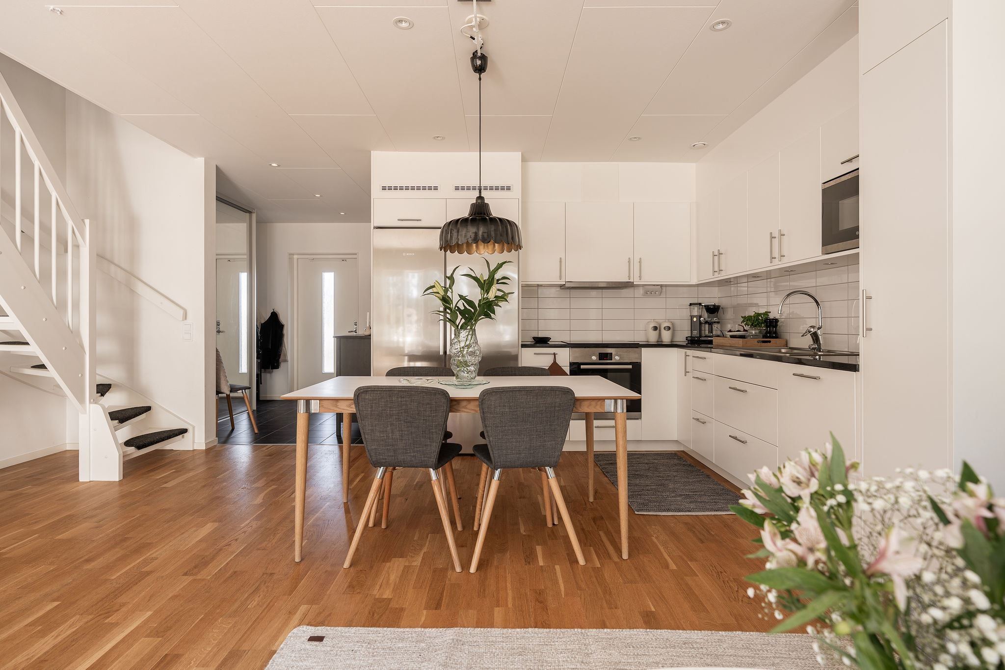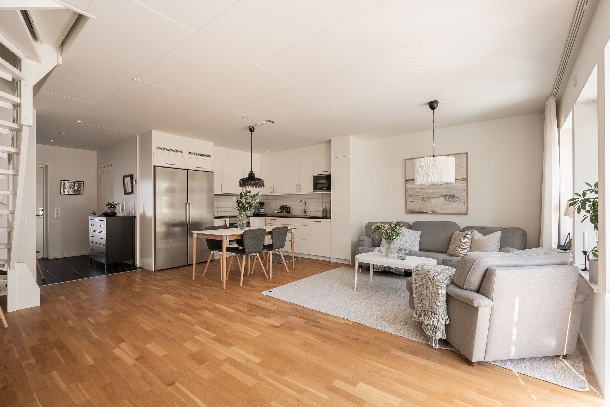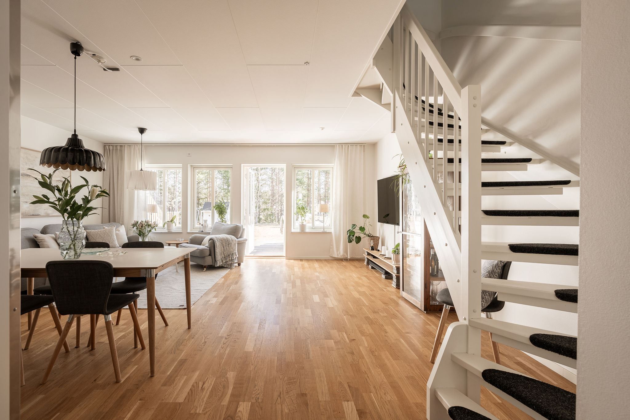 Här erbjuds ni ett modernt och lättskött hem med rymlig baksida som vetter mot skogen vilket skapar en privat känsla och avskildhet. Bostaden omfattar 99 välplanerade kvadratmeter i genomgående gott skick, fördelade på två funktionella våningsplan.