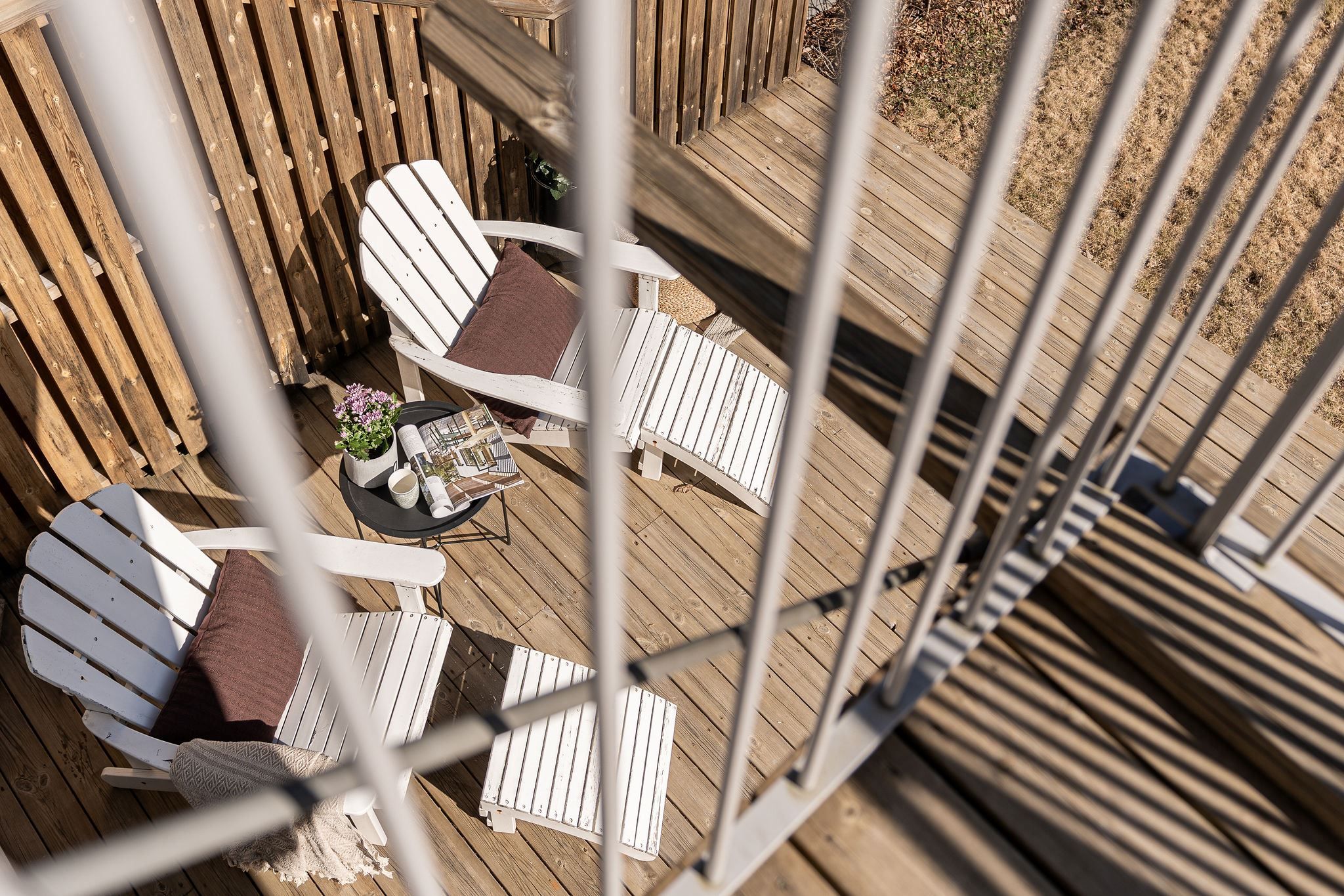 Utemiljön är en av bostadens stora tillgångar, med en generös solterrass i attraktivt solläge – perfekt för sommarens alla stunder. Till bostaden hör även två parkeringsplatser i direkt anslutning till entrén samt en carport i länga, vilket ingår i avgiften. Externt förråd finns även i nära anslutning till bostaden.