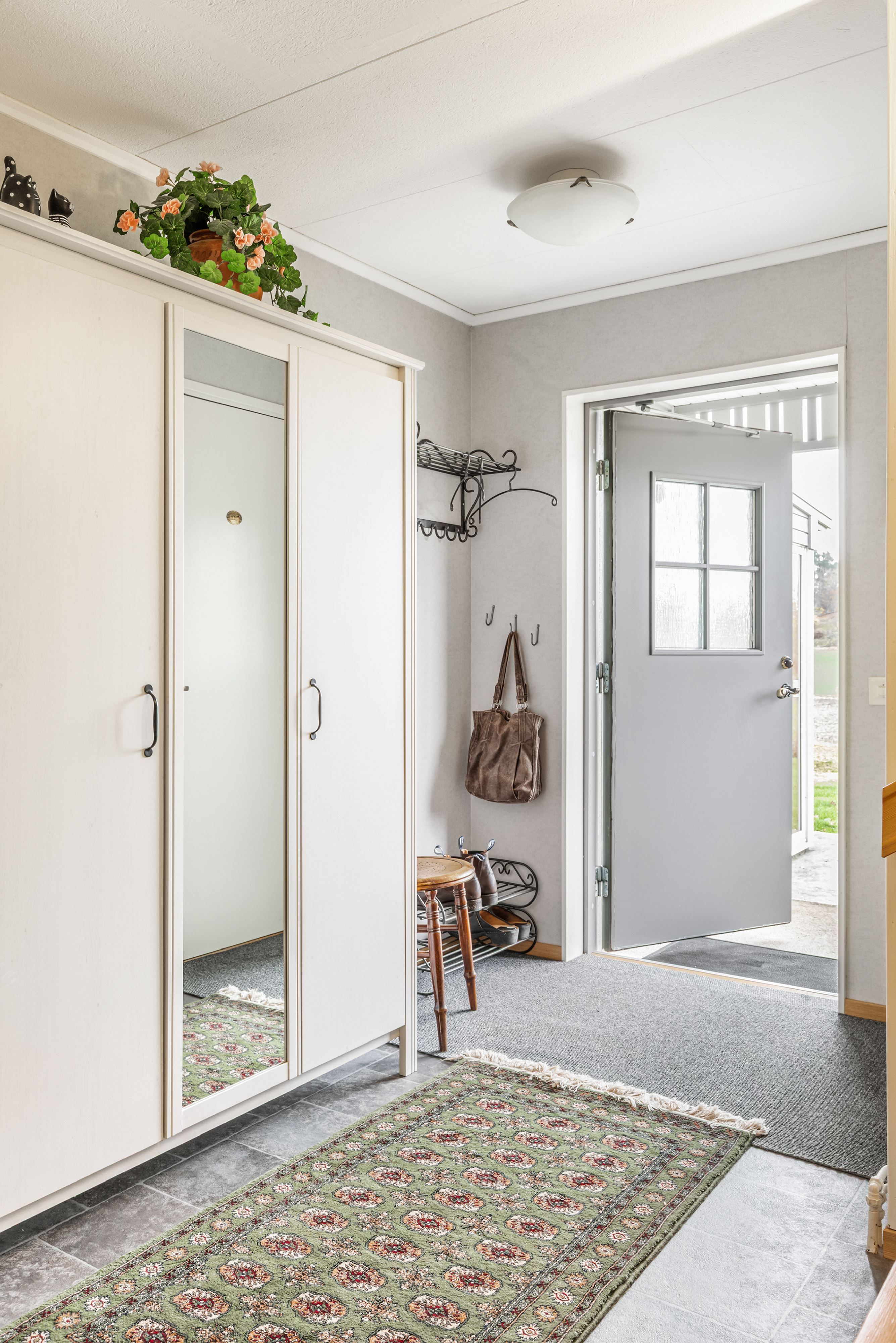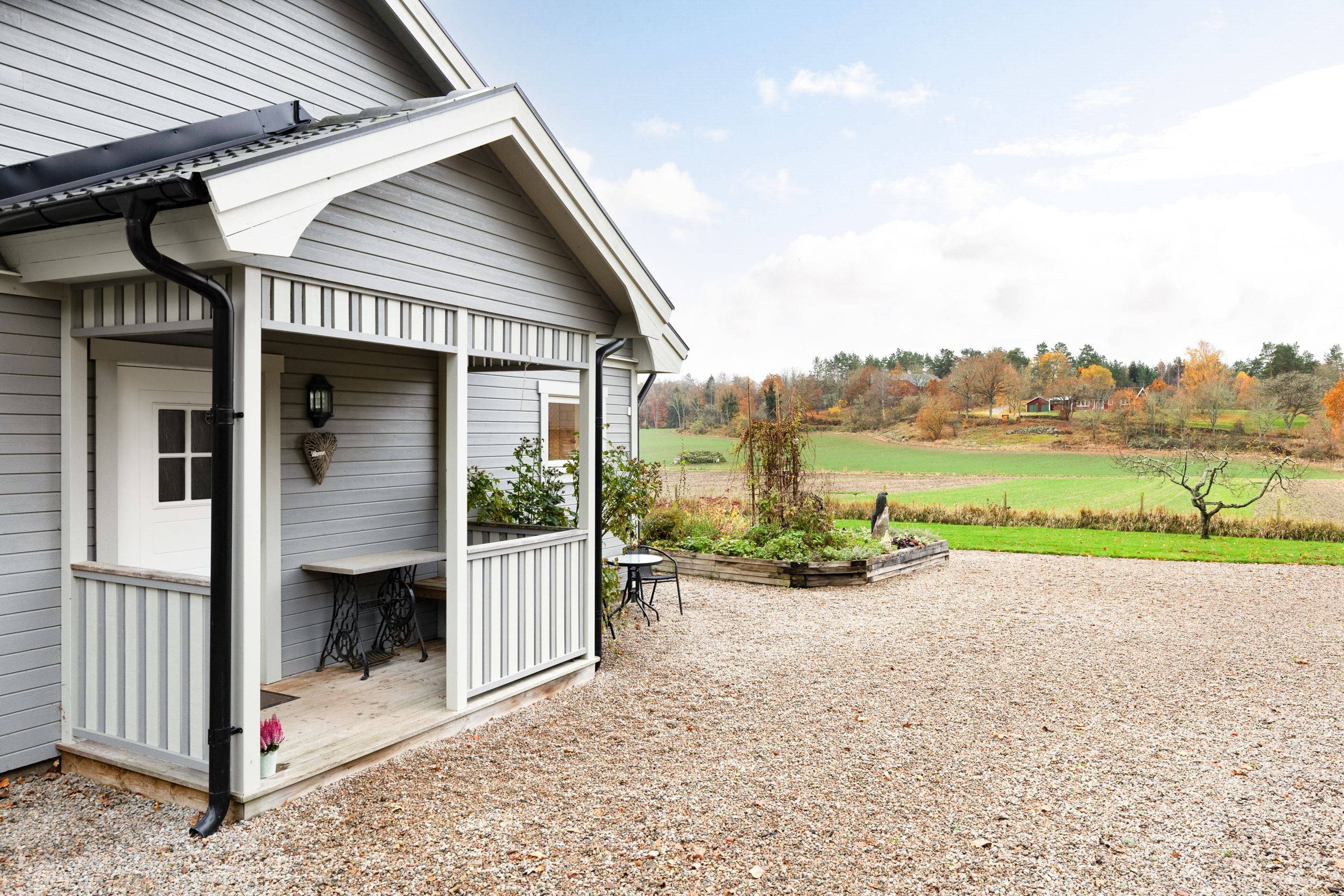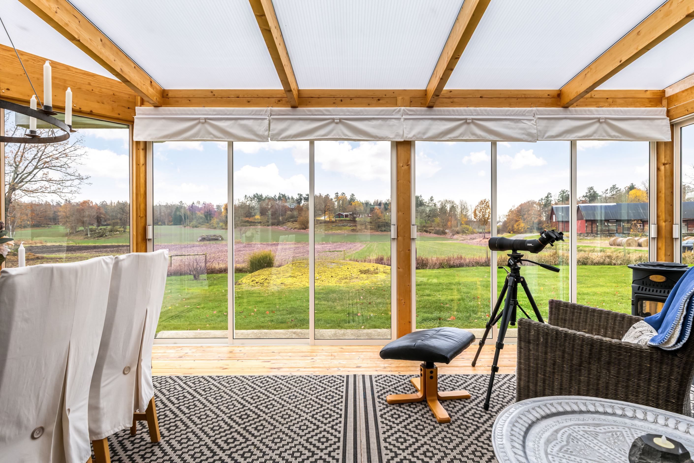 Från vardagsrummet når du det trevliga inglasade uterummet – en riktig pärla! Här sitter du skyddad från väder och vind men ändå nära naturen, med plats för både middagar, kaffestunder och sena sommarkvällar. Uterummet förlänger säsongen och blir snabbt en favoritplats för både vardag och fest.