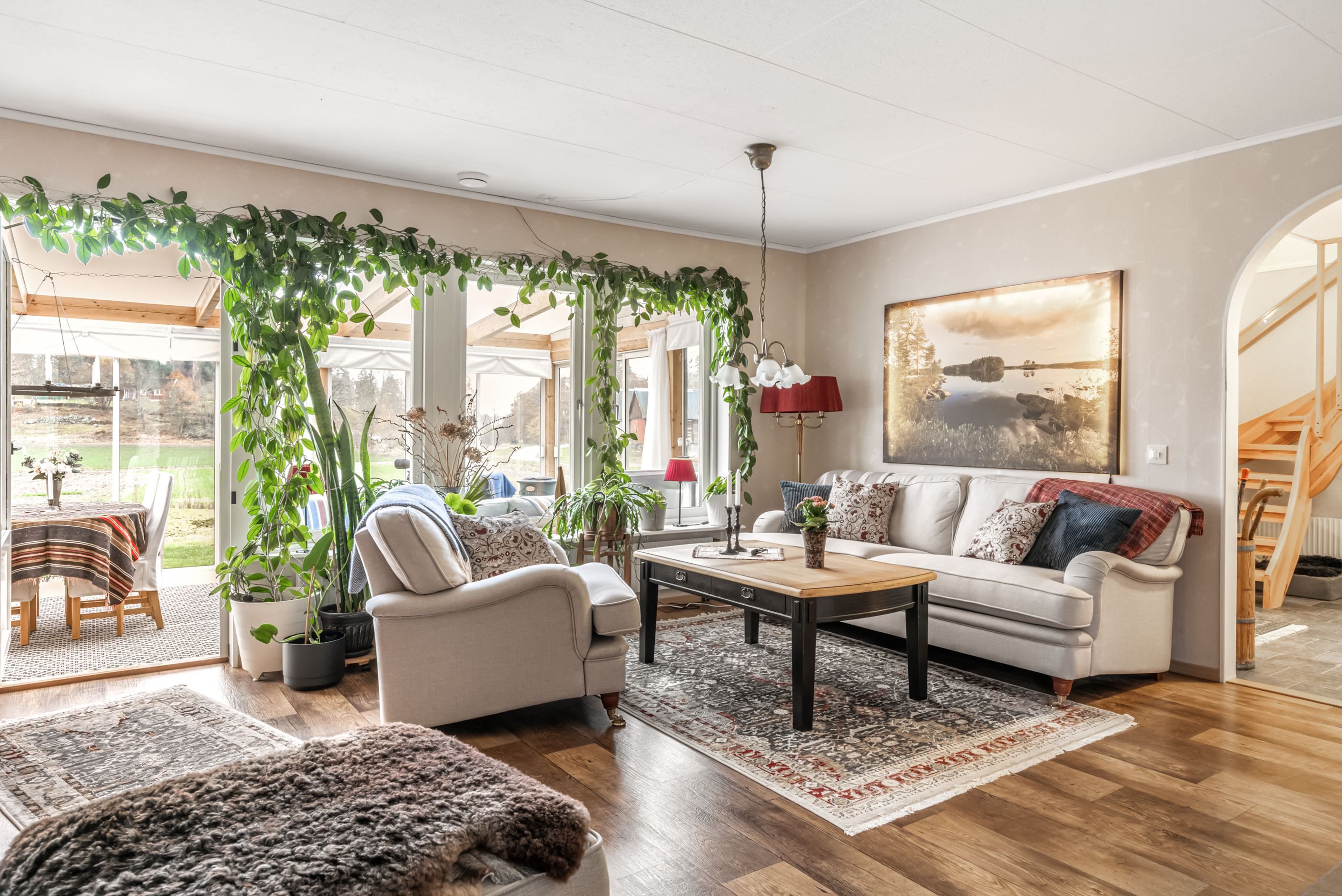 Redan när du svänger in på den grusade infarten möts du av en känsla av harmoni – ett hem där naturen omfamnar huset och där varje detalj är genomtänkt för att skapa en trivsam och bekväm vardag.