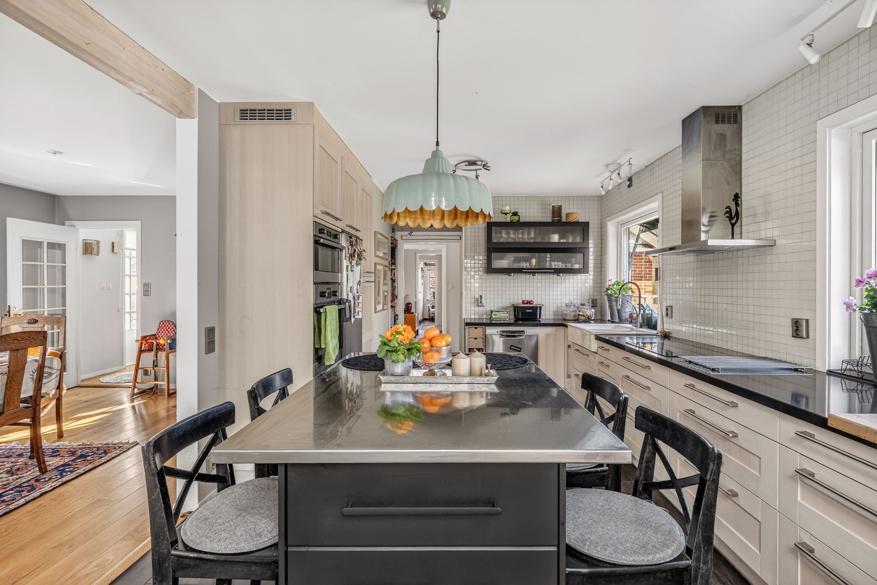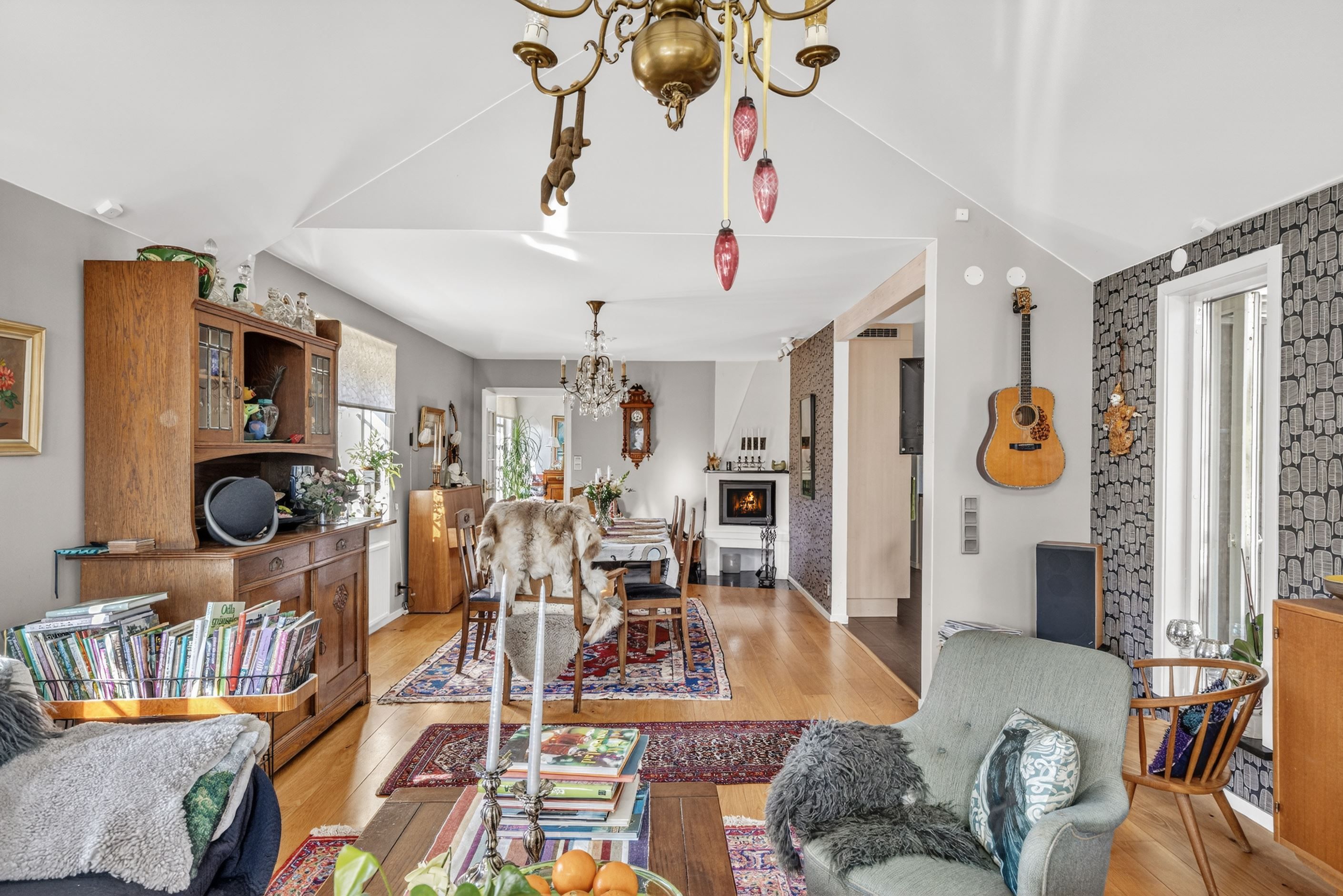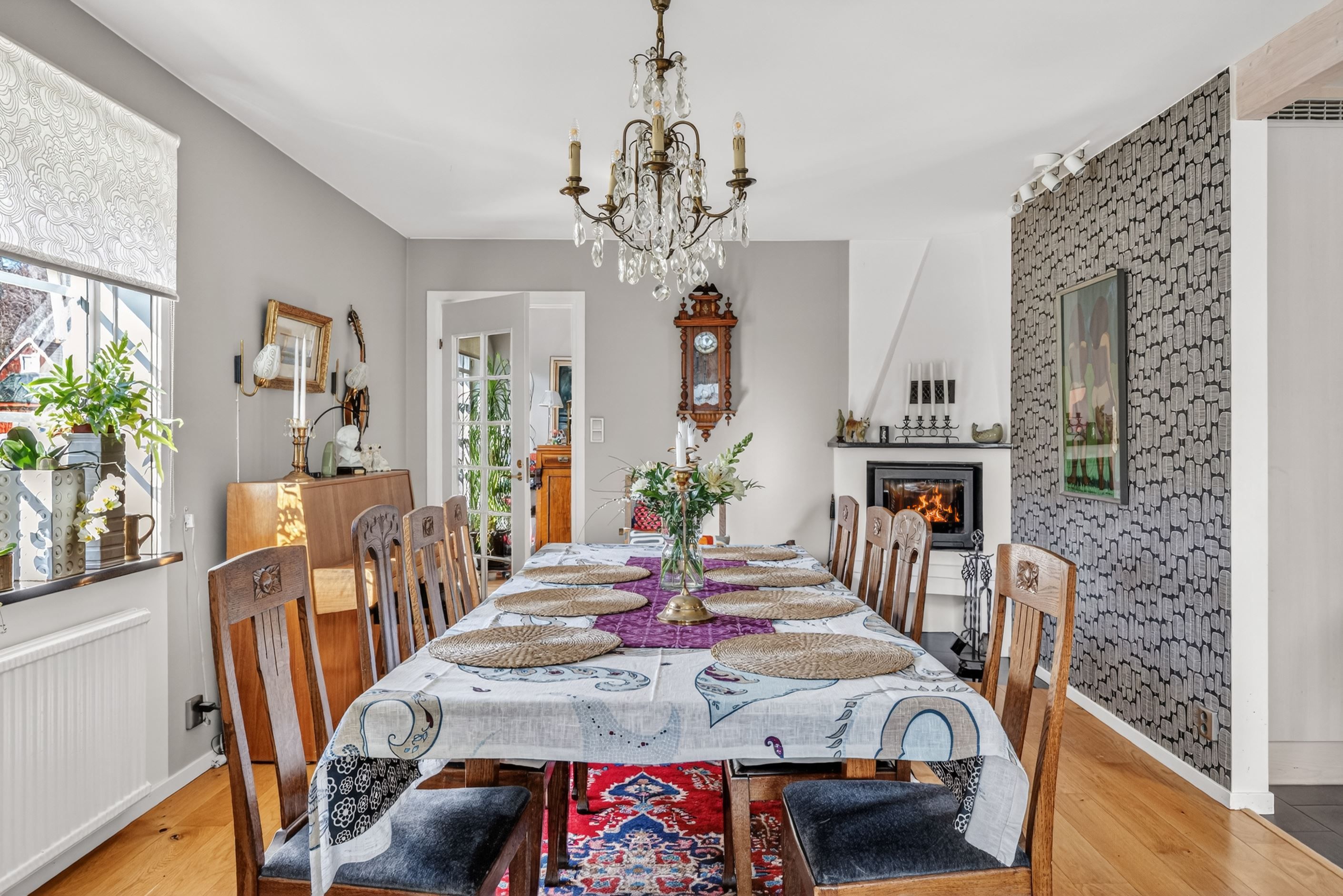 Här erbjuds ett imponerande hus om totalt 257 kvm, fördelat på två välplanerade våningar med generösa sällskapsytor och gott om plats för både familjeliv och sociala tillställningar. Entren finns via gaveln på källarplan. Uppför källartrappan nås vardagsrummet som är husets höjdpunkt, Redan vid första steget in möts du av ett stort vardagsrum med härlig rymd, högt i tak och en vacker öppen spis som skapar en varm och inbjudande atmosfär året om.
