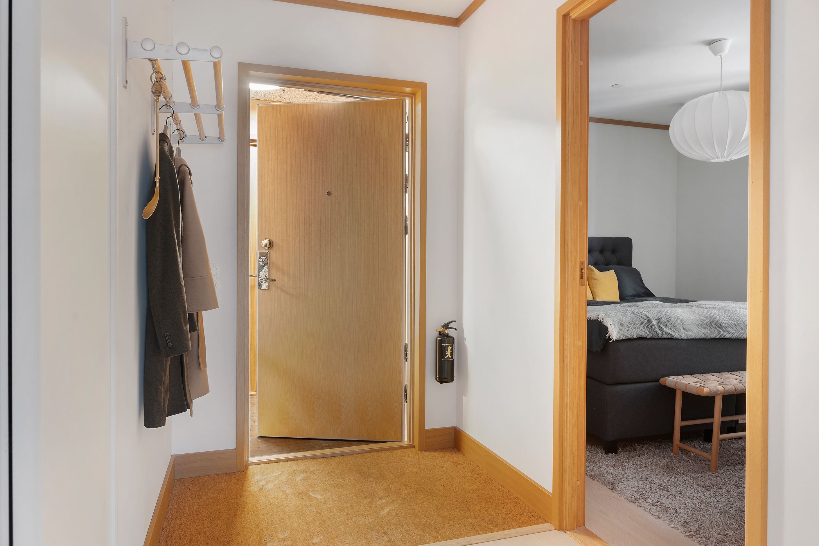 Materialvalen är noggrant utvalda för att skapa värme, komfort och exklusivitet. Enstavsparkett i ask sträcker sig genom hela bostaden och kompletteras av golvvärme som ger behaglig komfort. Dörrposter och fönsterfoder i ekfanér förstärker den eleganta och varma känslan, samtidigt som massivträhusets naturliga karaktär ger hemmet ett unikt och hållbart uttryck.