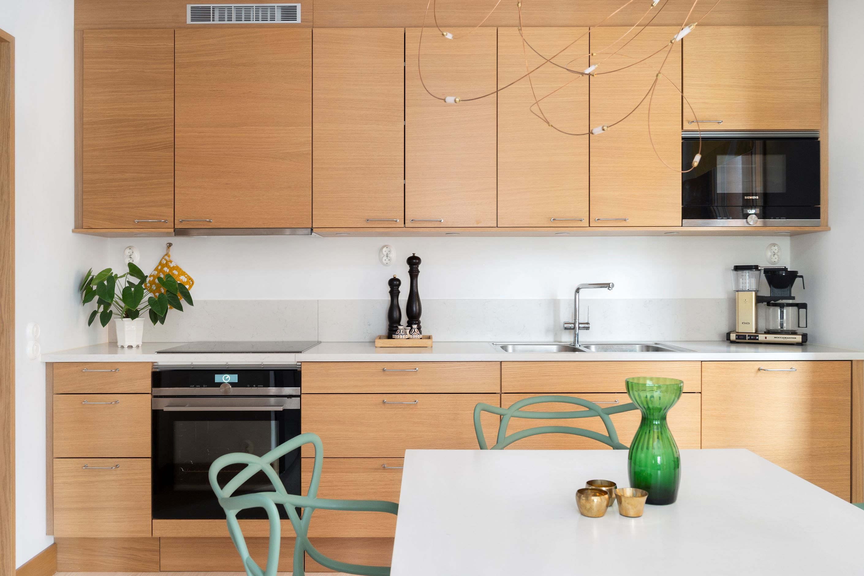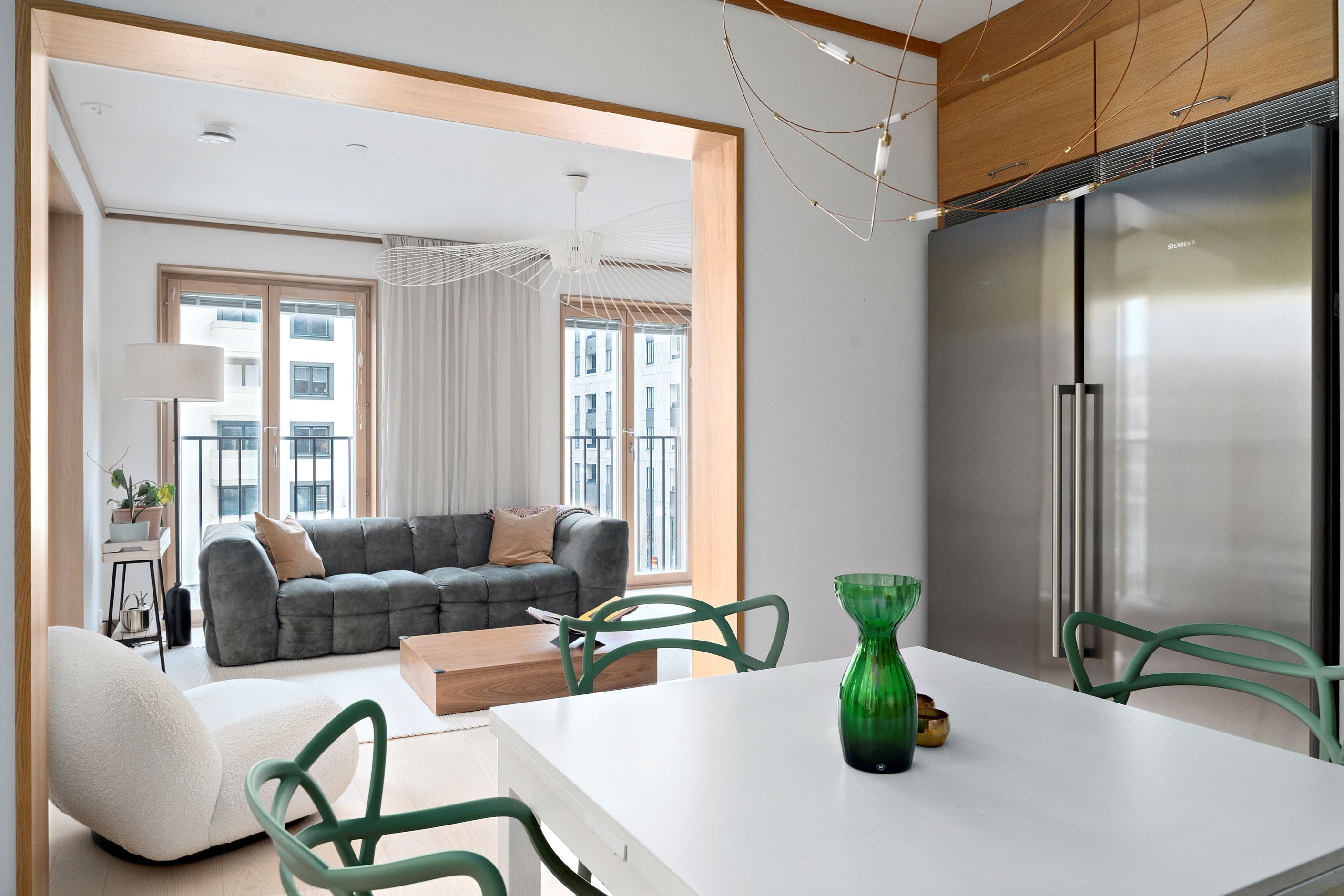 Lägenheten erbjuder ett luftigt vardagsrum med generöst ljusinsläpp under hela dagen tack vare hörnläget och det eftertraktade söderläget. Köket är öppet och stilfullt, med plats för matbord, elegant stenkompositbänkskiva och energieffektiva vitvaror från Siemens – perfekt integrerade för en ren och modern känsla. Två rymliga sovrum, ett stilrent badrum med både tvätt- och torkmaskin samt generösa förvaringsmöjligheter fulländar bostaden.