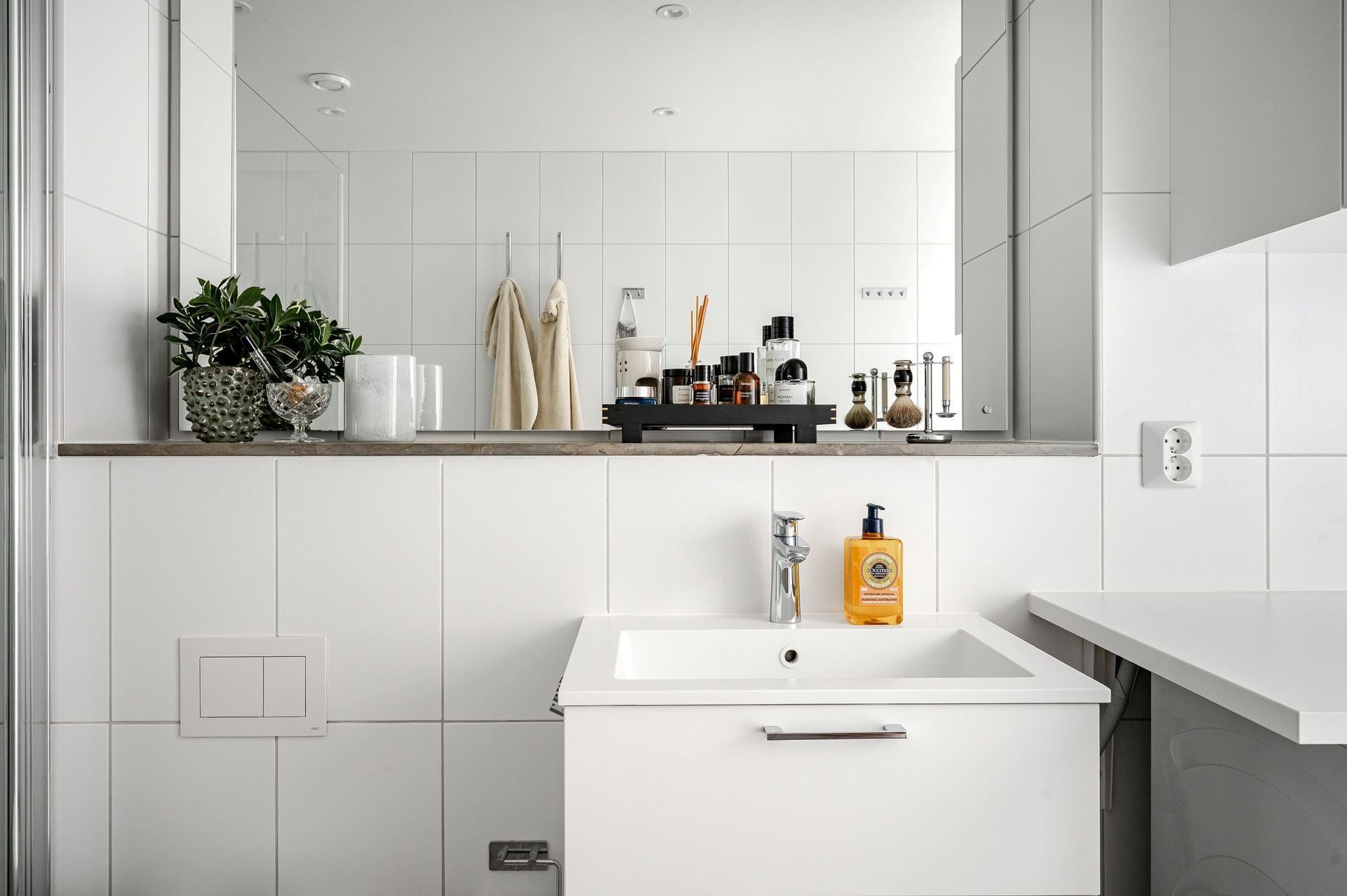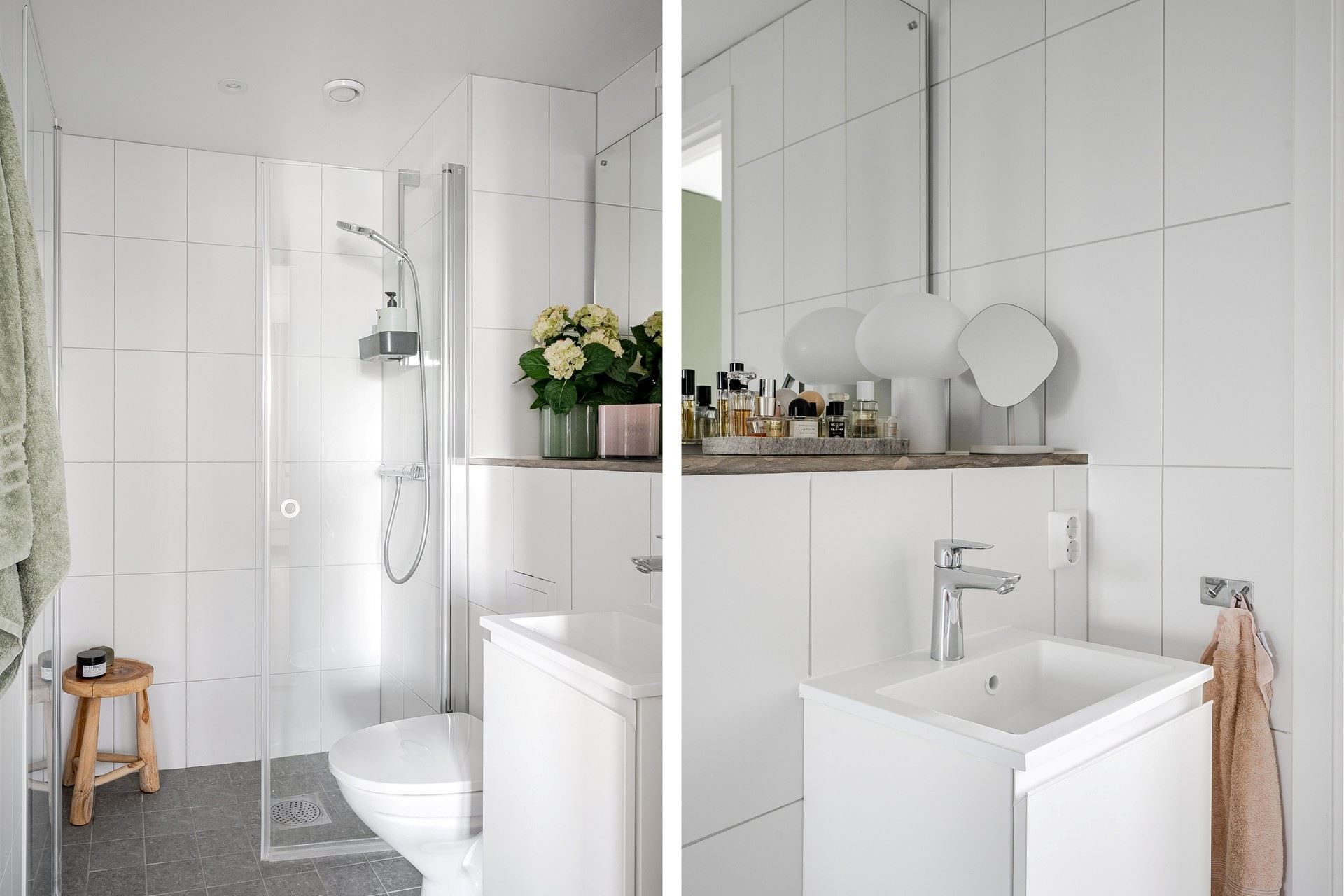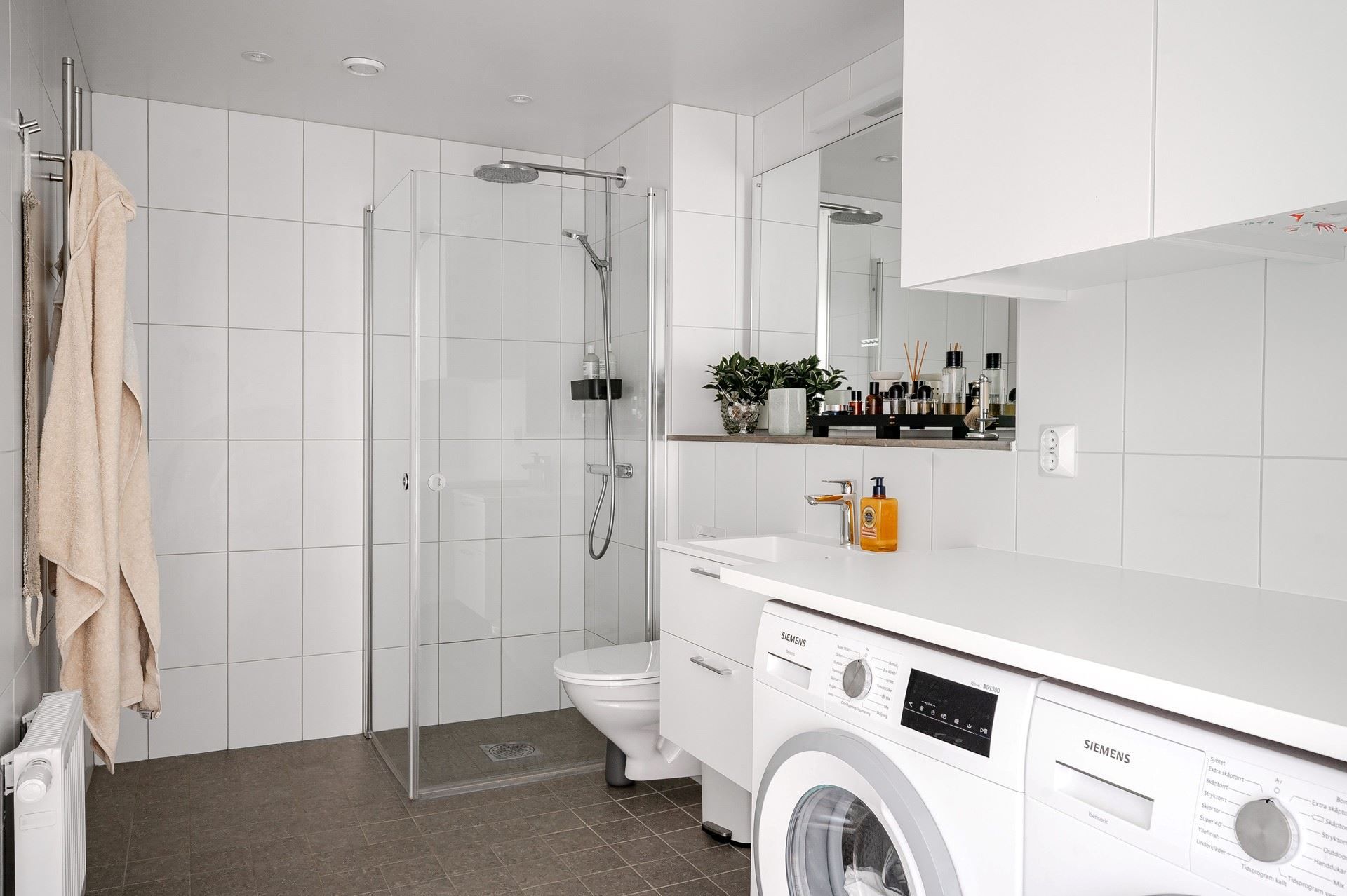 Bostaden erbjuder två rymliga badrum, varav det ena är ett privat en suite-badrum i anslutning till master bedroom. Här finns även en välplanerad walk-in closet med platsbyggd, stilren förvaring och direktaccess från sovrummet – en detalj som adderar både komfort och hotellkänsla.