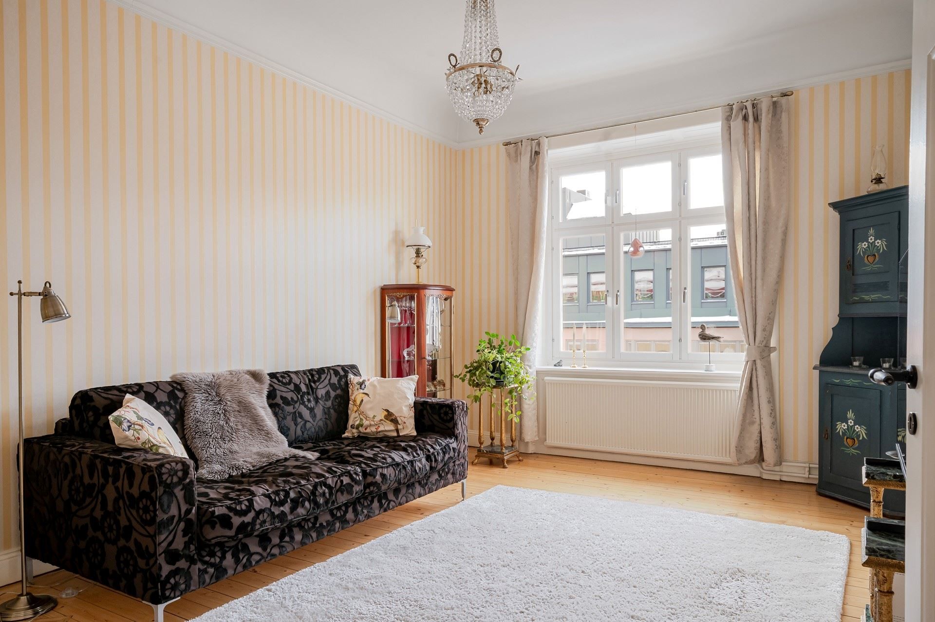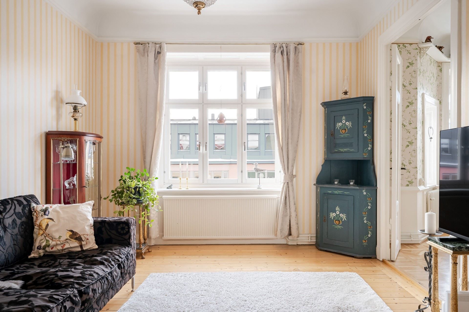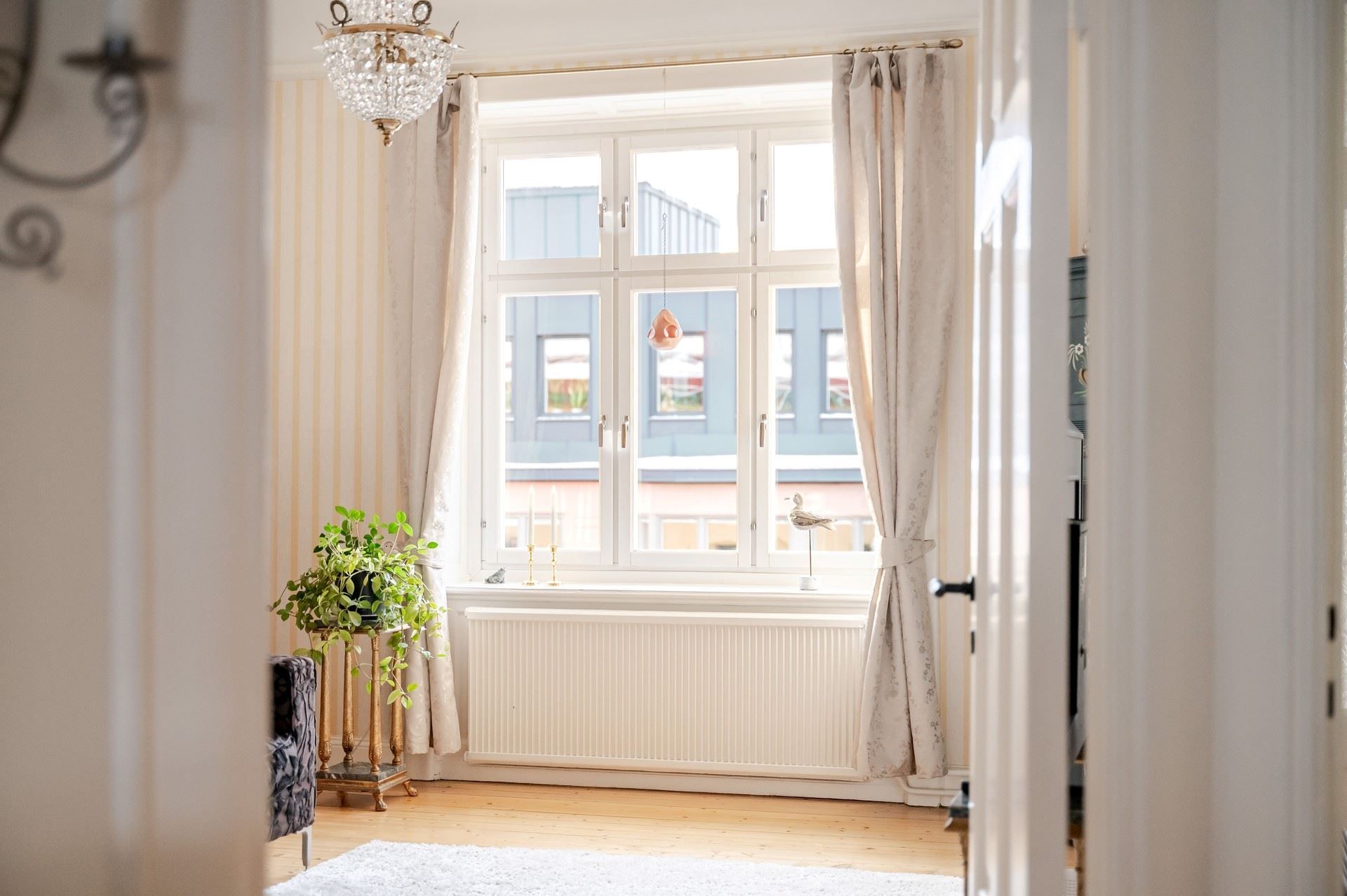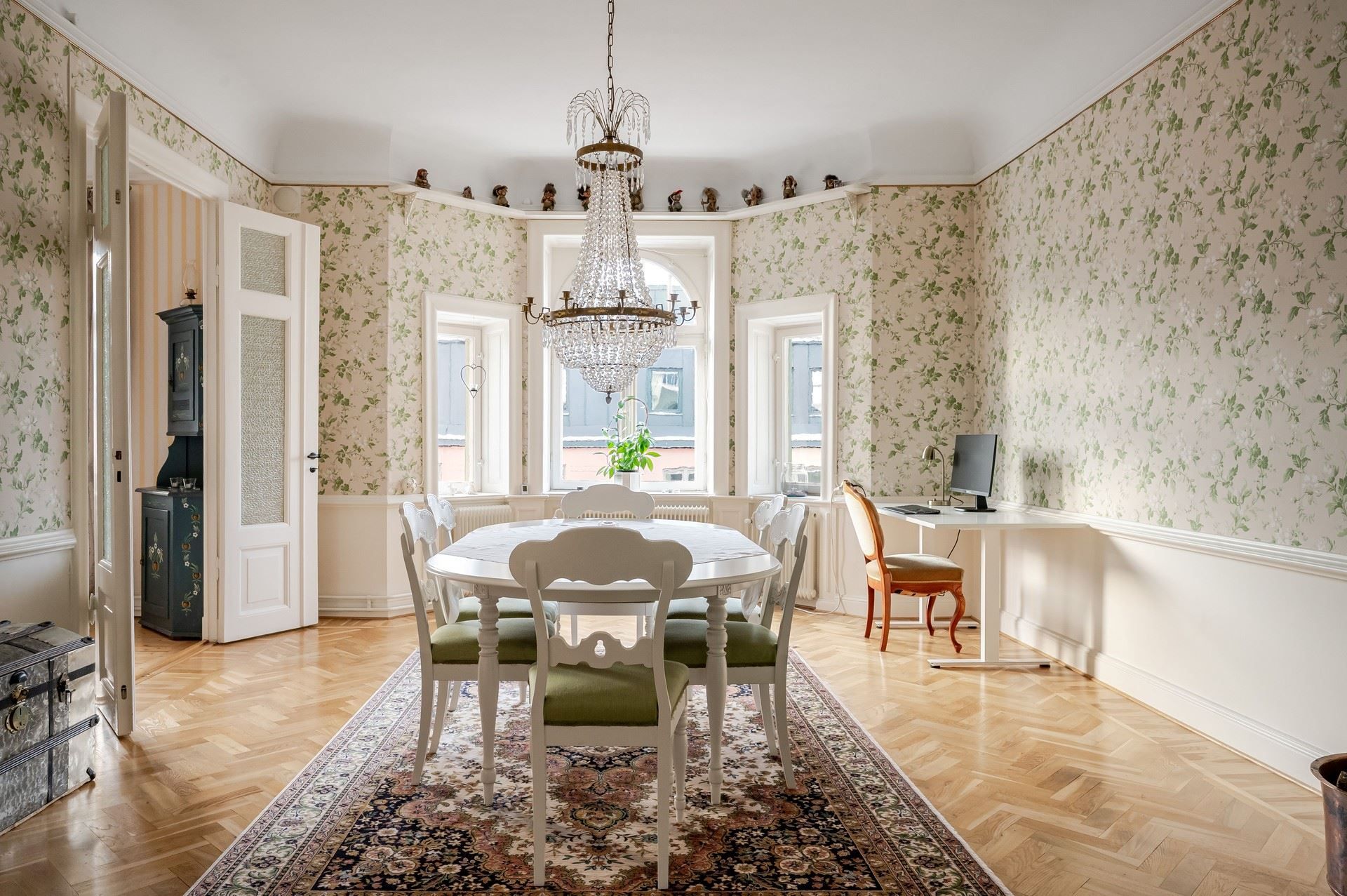Det eleganta burspråket erbjuder en självklar plats för långa middagar och blir hemmets naturliga blickfång. Bostaden är genomgående smakfull och harmonisk – ett hem som verkligen måste upplevas på plats.