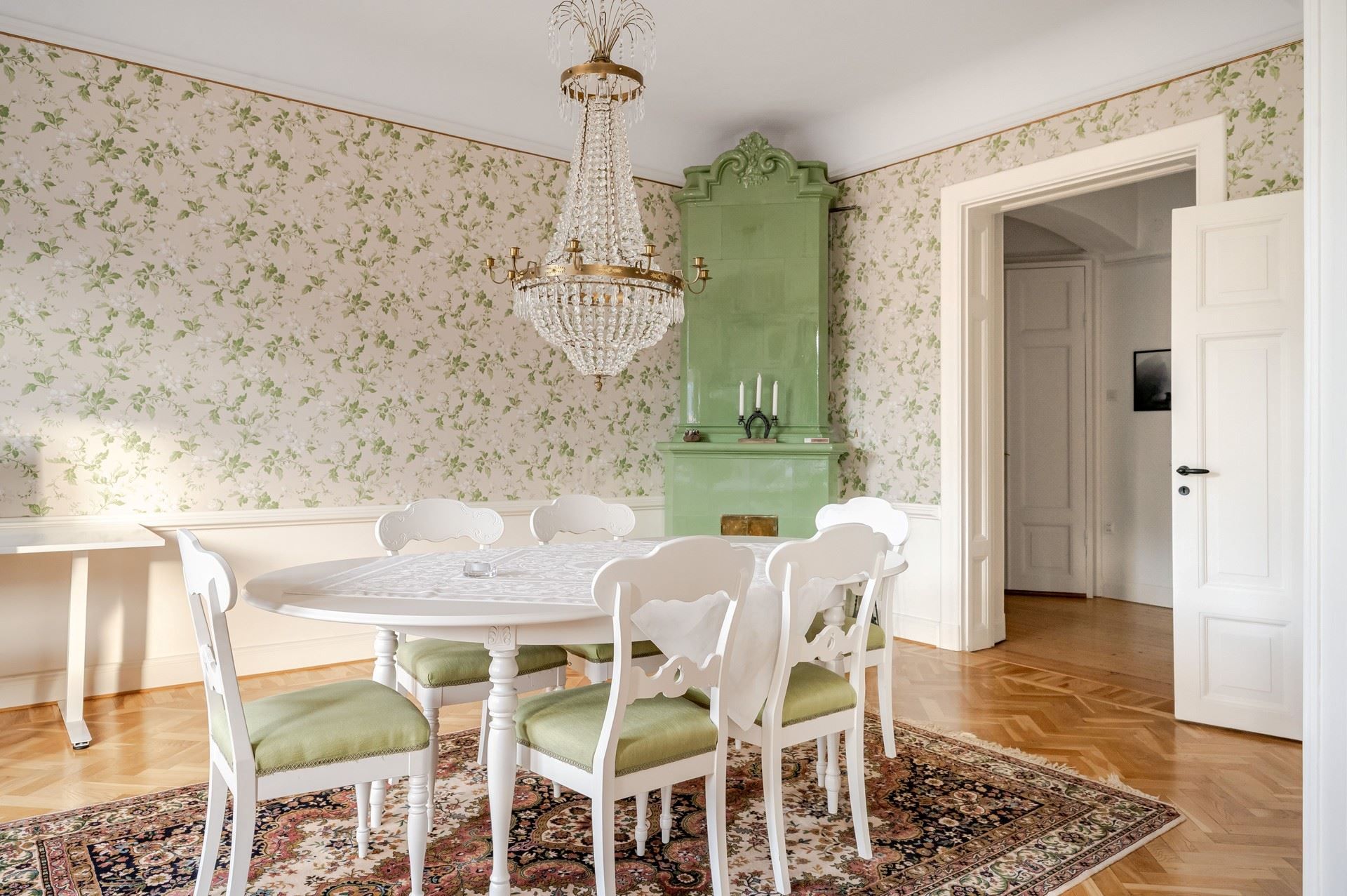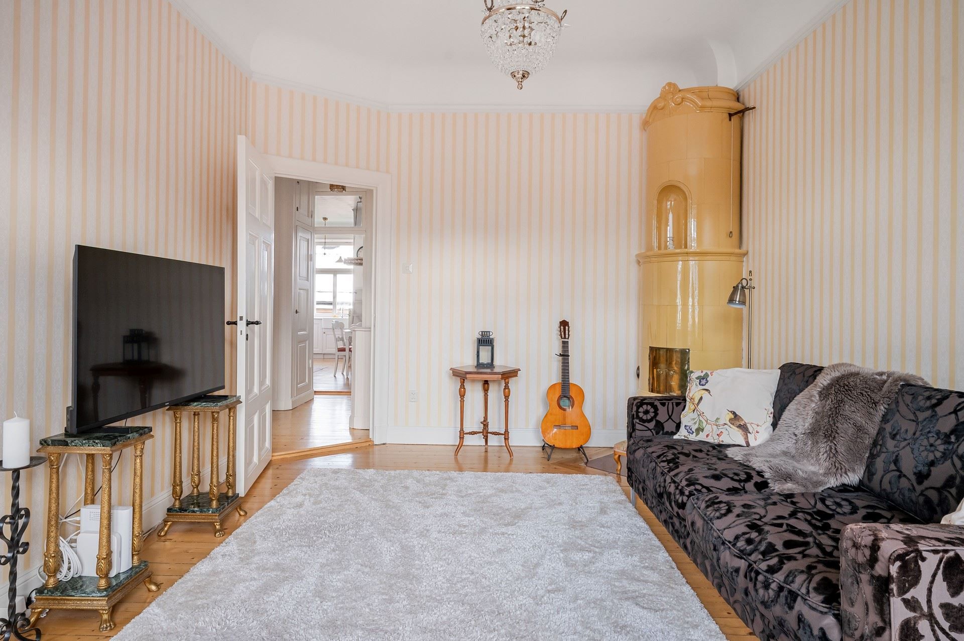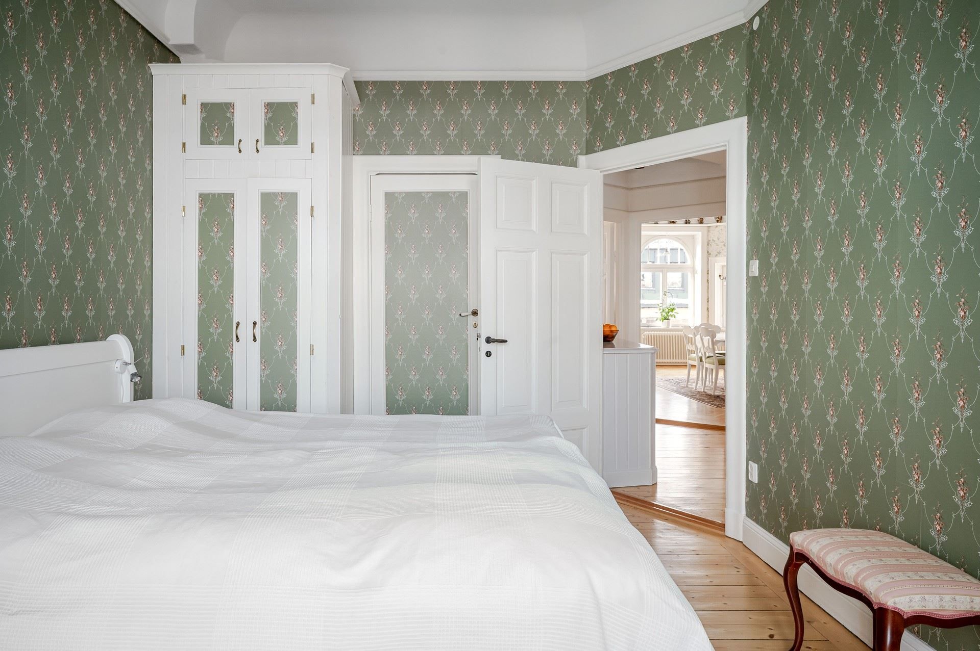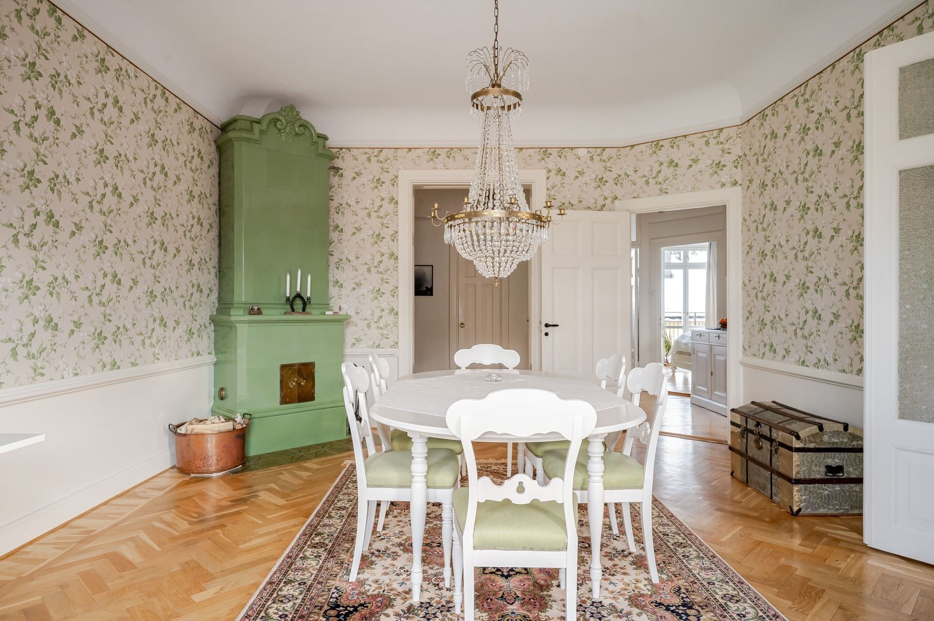 Det eleganta burspråket erbjuder en självklar plats för långa middagar och blir hemmets naturliga blickfång. Bostaden är genomgående smakfull och harmonisk – ett hem som verkligen måste upplevas på plats.
